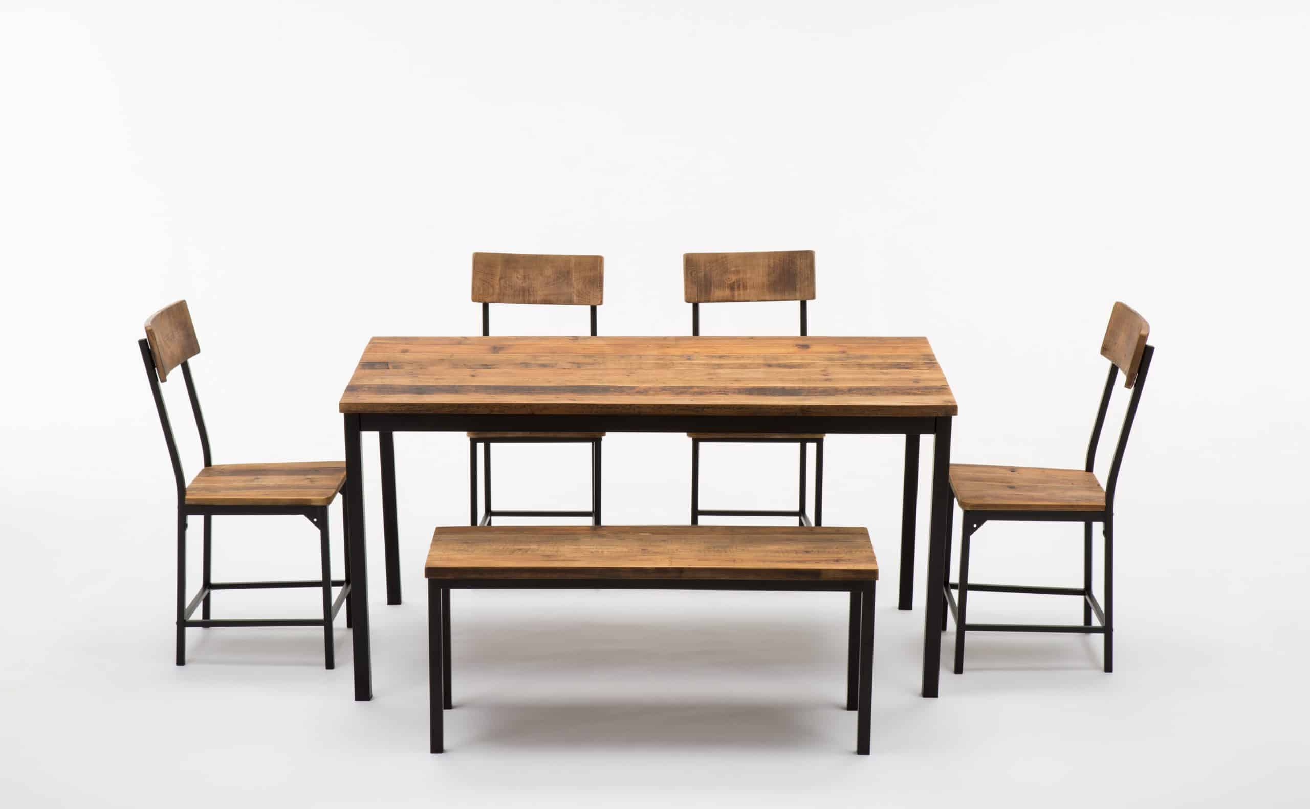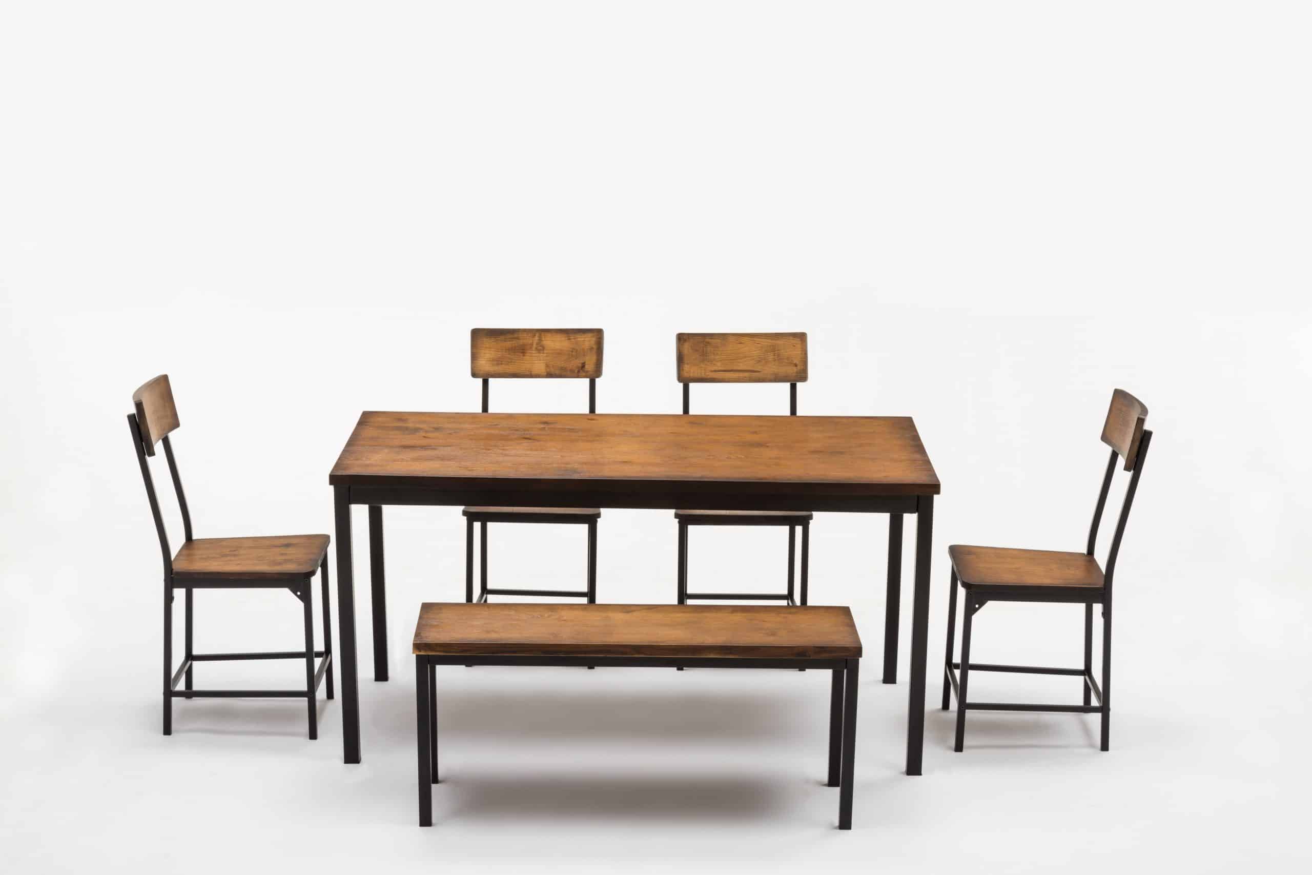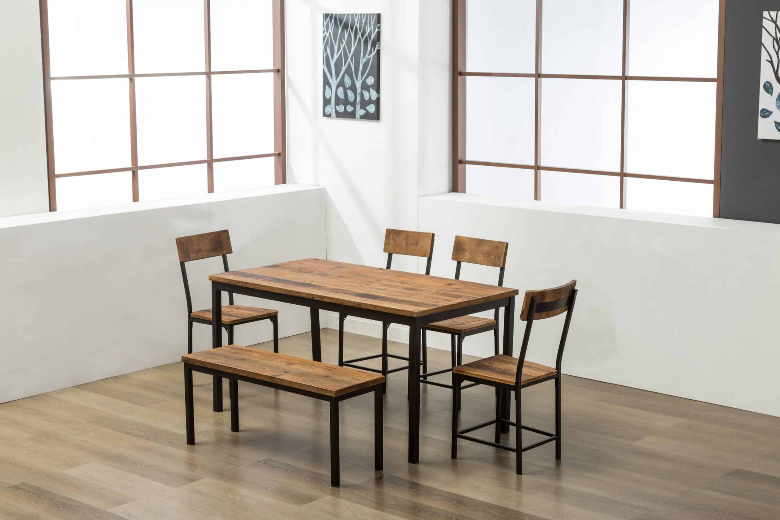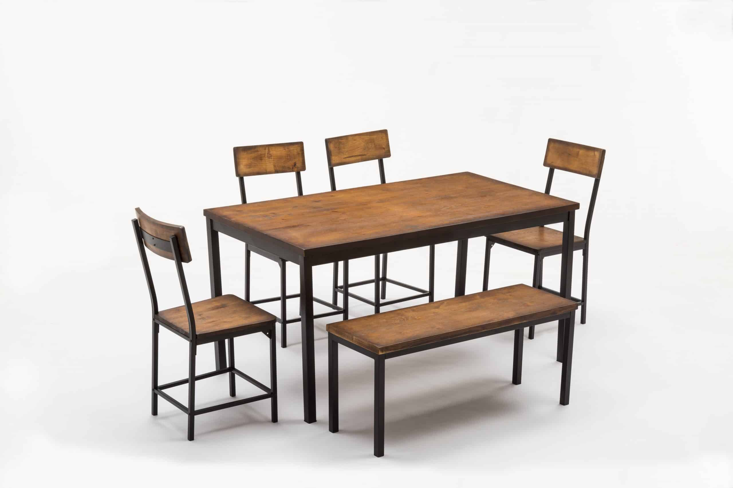 - Set comes with dining table, bench, and four dining chairs