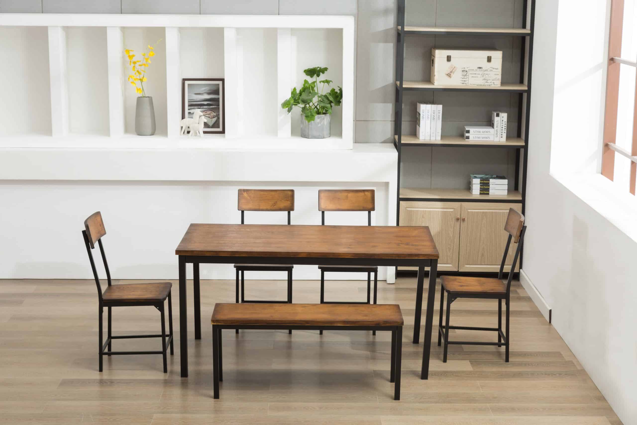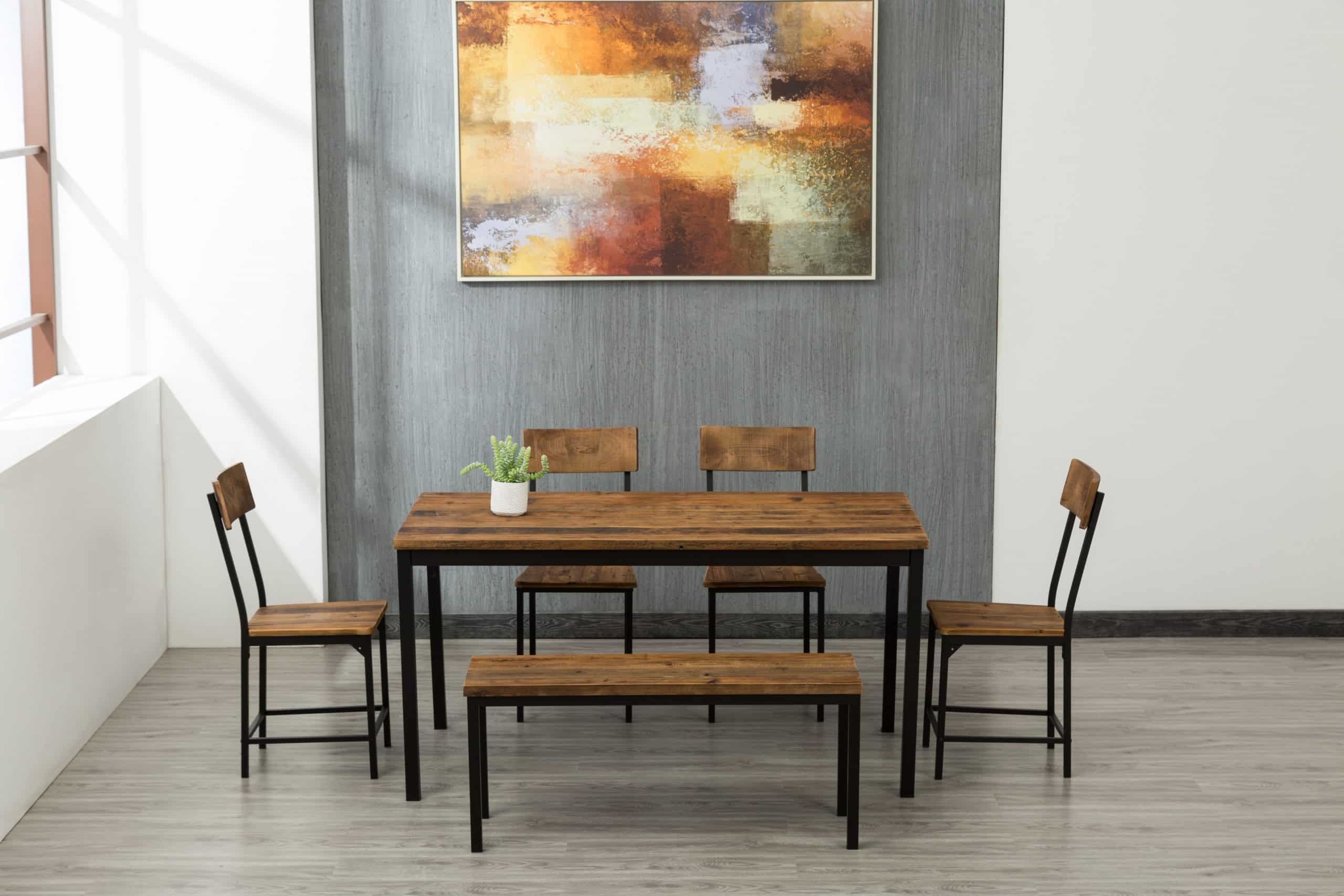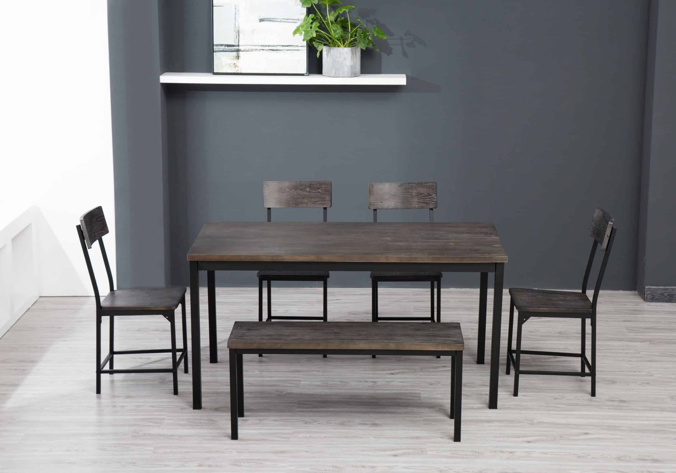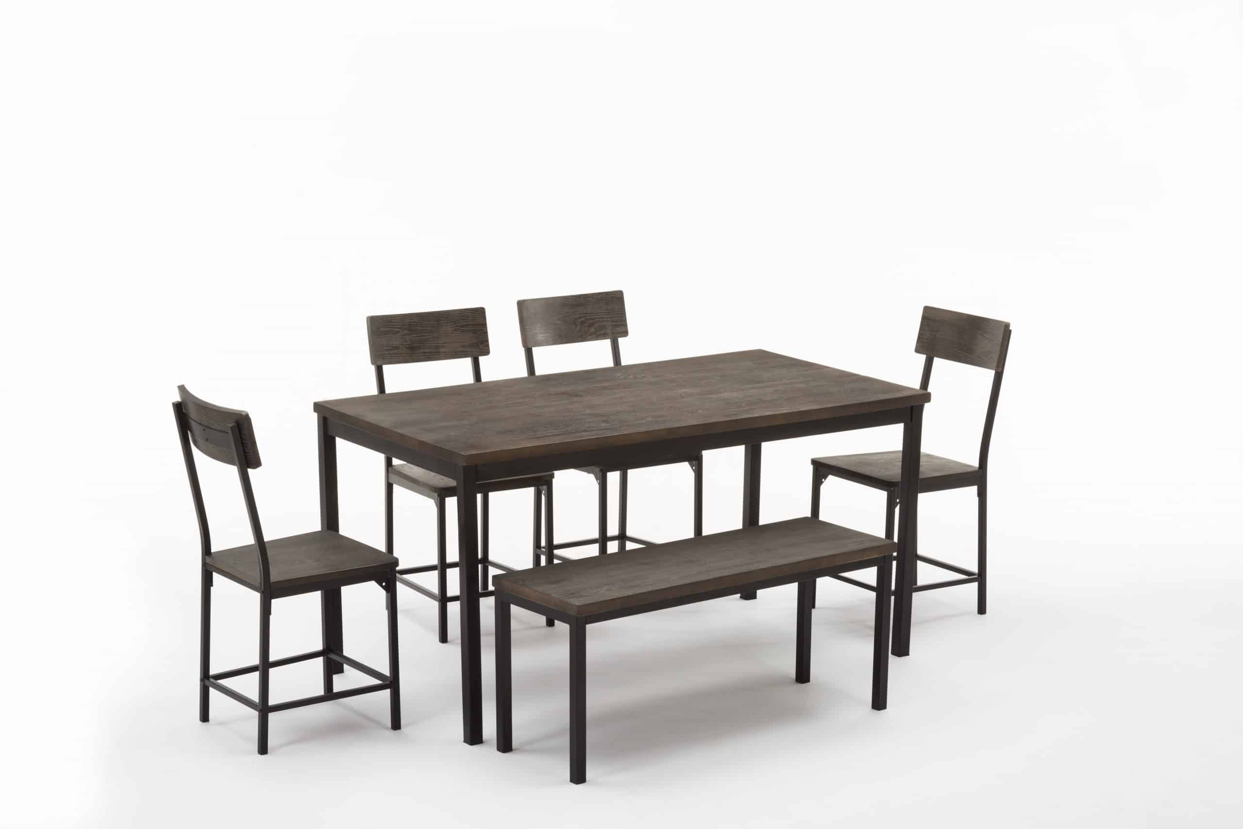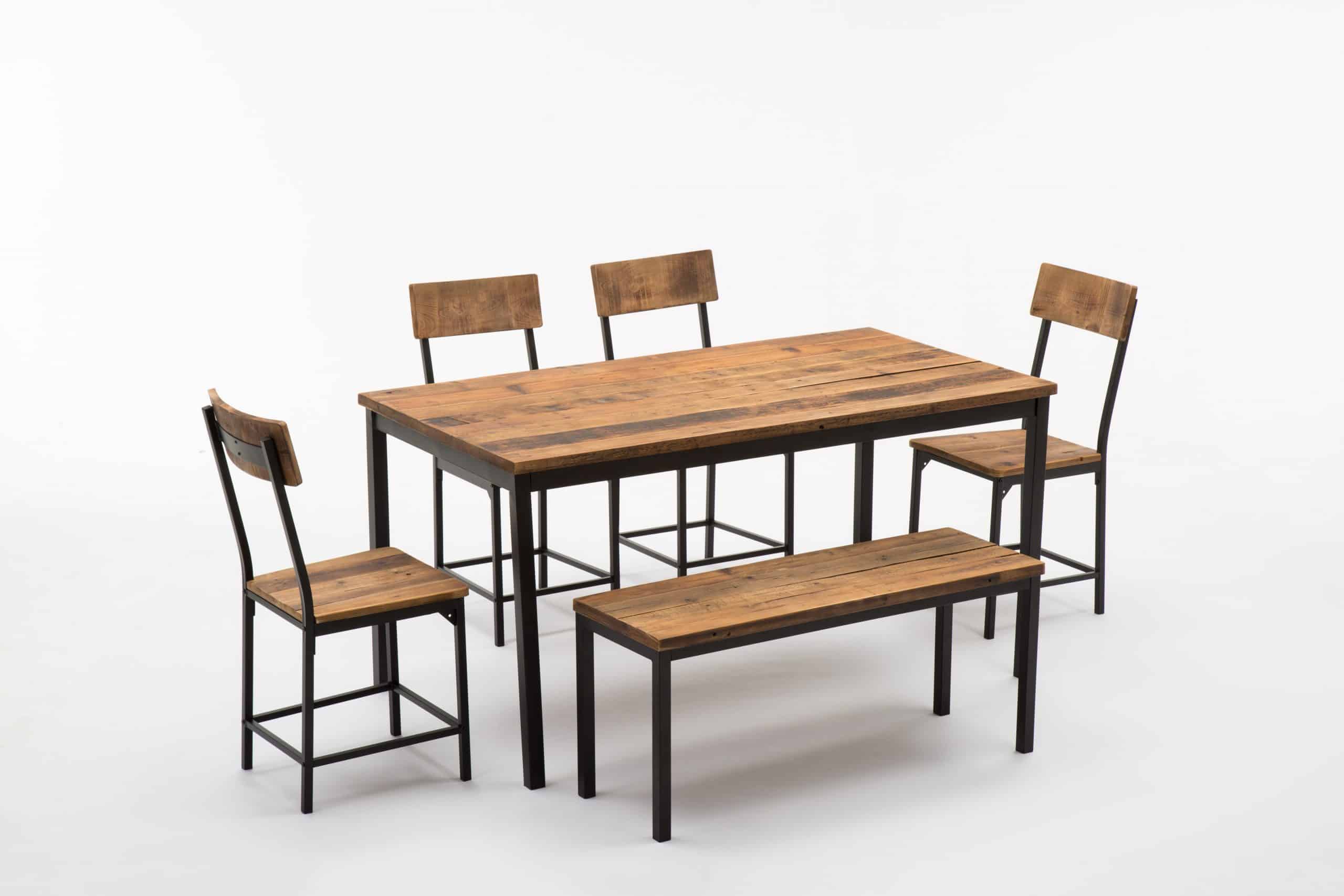 - Set comes with dining table, bench, and four dining chairs