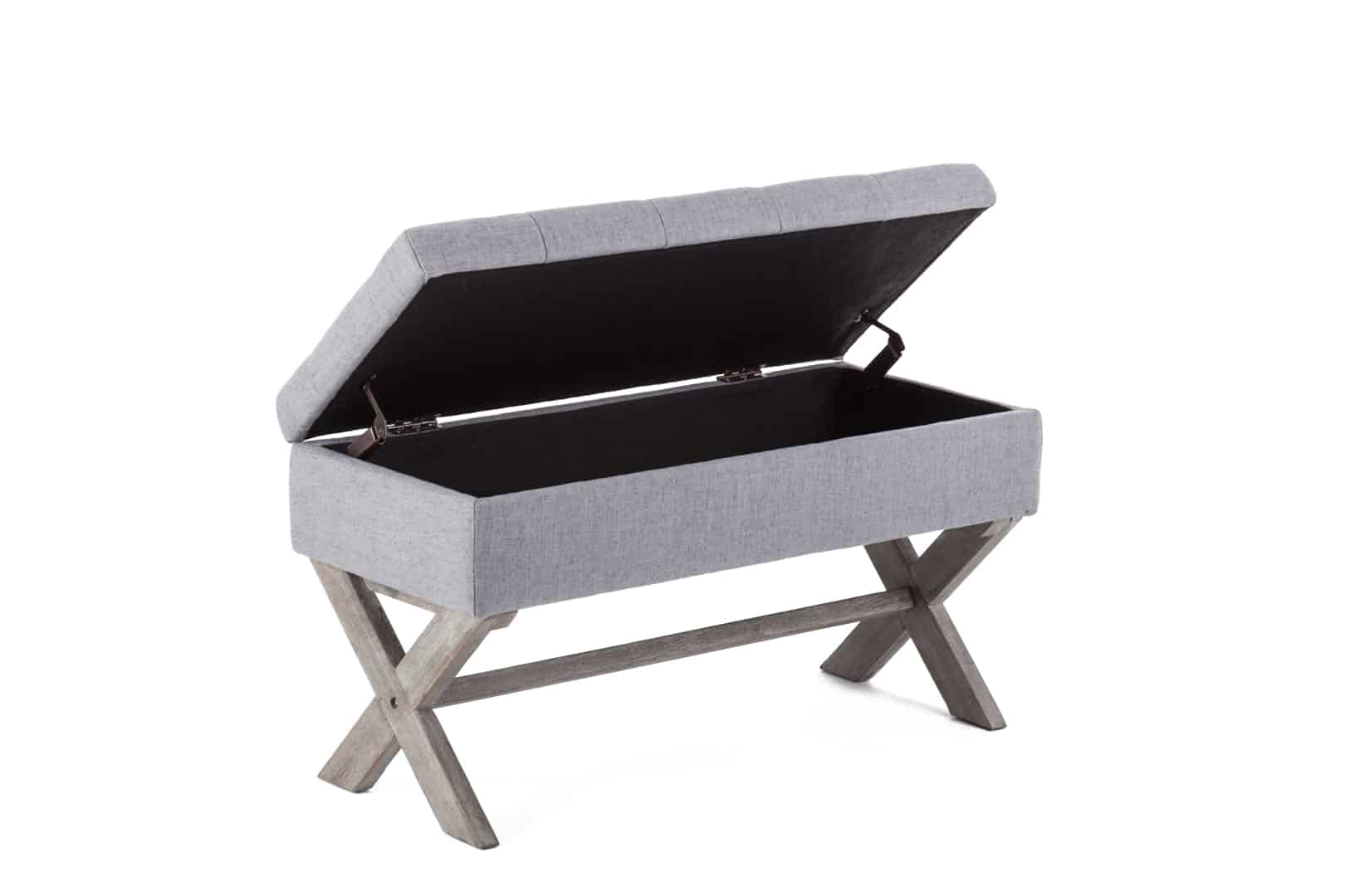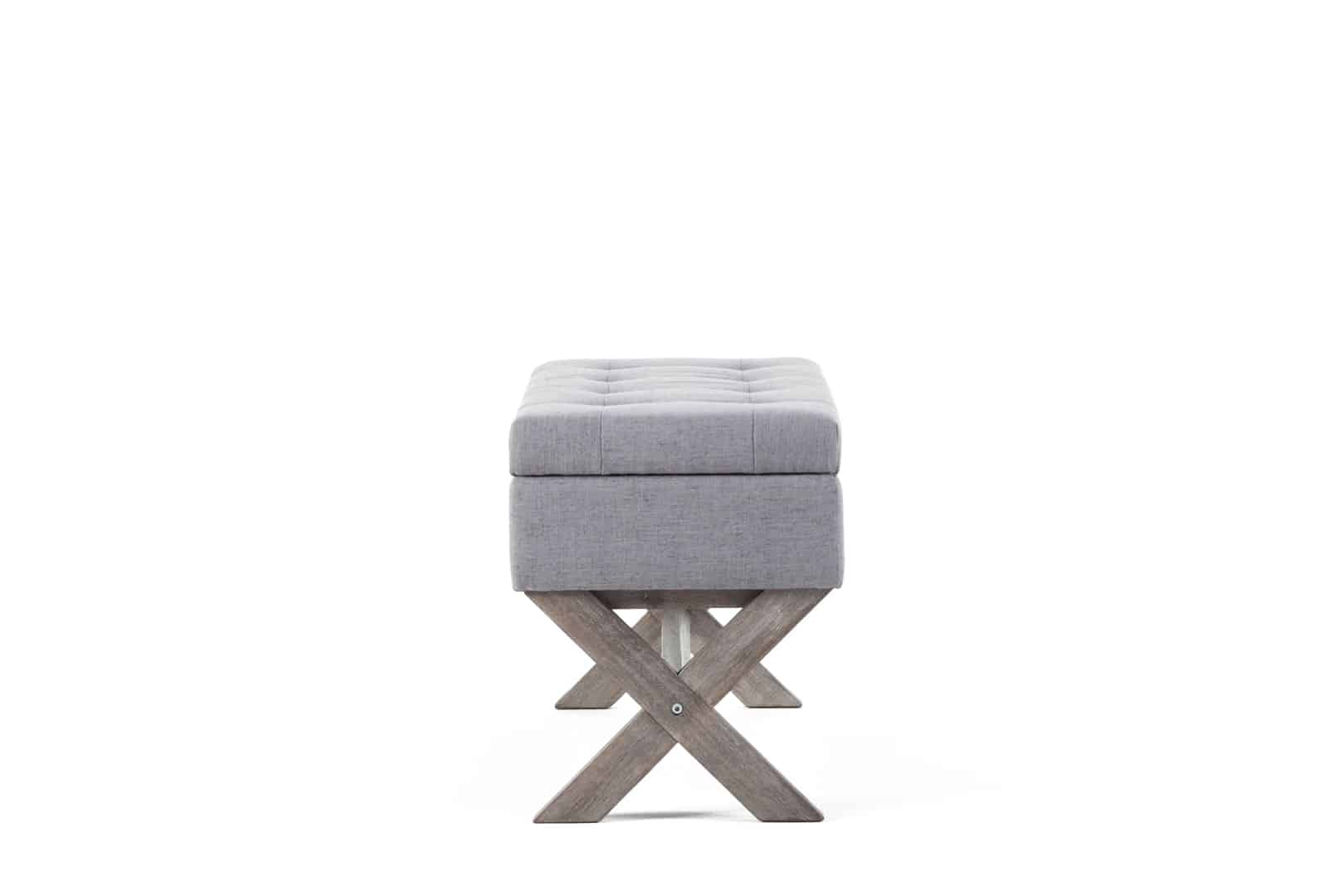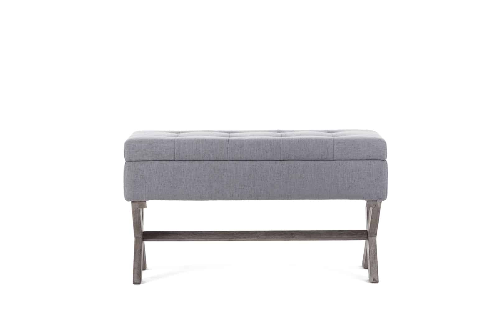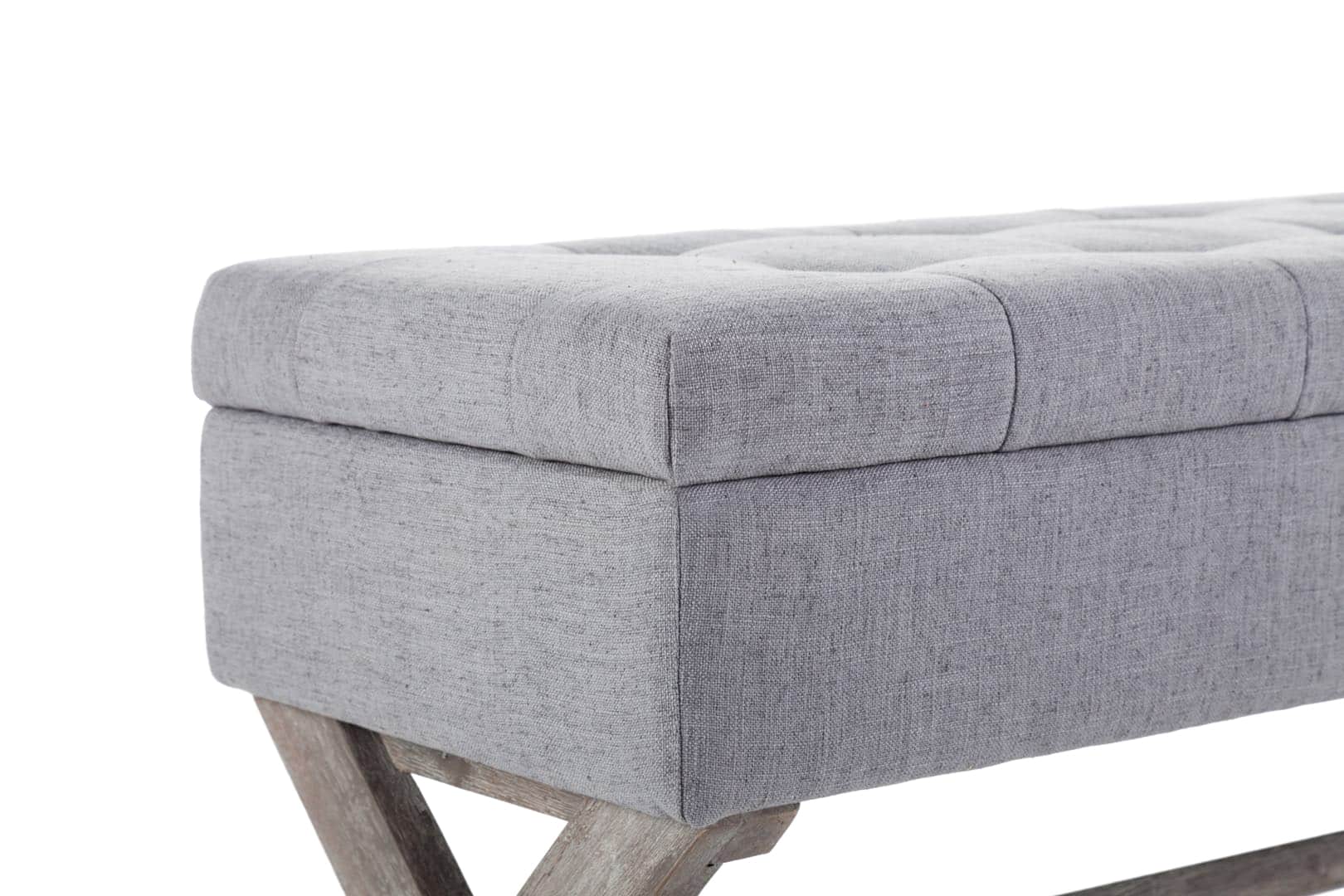 An attractive storage and seating solution, the Angelina Storage Bench immediately adds sophistication to any space. The base of the storage bench is enhanced with cross rubberwood legs for added strength and stability. The Angelina storage bench is designed with a safety hinge that allows you to put in or take out items without suddenly closing. Place this contemporary button-tufted storage bench at the foot of your bed, in an entryway, or along a living room wall to store spare blankets, extra sweaters, or other odds and ends.
