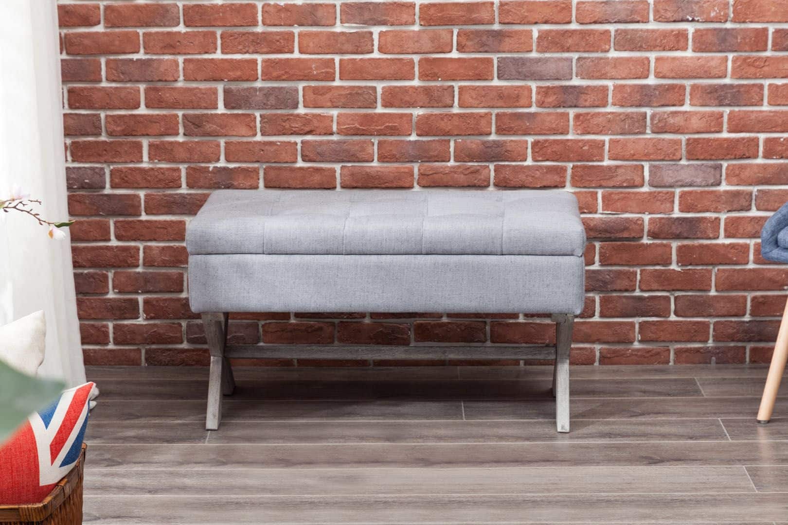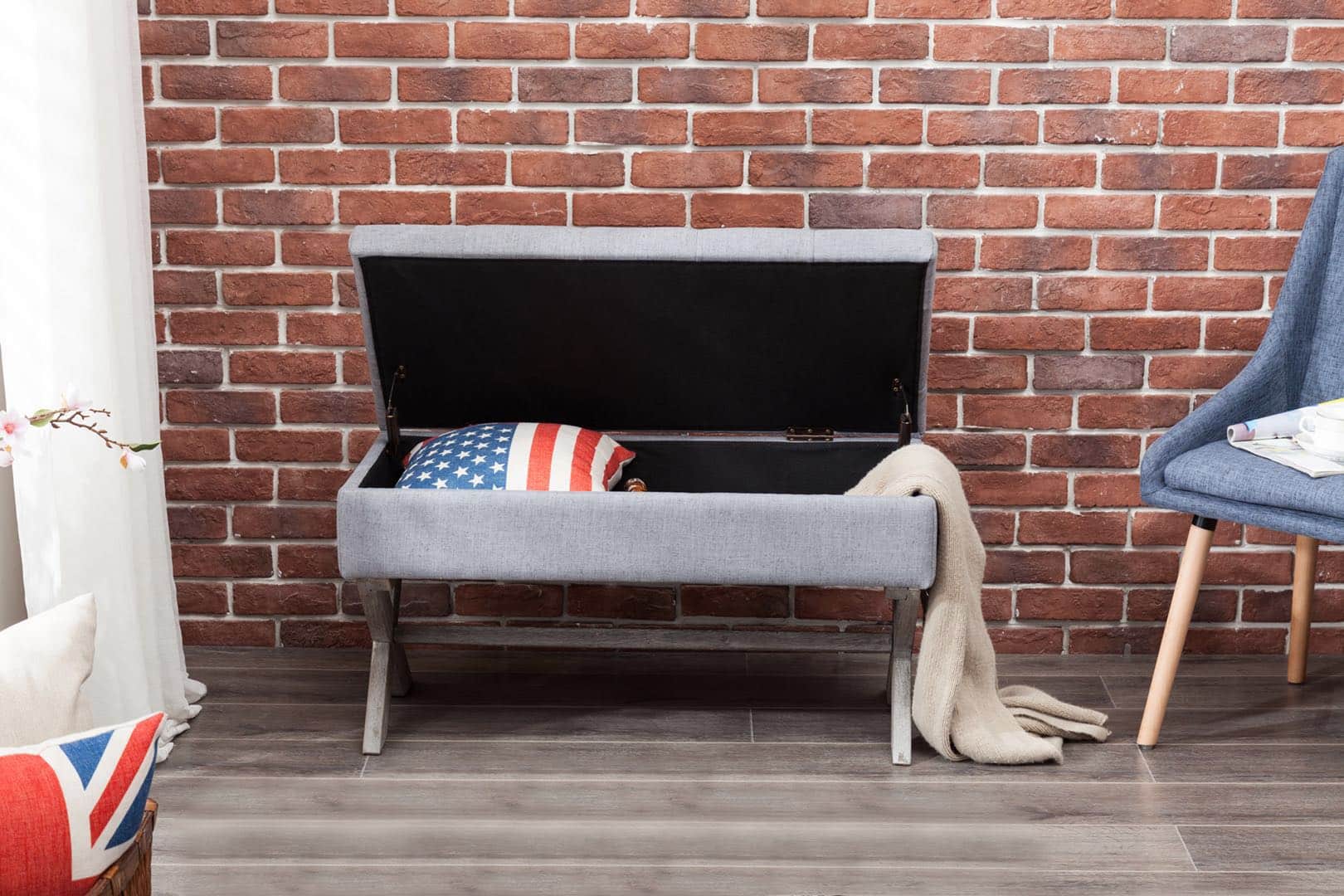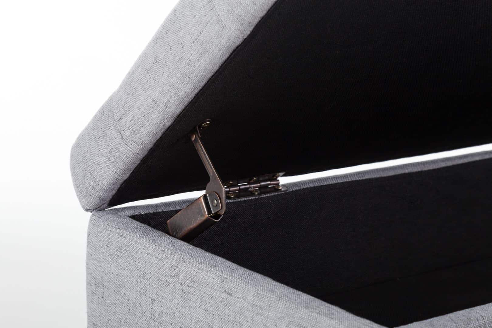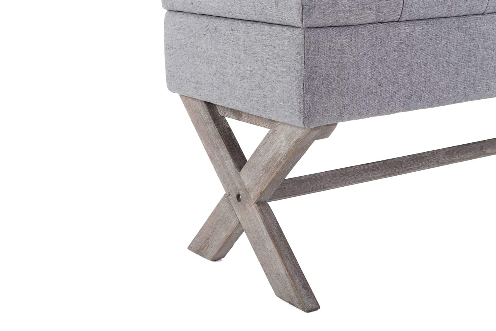 An attractive storage and seating solution, the Angelina Storage Bench immediately adds sophistication to any space. The base of the storage bench is enhanced with cross rubberwood legs for added strength and stability. The Angelina storage bench is designed with a safety hinge that allows you to put in or take out items without suddenly closing. Place this contemporary button-tufted storage bench at the foot of your bed, in an entryway, or along a living room wall to store spare blankets, extra sweaters, or other odds and ends.