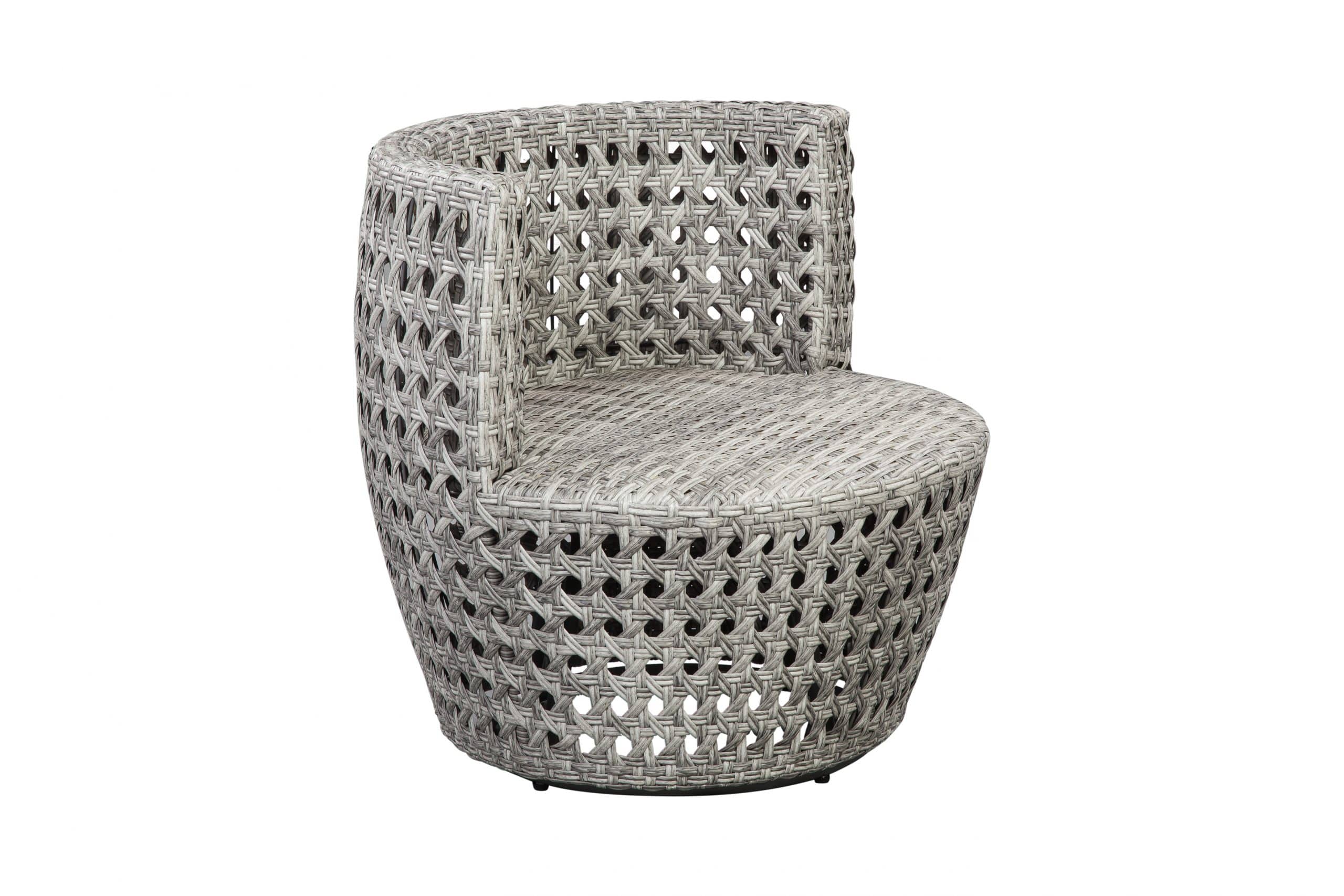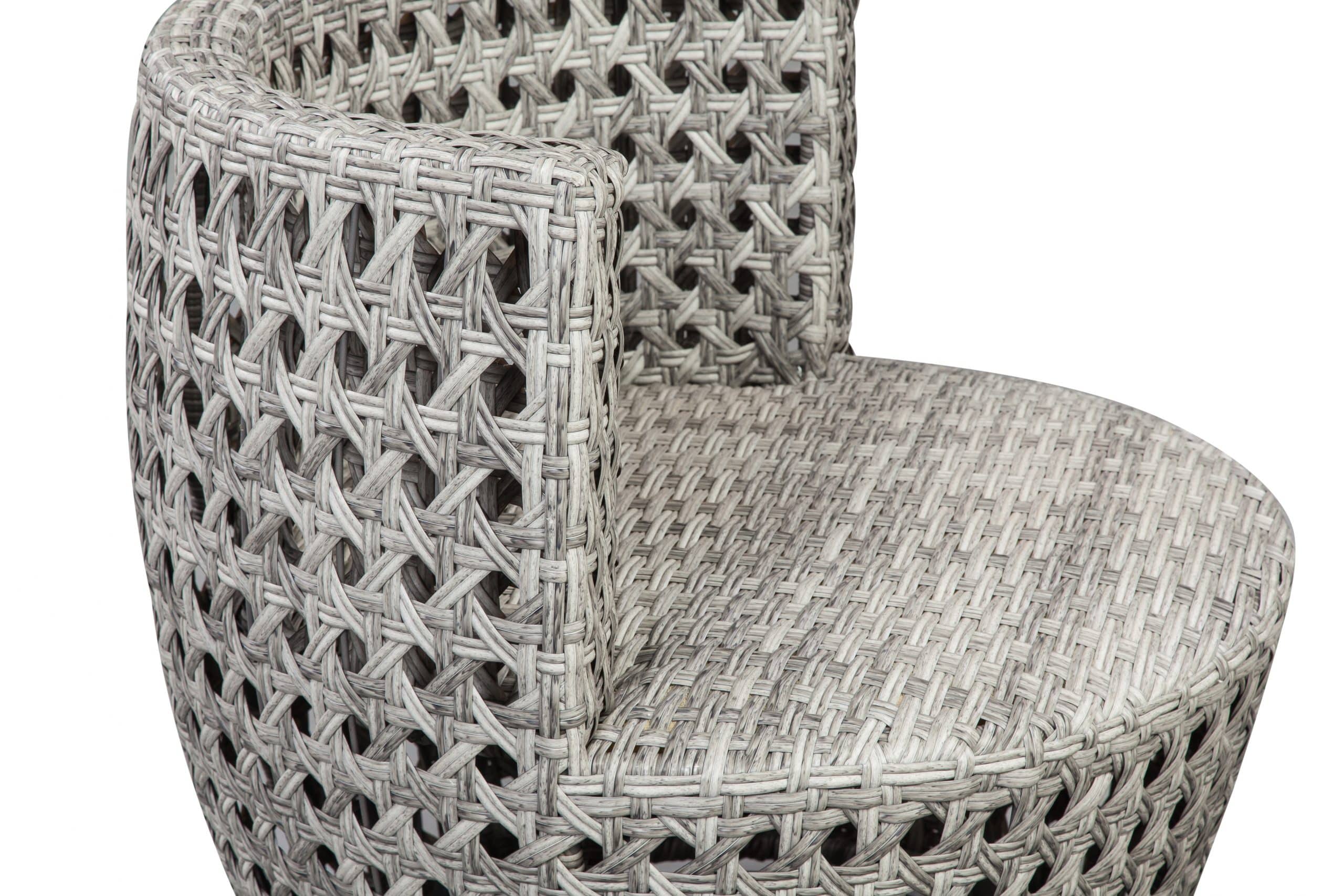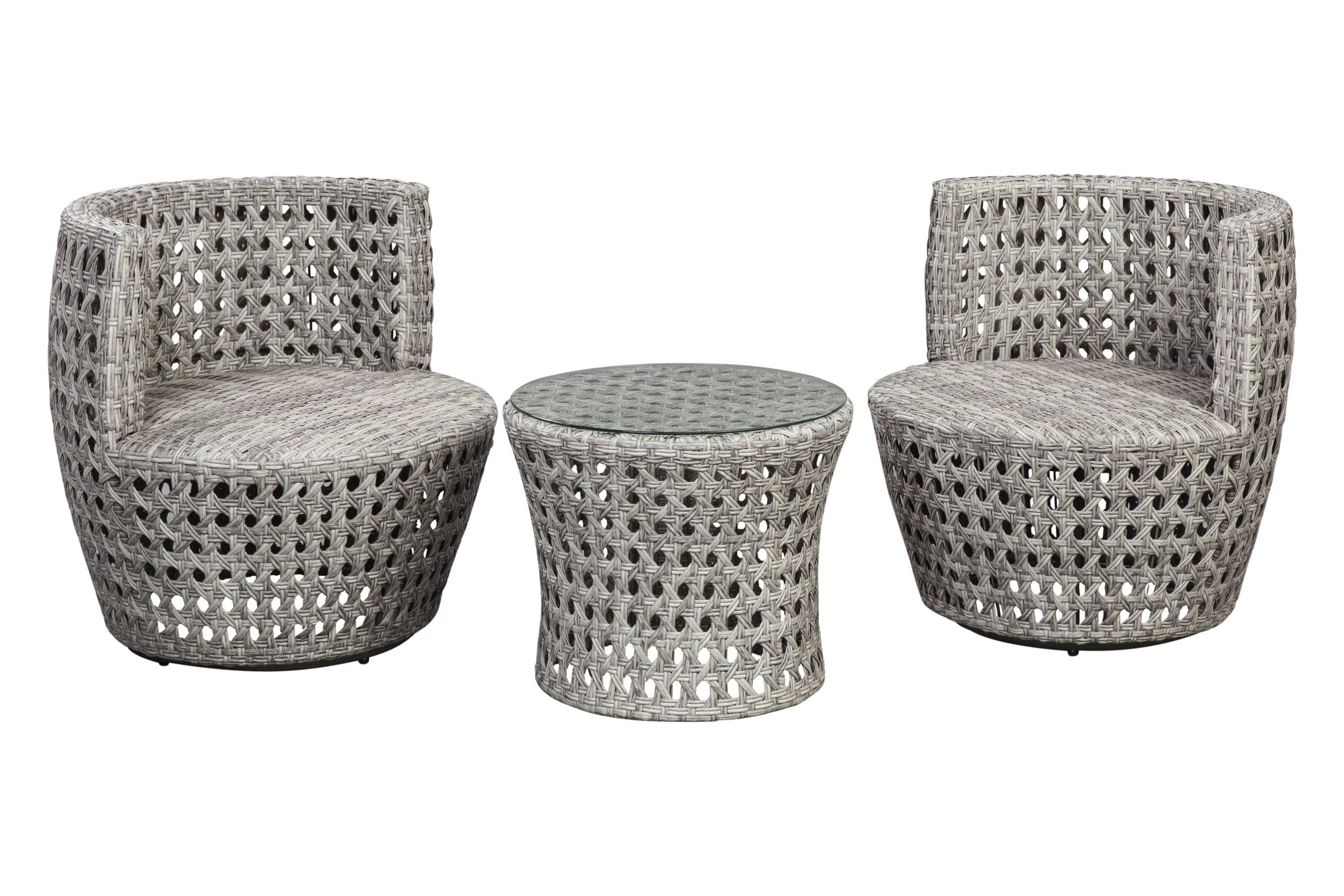 The 3pc Apple Outdoor Conversation Dining Set will fit perfectly in any outdoor setting. The quick dry and durable poly-rattan material will keep you entertaining shortly after any bad weather. Featuring the cats eye weave in a soft neutral Gray hue, this set will compliment any decor. This set includes side table and two chairs