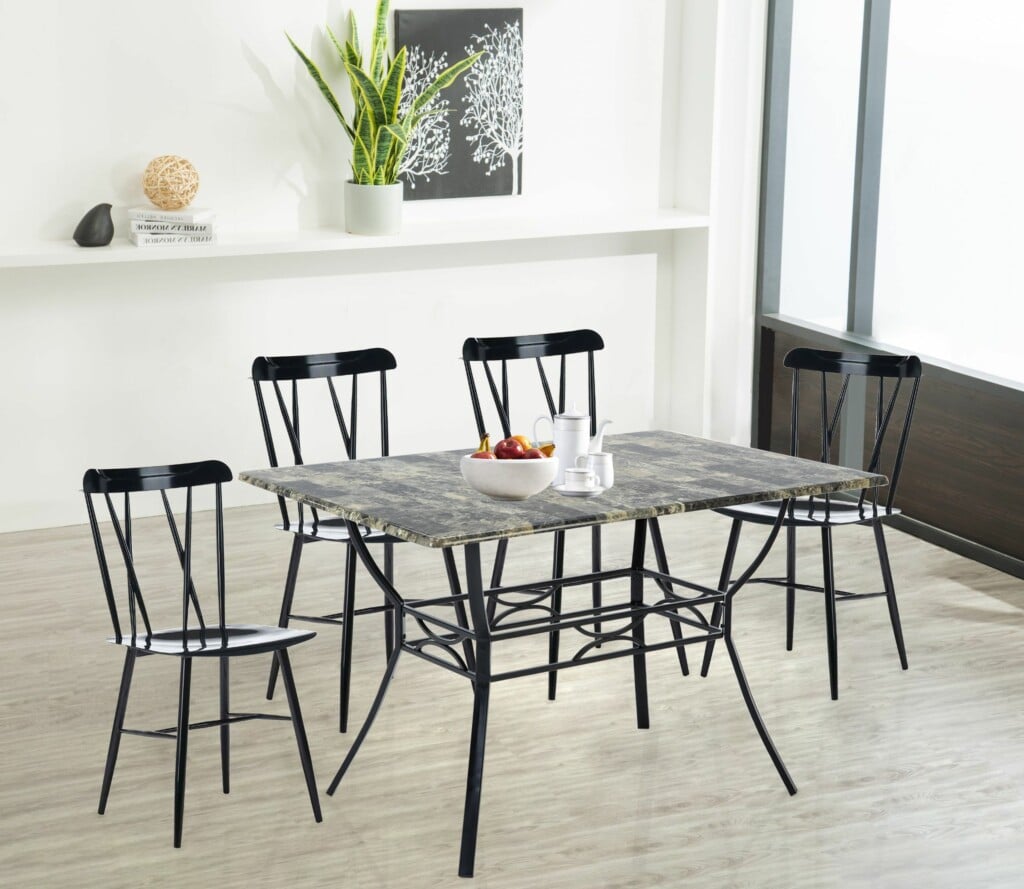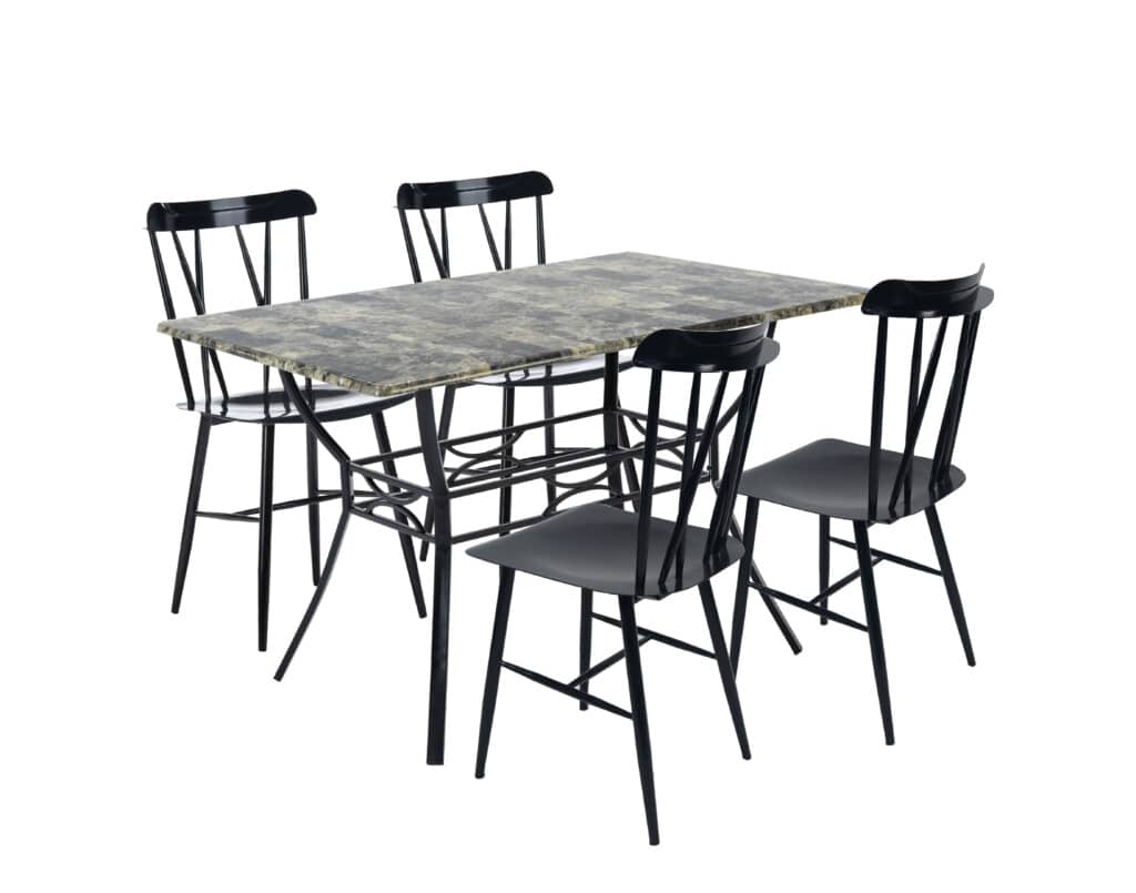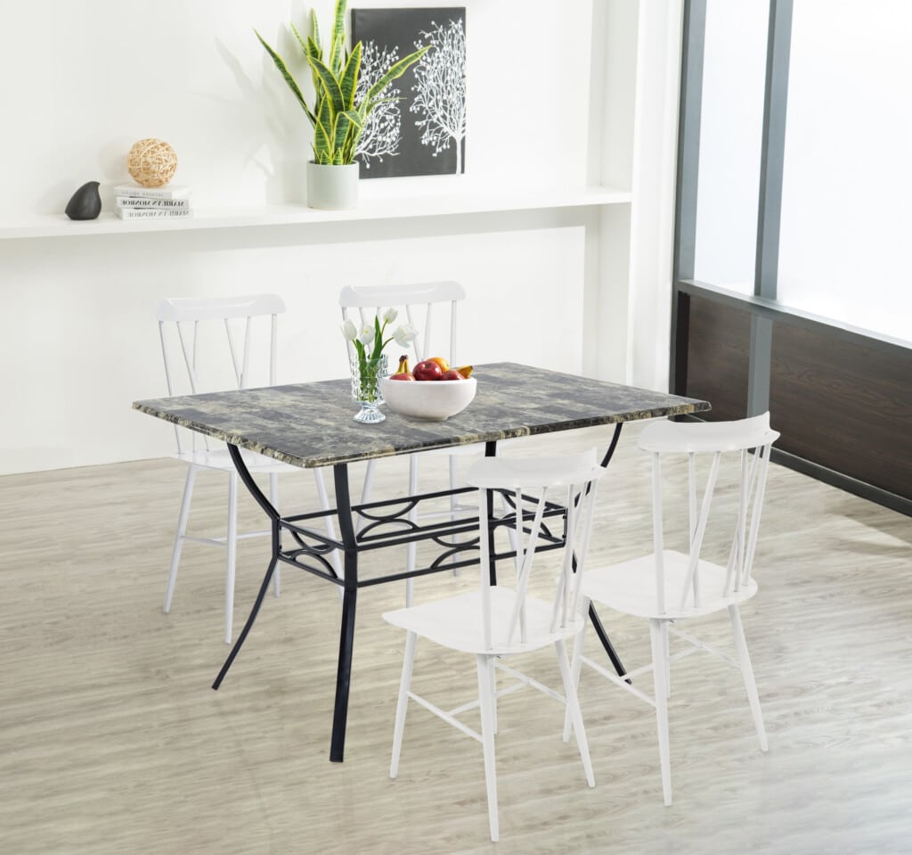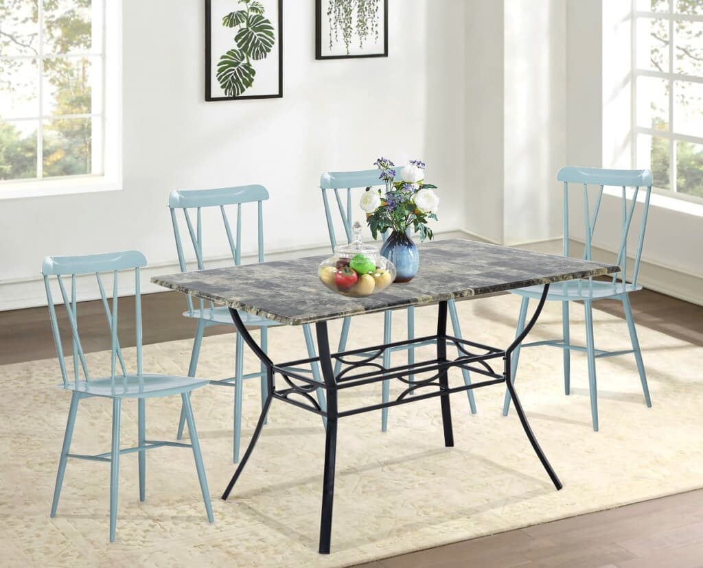 Whether hosting a dinner party with close friends or enjoying an everyday meal with the family, this 5-piece dining set is a must-have for your home. The dining table strikes a rectangular silhouette and is crafted from a black metal frame and a faux marble tabletop. The four metal dining chairs each feature an open double-x style back. The dining table set is suitable for any space in your home. Spend quality time with your family, make life elegant and practical, and enjoy life in this moment.