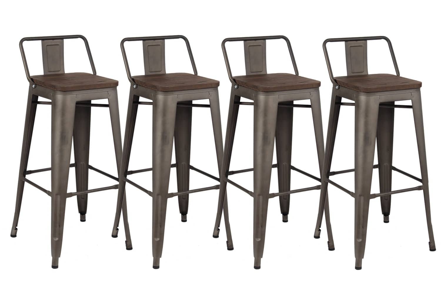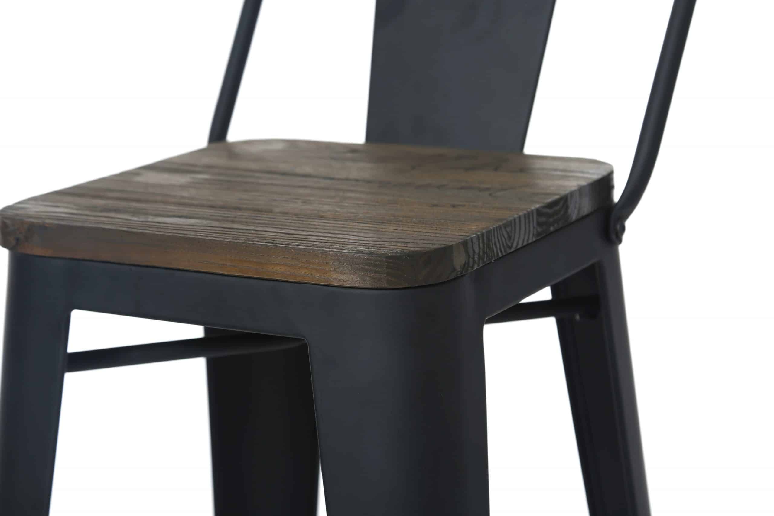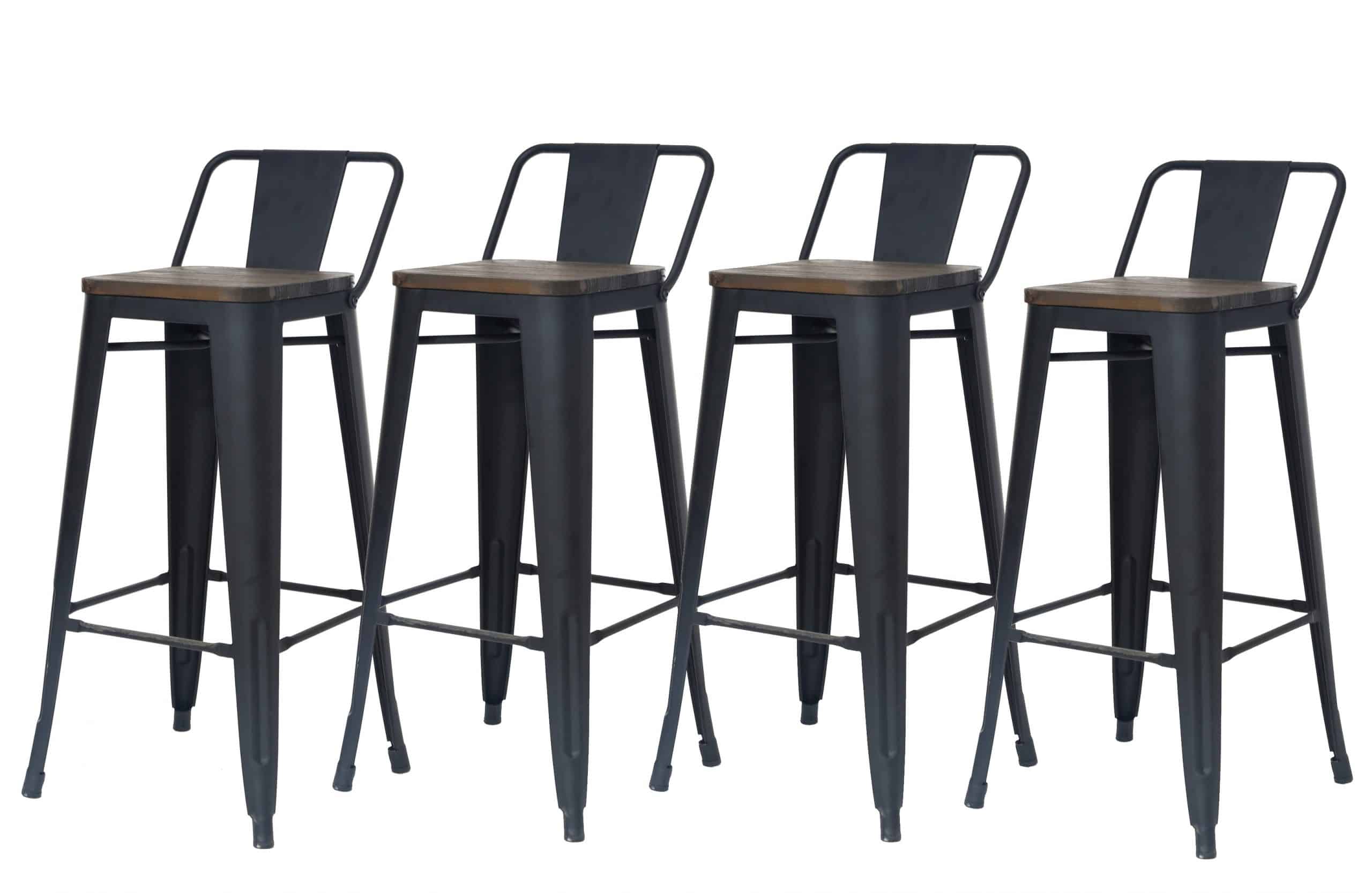 Metal stools, set of 4, black or gray, backrest, elm wood seat