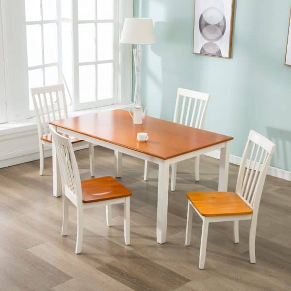 The Bloomington Dining Table allows you to set the stage – and set the table – for the perfect dining room experience. This Shaker-style dining table comes in your choice of two-toned color combinations. It’s precisely crafted with a solid rubberwood frame and a tabletop made from durable engineered wood with wood veneer. This dining table can fit up to six of your favorite people – just pair it with the matching Bloomington Dining Chairs and Bloomington Dining Bench for a dining room made in design heaven.