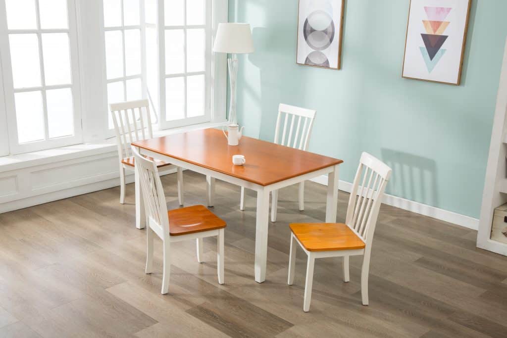 The Bloomington Dining Table allows you to set the stage – and set the table – for the perfect dining room experience. This Shaker-style dining table comes in your choice of two-toned color combinations. It’s precisely crafted with a solid rubberwood frame and a tabletop made from durable engineered wood with wood veneer. This dining table can fit up to six of your favorite people – just pair it with the matching Bloomington Dining Chairs and Bloomington Dining Bench for a dining room made in design heaven.