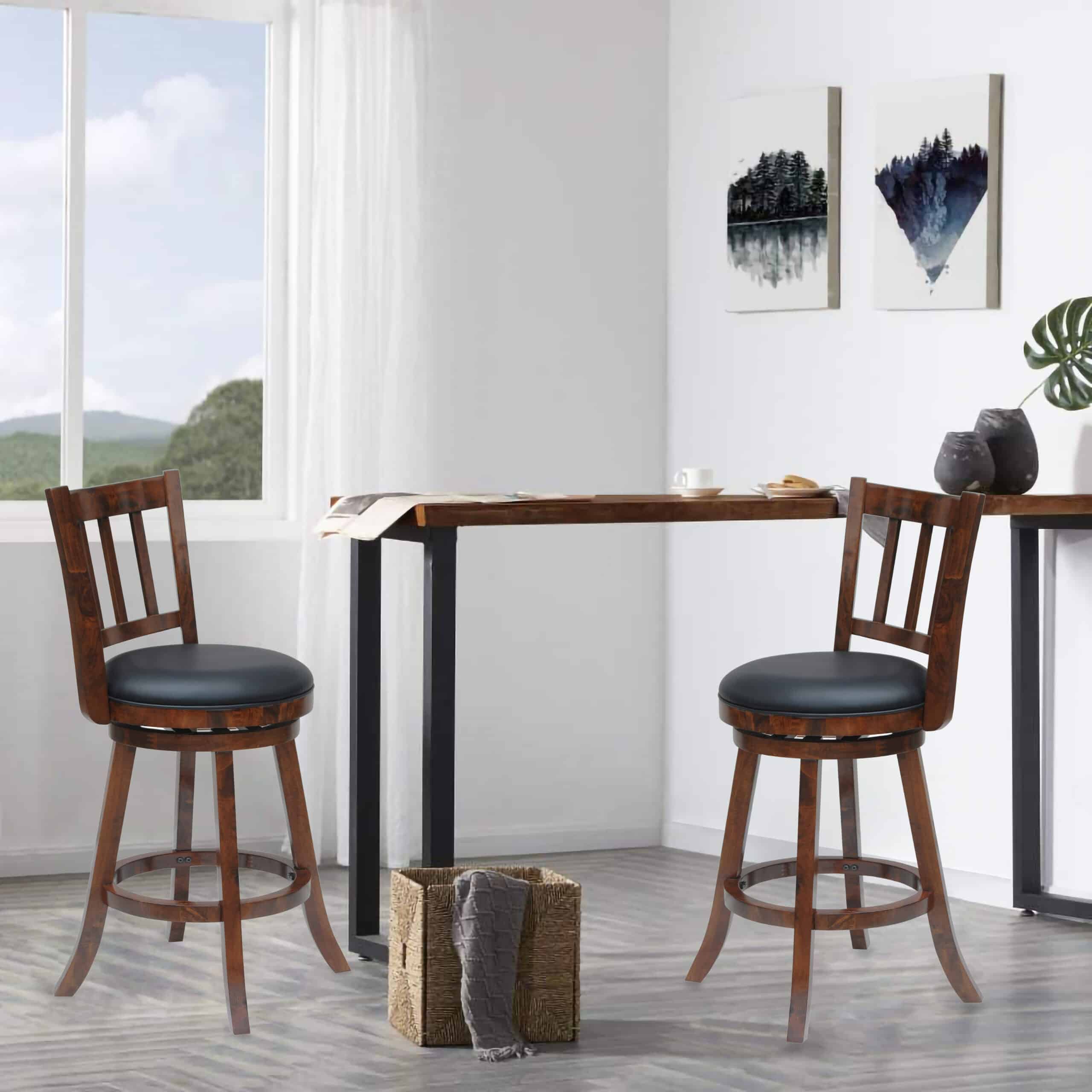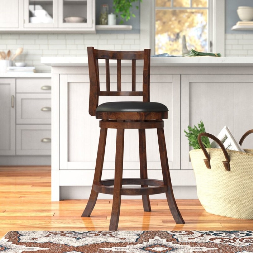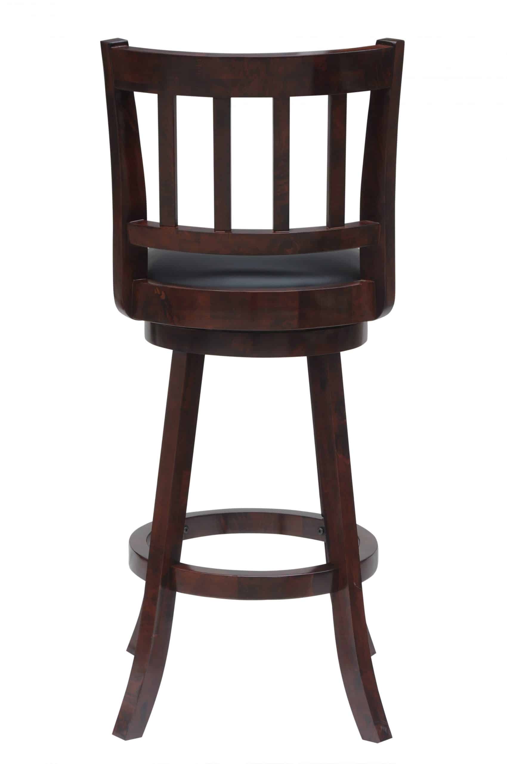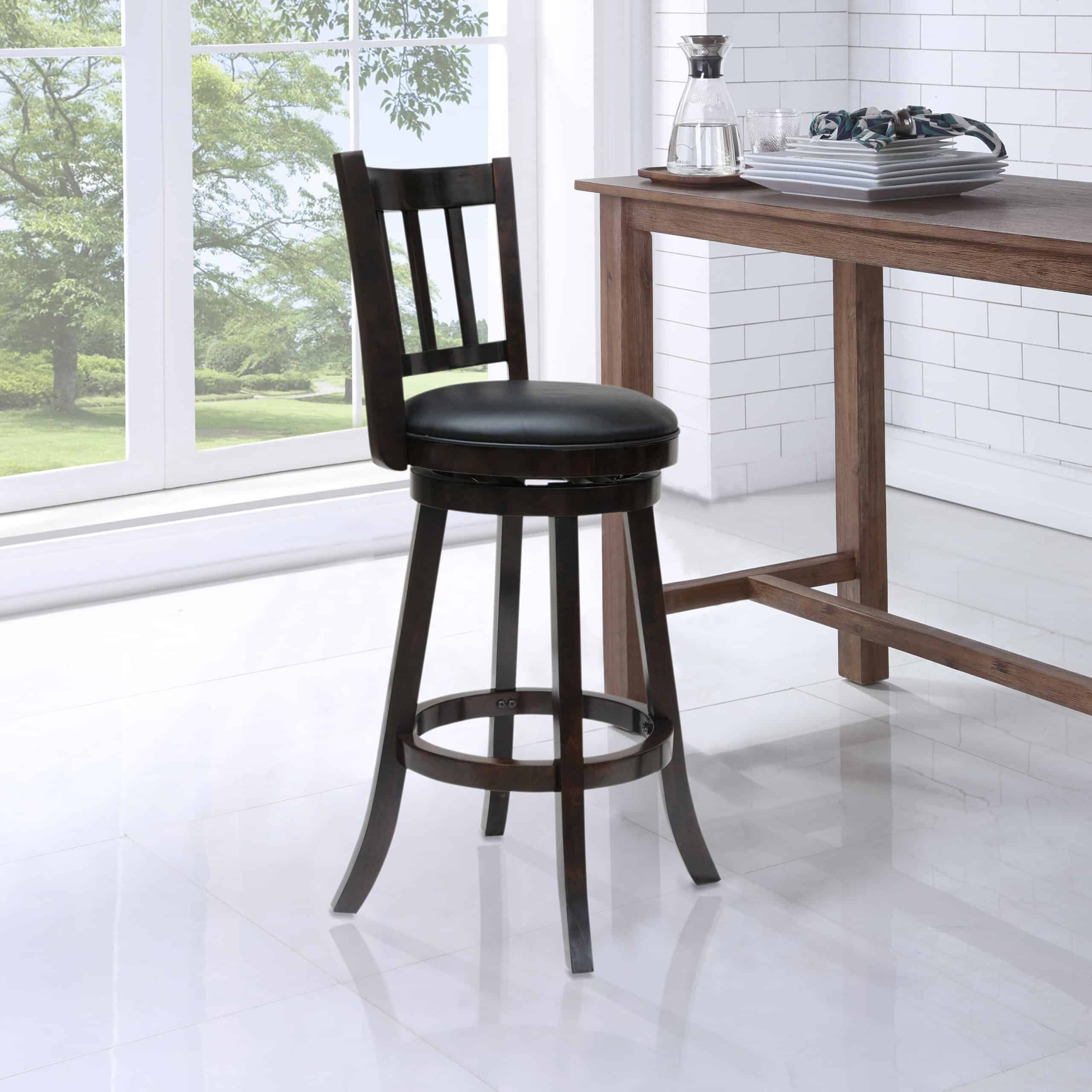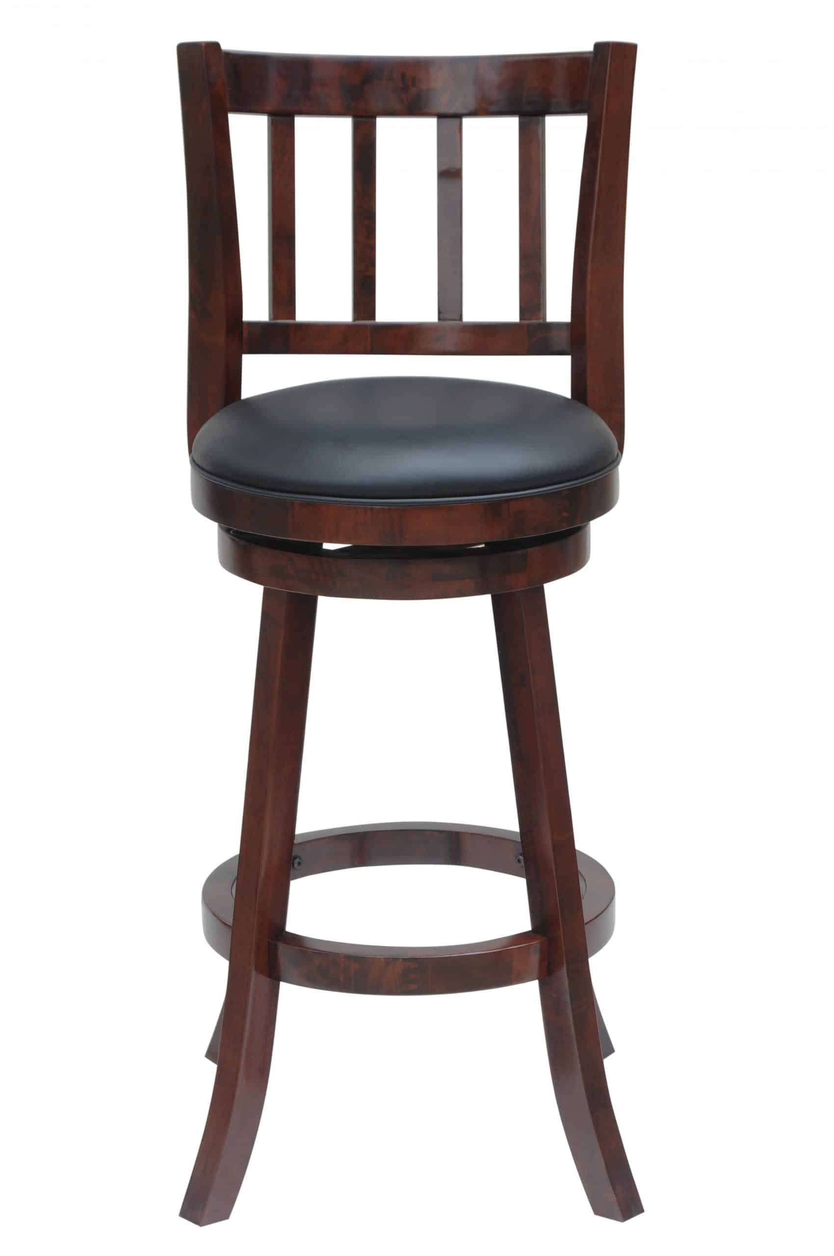 The Bloomington Swivel Stool is the perfect design chameleon, bringing versatile looks to your home. The rich wood finish and black faux leather offer sleek, traditional features perfect for a kitchen setting. Meanwhile, the high-density foam padding, full-ring footrest, and 360-degree swivel also promise the Bloomington is a comfortable, inviting seat at a home bar or in a den or game room. Available in counter and bar height options, and in three different finishes.