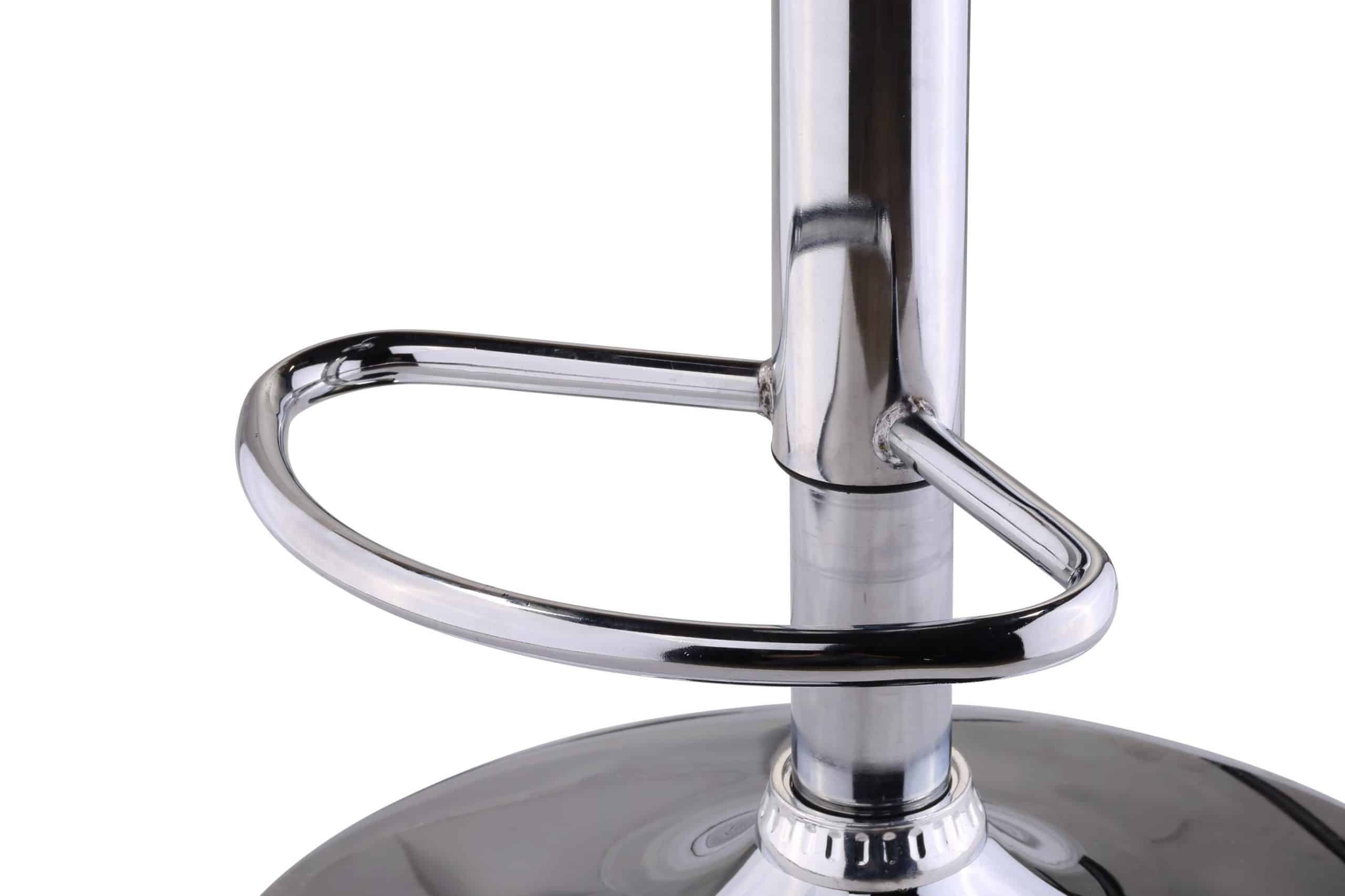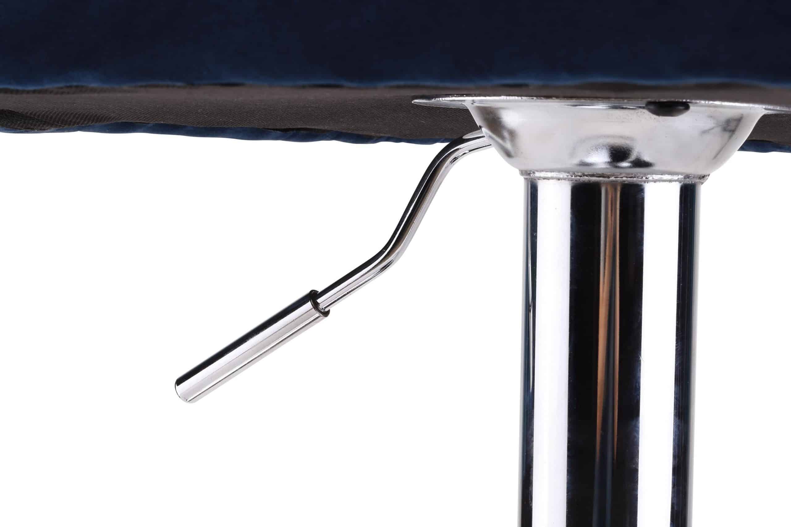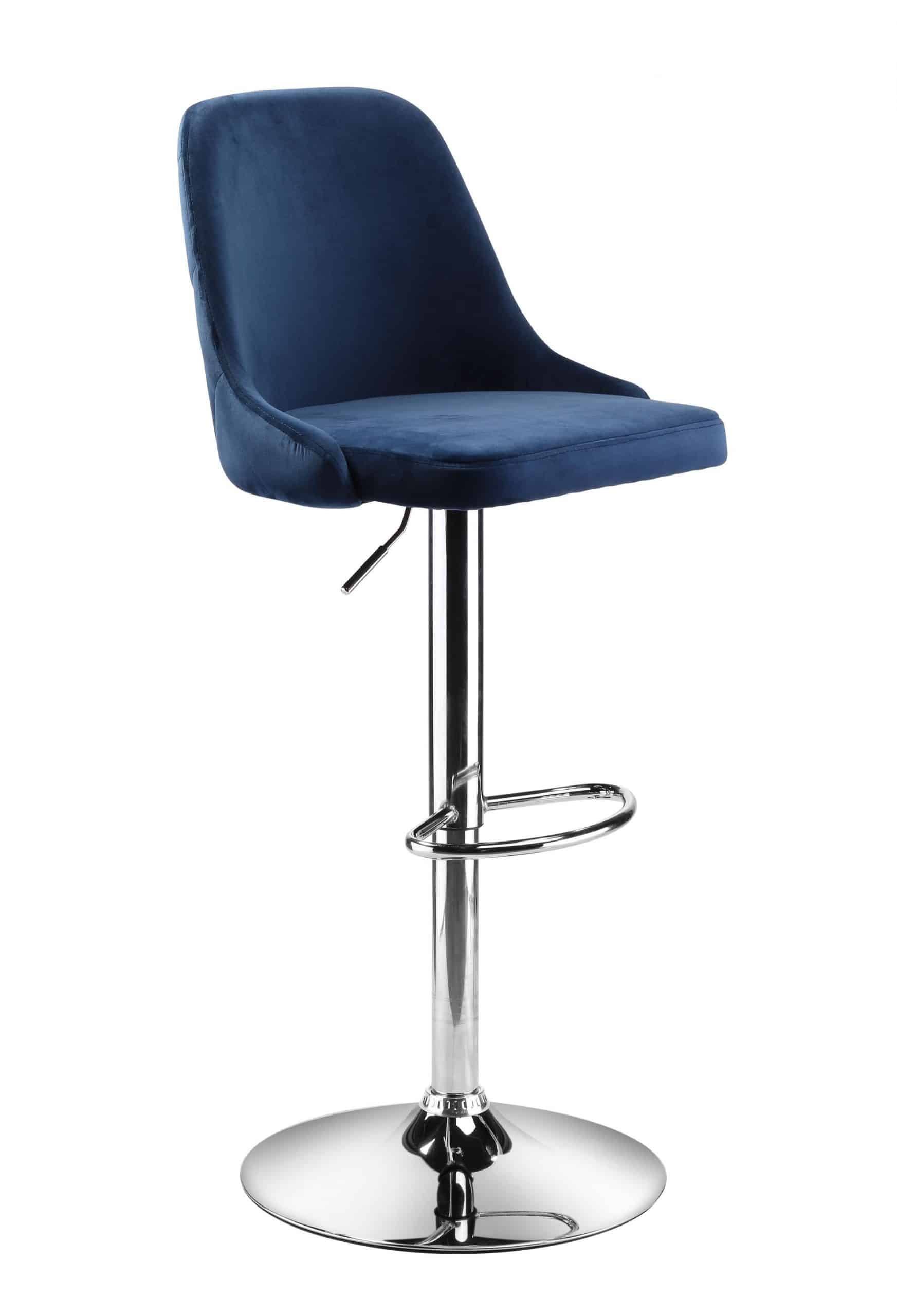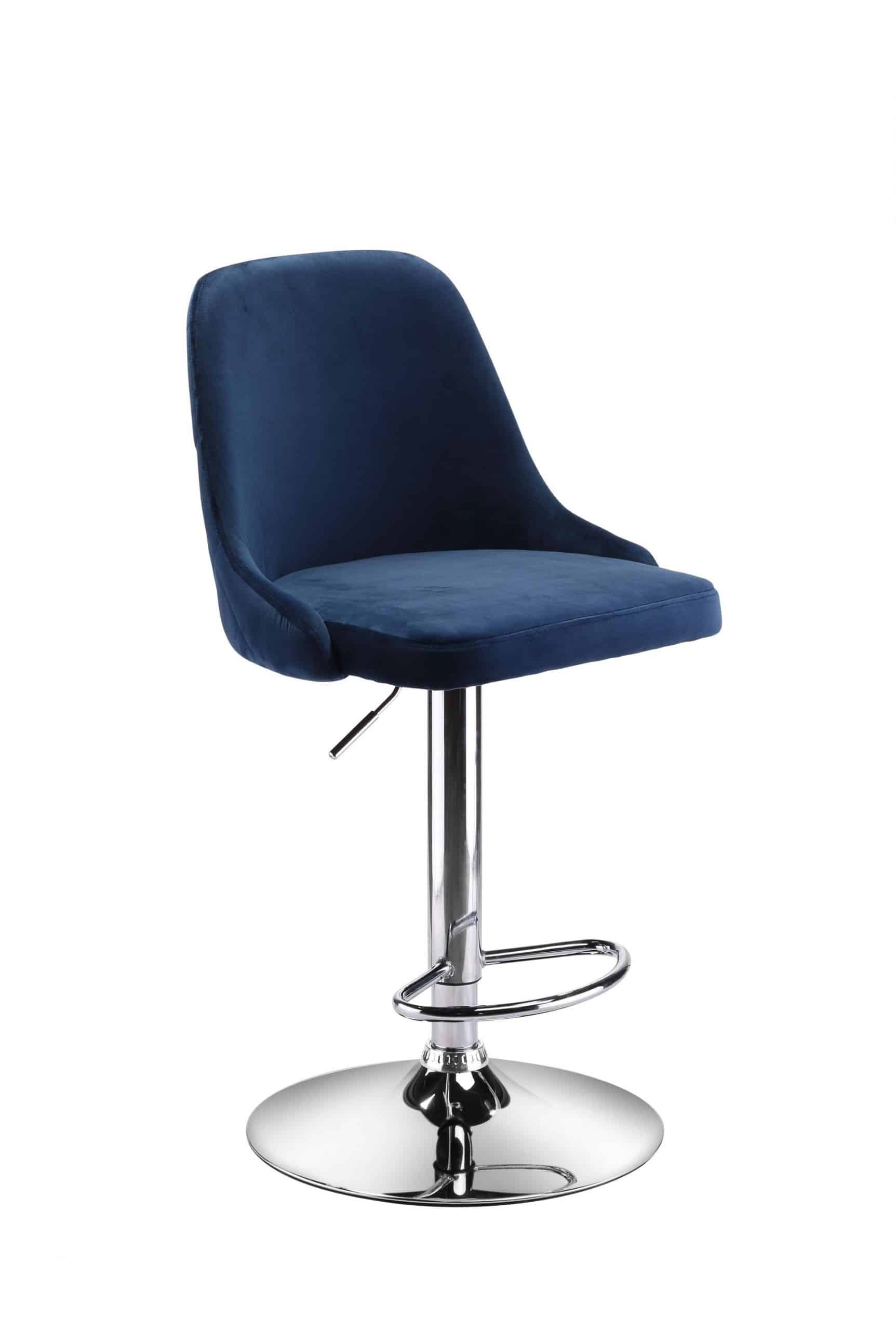 This adjustable stool is constructed with a metal base and blue suede fabric for seating. It is an adjustable stool so the height can range from counter height to bar height. This stool comes out of China.