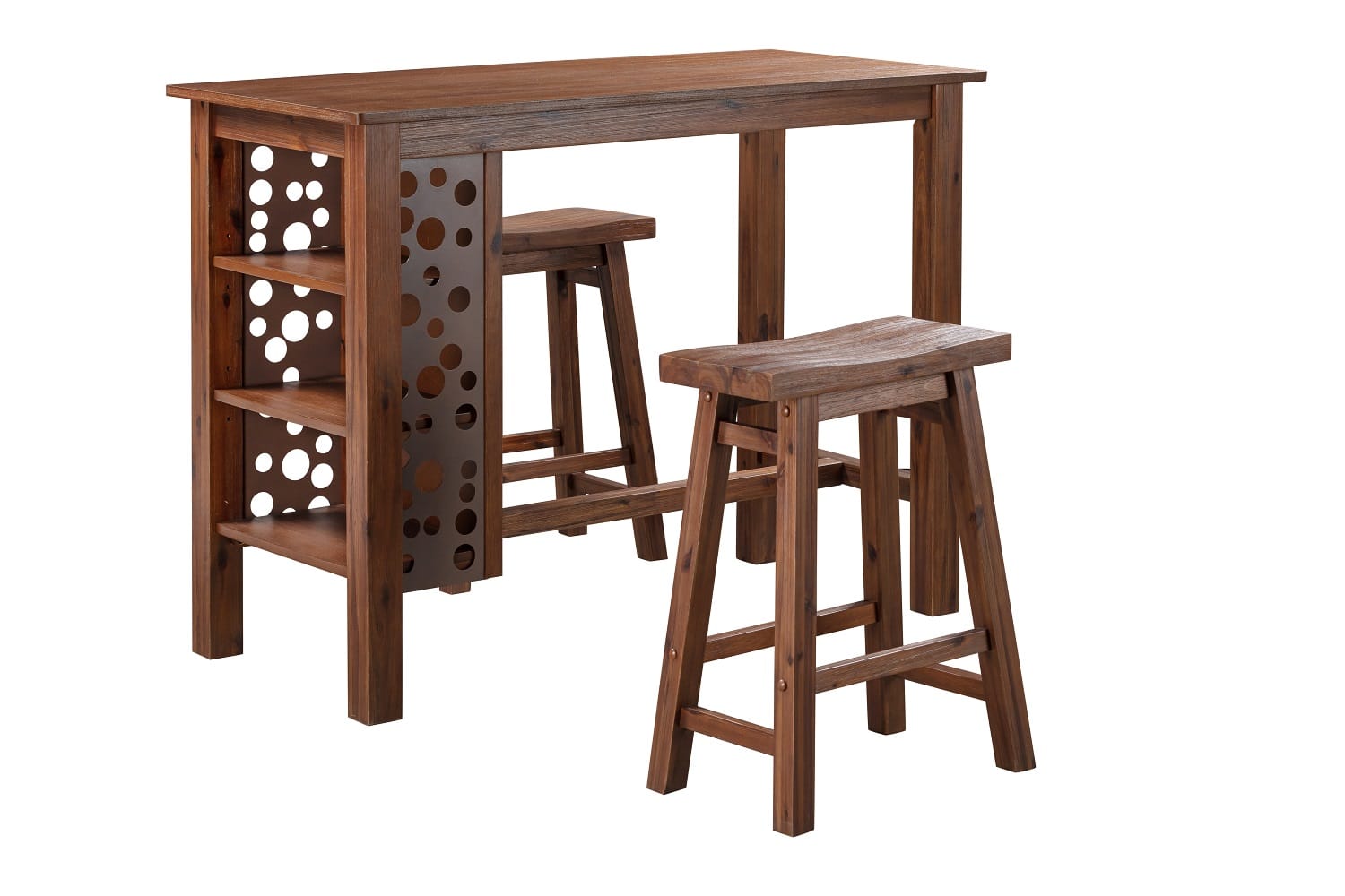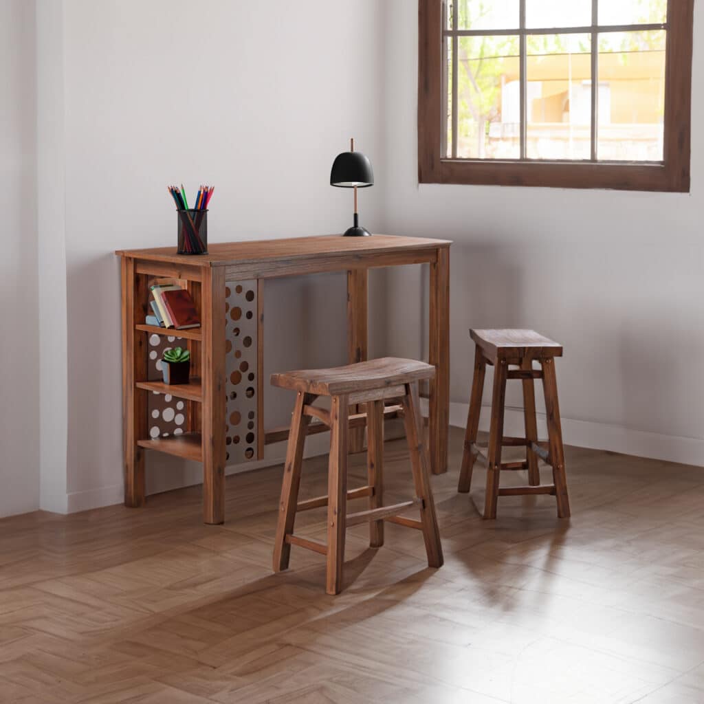 Welcome family and friends to casual after-dinner drinks and easy Sunday brunches around the Brittany 3 piece bar table set. This three-piece set includes everything you need to create a cozy eating nook in the kitchen or dining room space. The bar table is paired with two matching chestnut wire-brush saddle stools. The acacia wood and metal dining table feature a multistep wire-brush finish which enhances the natural beauty of the wood even more. This multi-function dining table also features 3-tiered bookshelves surrounded by decorative steel accents to display cookbooks, decorative accessories and more. The Brittany 3pc bar table set comes in your choice of dining or bar height options. Both options are available in Chestnut Wire-Brush Finish.