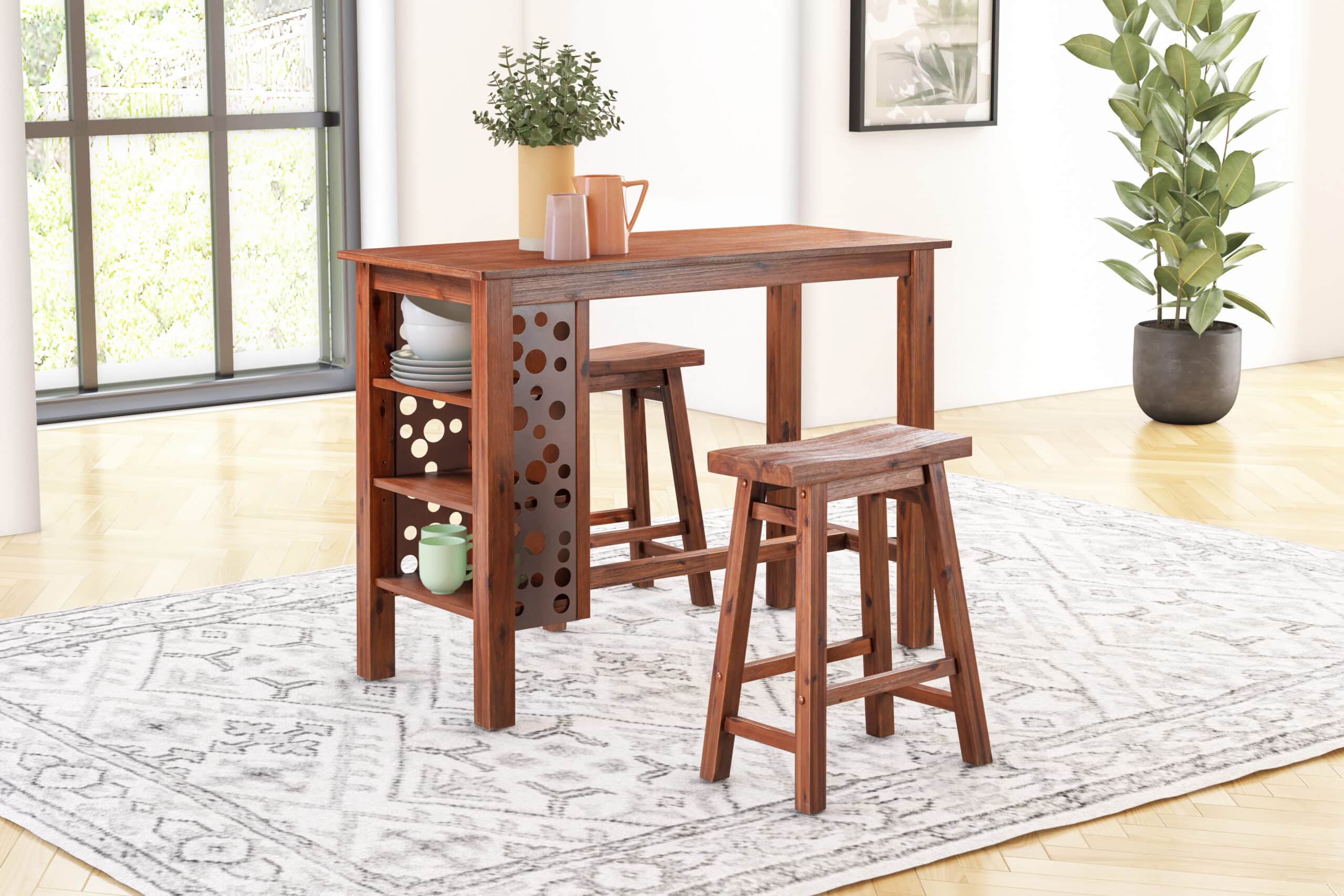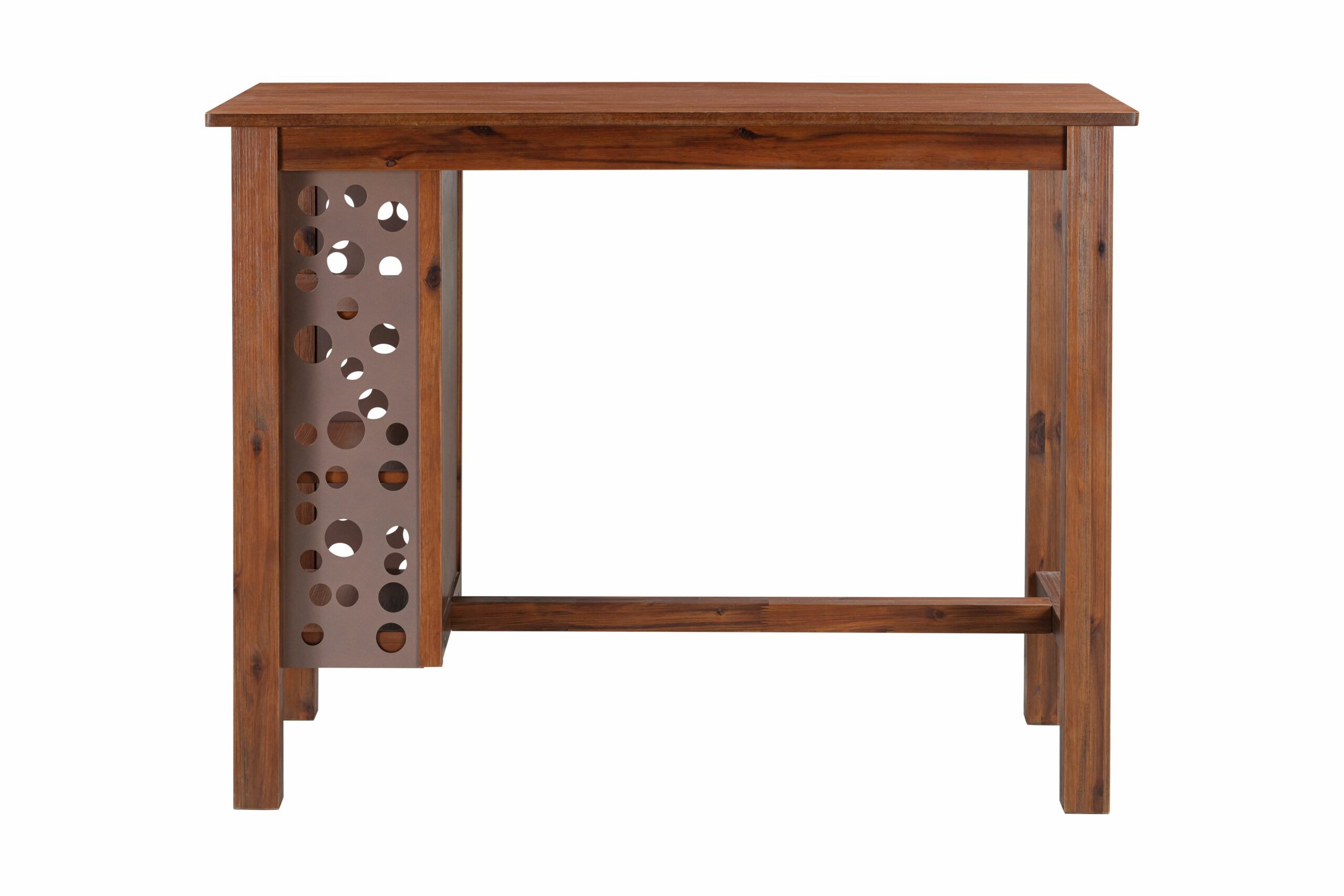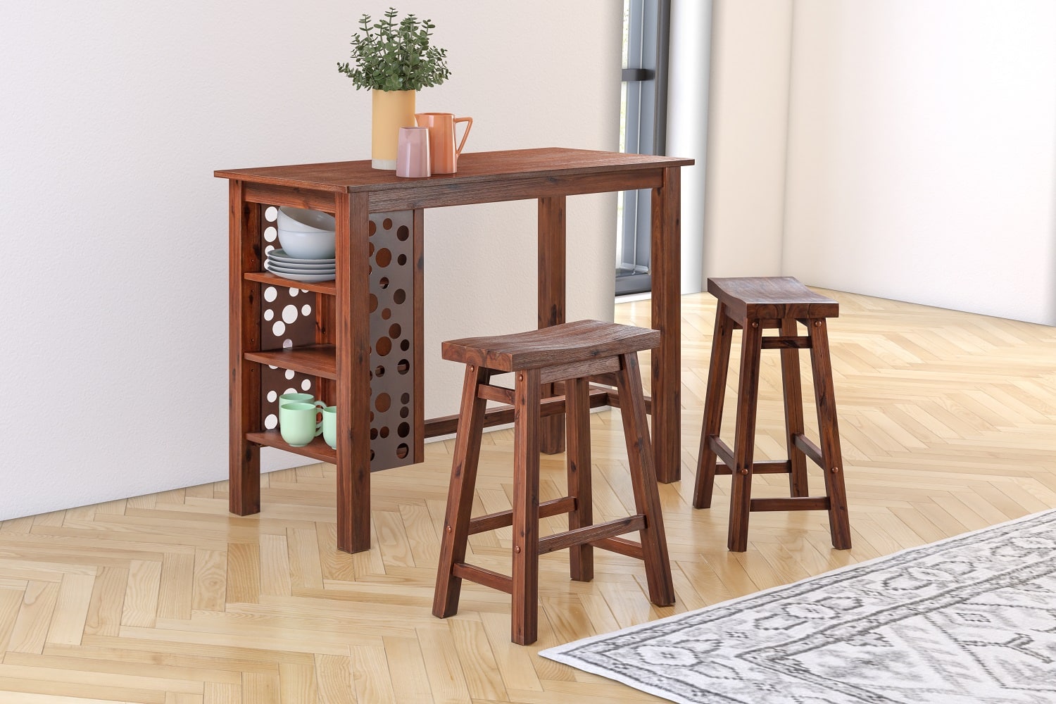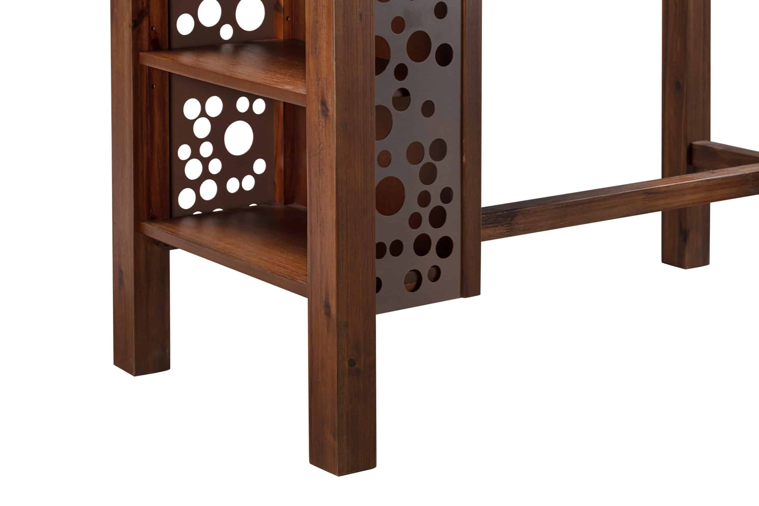 Versatility and rugged charm go hand-in-hand with our Brittany rectangular bar table with storage shelves. The acacia wood and metal dining table feature a multistep wire-brush finish which enhances the natural beauty of the wood even more. This multi-function bar table also features 3-tiered bookshelves surrounded by decorative metal accents to display cookbooks, decorative accessories and more. However, you choose to use this functional piece, make it yours by adding four of your favorite stools (like the Boraam Sonoma Saddle Stools – sold separately). The Brittany bar table comes in your choice of dining or bar height options. Both options are available in Chestnut Wire-Brush Finish.