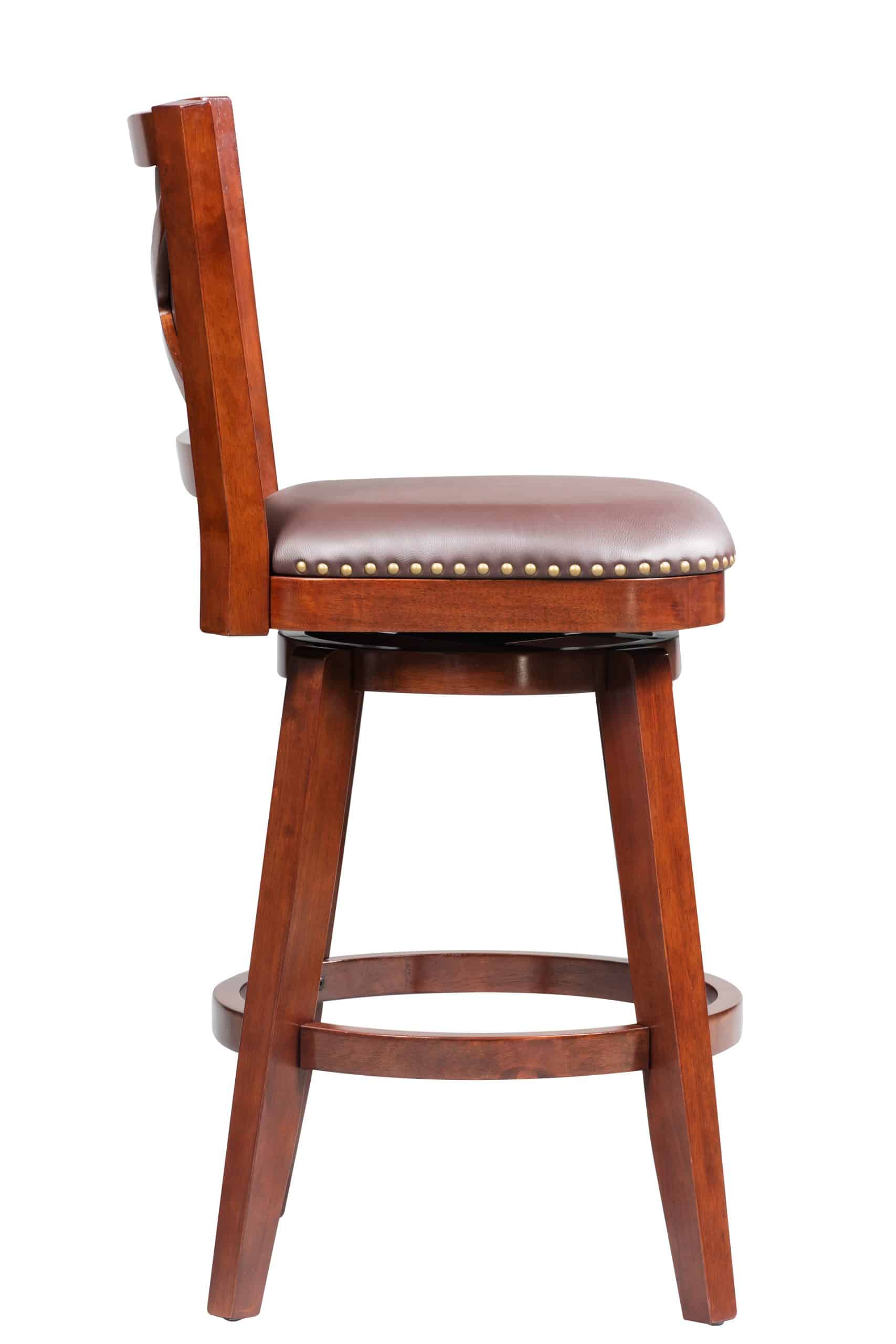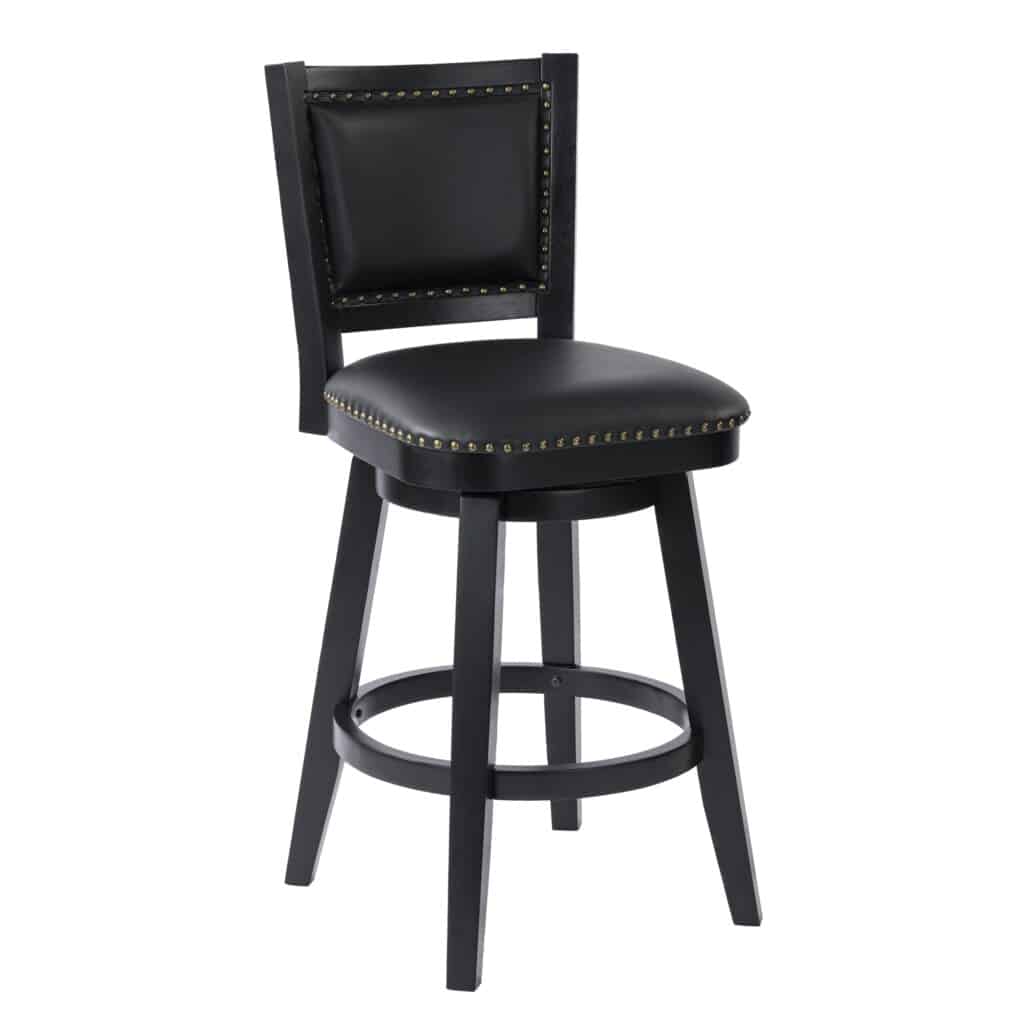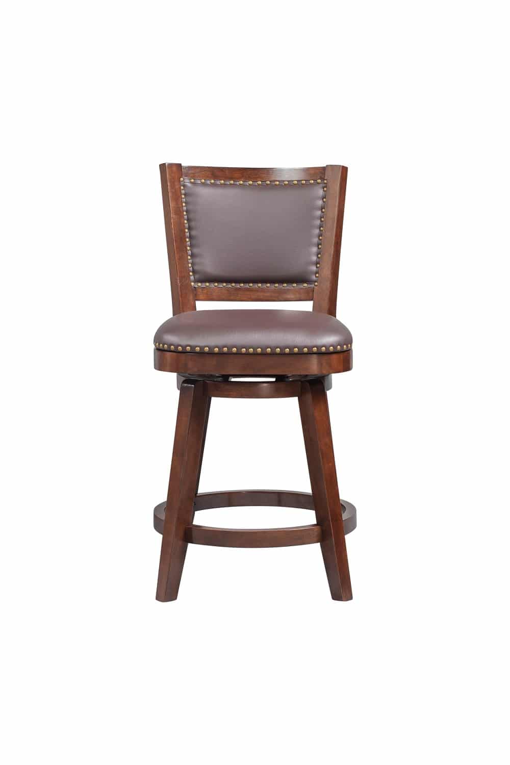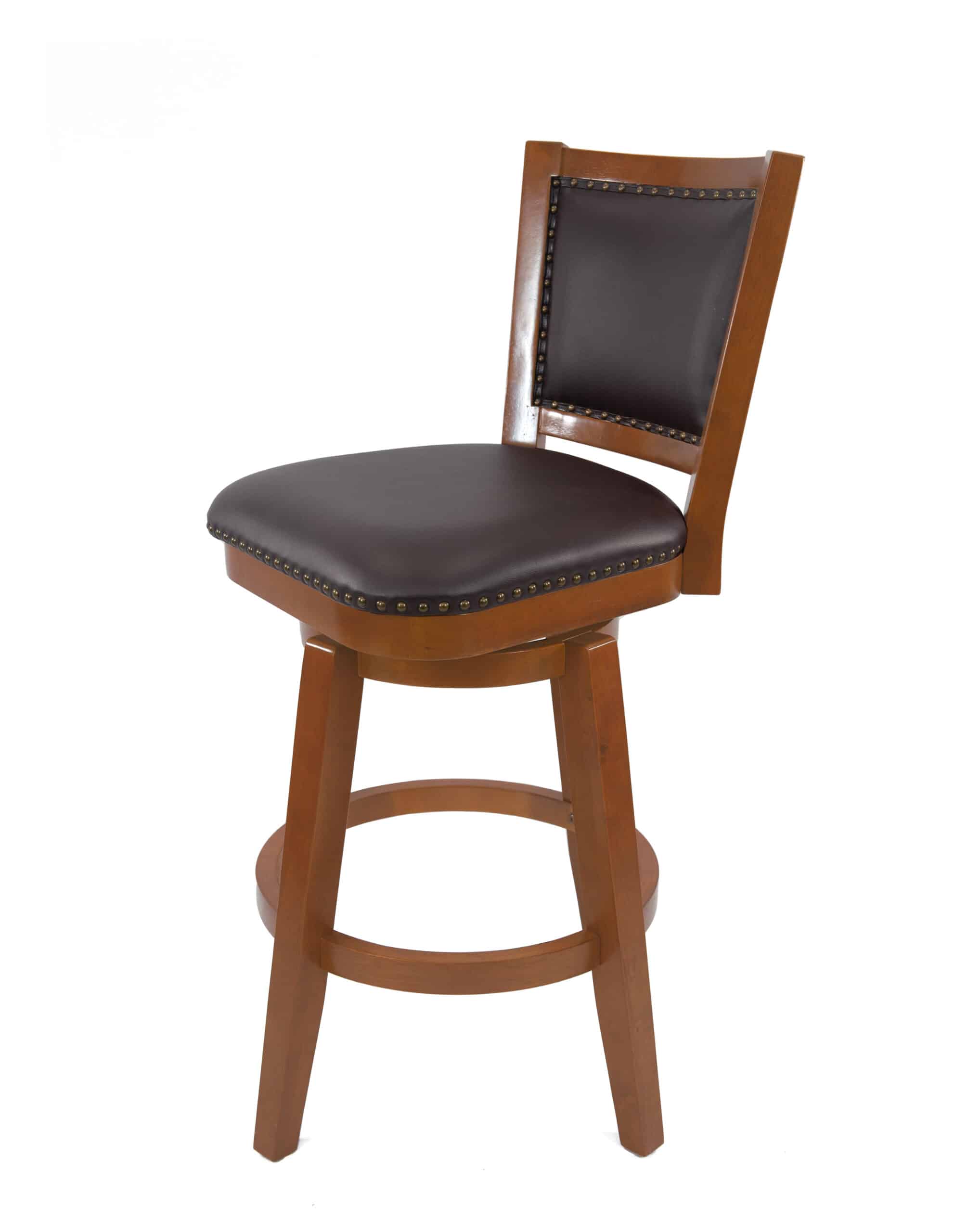 Finish off your bar, den, or game room in traditional style with the Broadmoor Swivel Stool. The Broadmoor Swivel Stool is designed to be enjoyed, which is why it features easy-wipe faux leather upholstery. If your drink spills or some crumbs fall onto the faux leather seat, simply wipe the upholstery clean in a flash. For your comfort, it also features a swivel, built-in footrest, and padded seat and backrests. The counter stool’s solid rubberwood frame comes in your choice of Cherry, Cappuccino, Walnut or Black finishes. The protective floor glides on the base guard your hard floors against scratches or scuffs. The Broadmoor is available in counter, bar, and extra tall height options.