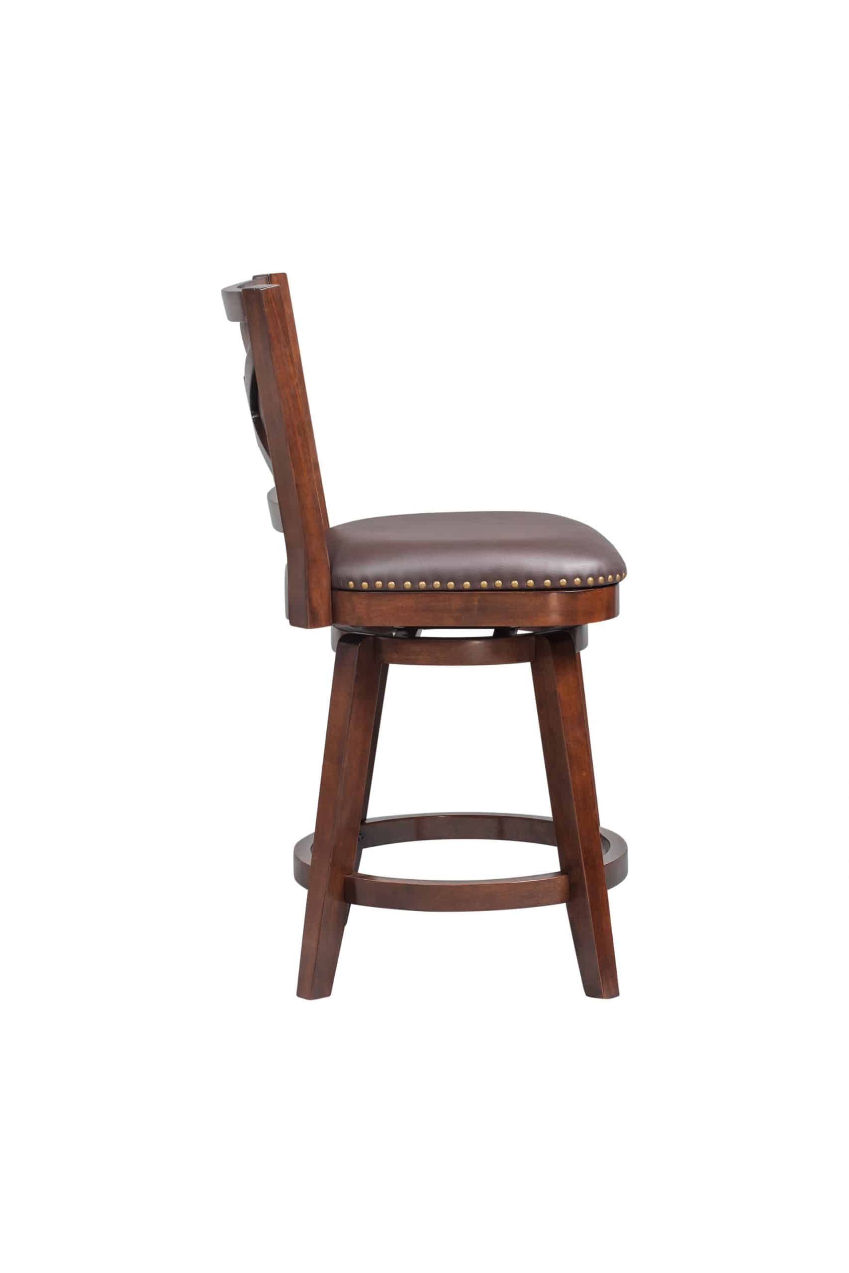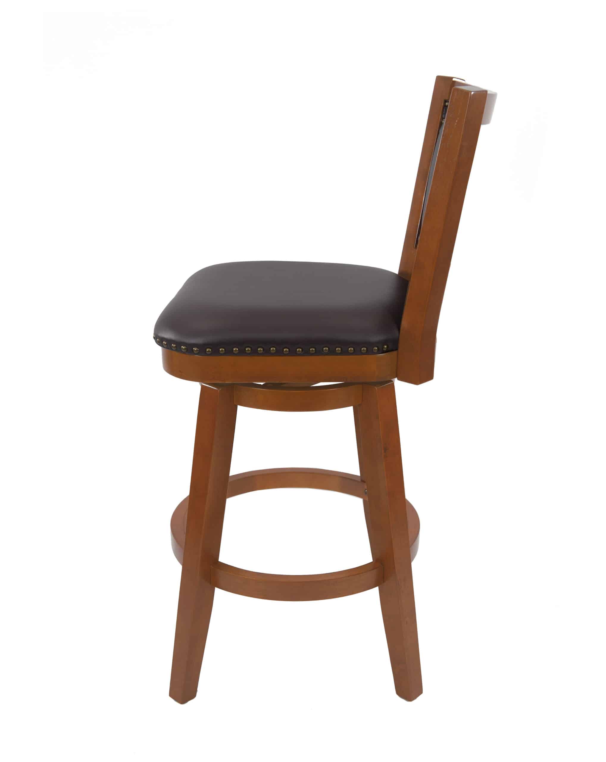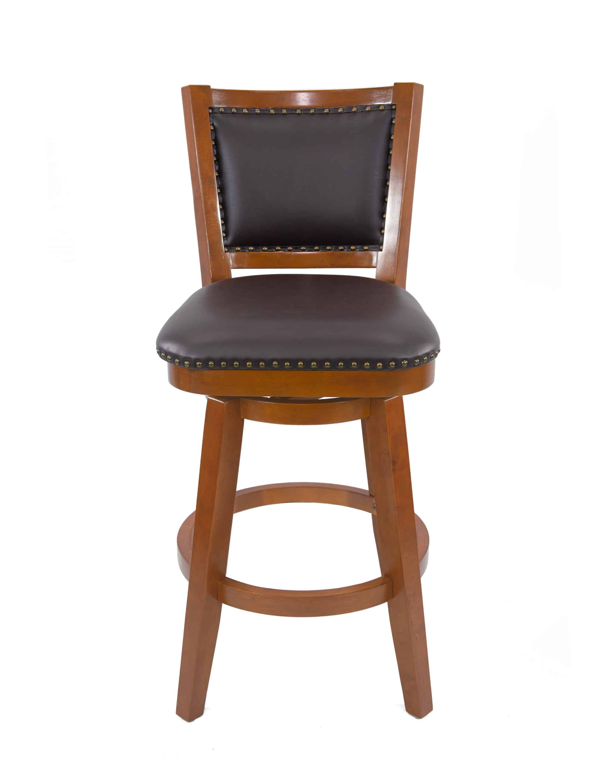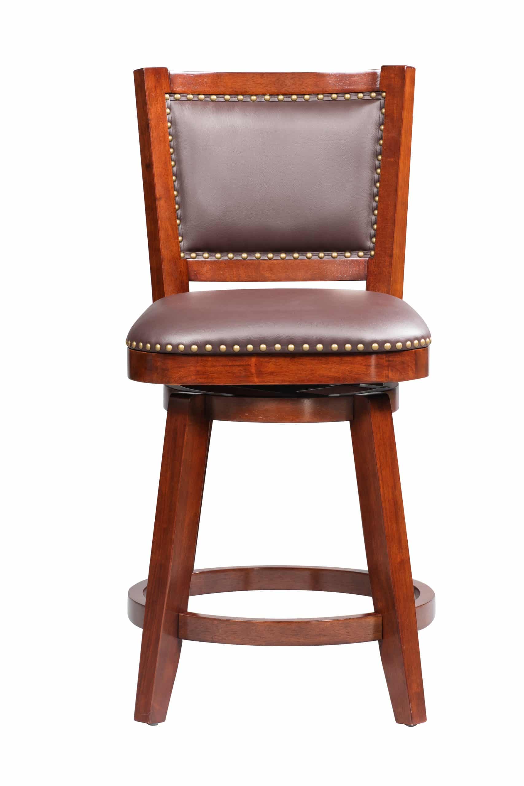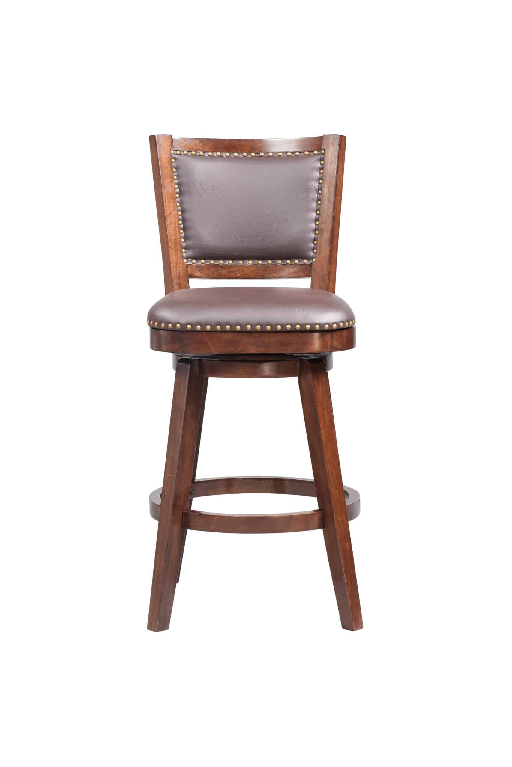 Finish off your bar, den, or game room in traditional style with the Broadmoor Swivel Stool. The Broadmoor Swivel Stool is designed to be enjoyed, which is why it features easy-wipe faux leather upholstery. If your drink spills or some crumbs fall onto the faux leather seat, simply wipe the upholstery clean in a flash. For your comfort, it also features a swivel, built-in footrest, and padded seat and backrests. The counter stool’s solid rubberwood frame comes in your choice of Cherry, Cappuccino, Walnut or Black finishes. The protective floor glides on the base guard your hard floors against scratches or scuffs. The Broadmoor is available in counter, bar, and extra tall height options.