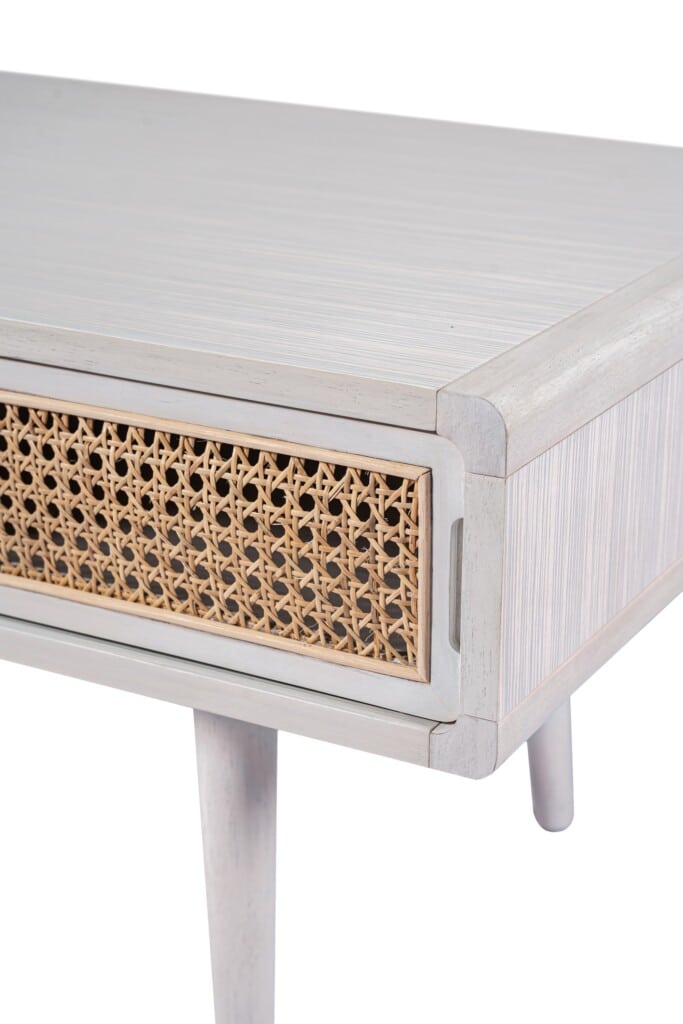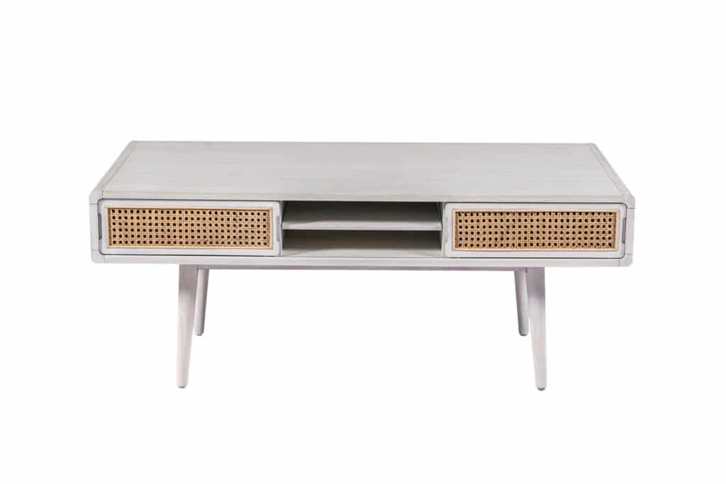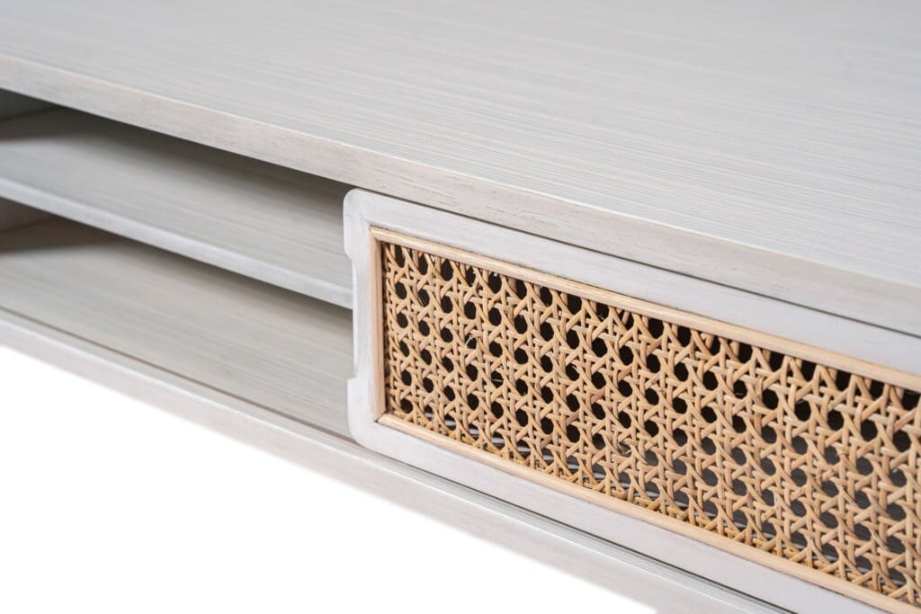 - Two cane woven sliding wood doors both beautiful and practical, suitable for storing media devices such as remote controls and headphones, keeping them away from dust