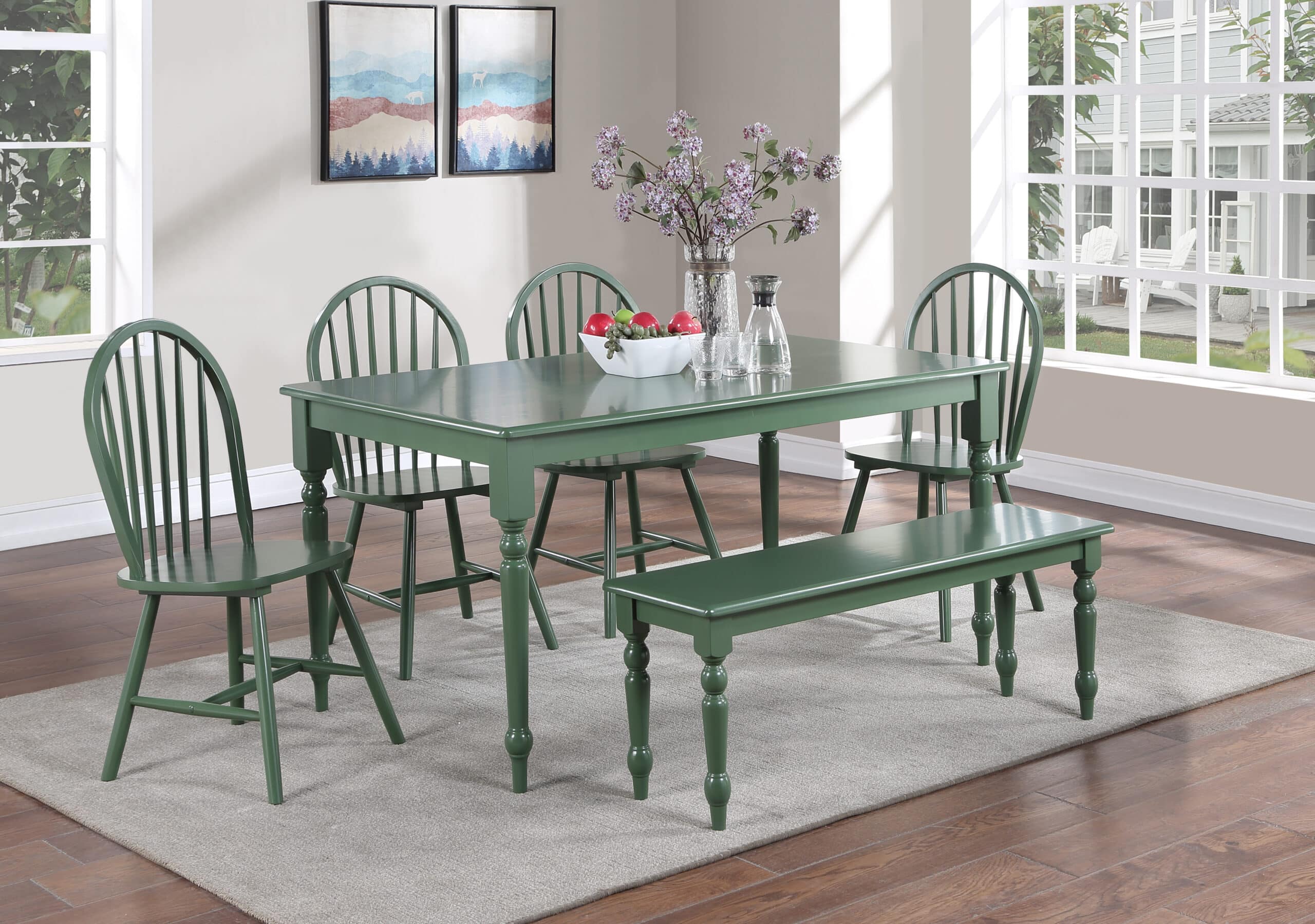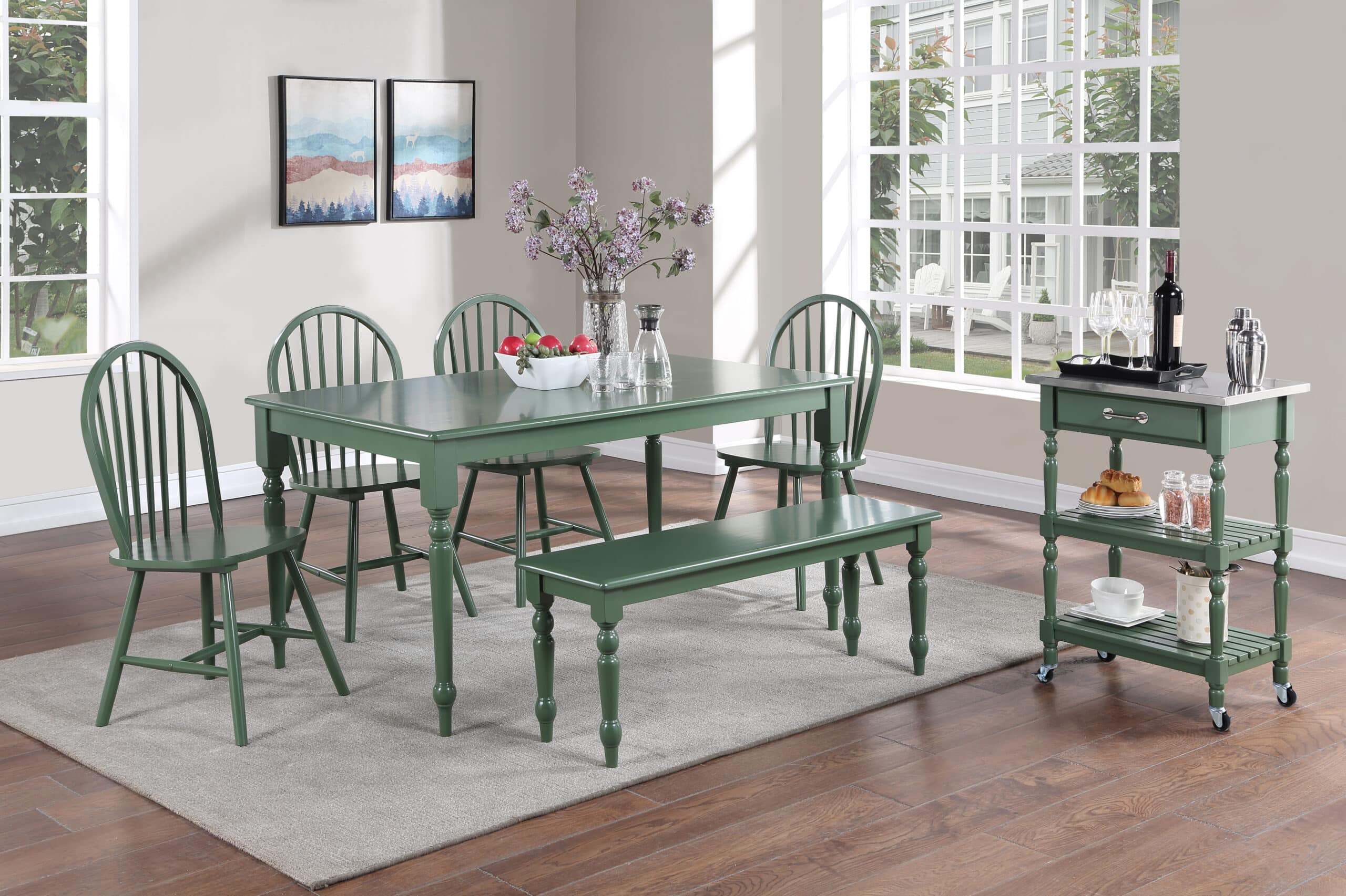Cozy and inviting, the 6-Piece Carolina Dining Set brings home modern farmhouse charm. From the turned table legs to the curving spindle chair backs, each piece is full of personality. The rectangular dining table, four chairs, and dining bench offer enough seating for a family of six. Crafted from rubberwood, each piece is finished in a decadent Equestrian Green color that adds an inviting sense of warmth to your dining room. Finish the look by adding the Carolina Kitchen Cart or a spare Carolina Dining Bench to your home (sold separately).