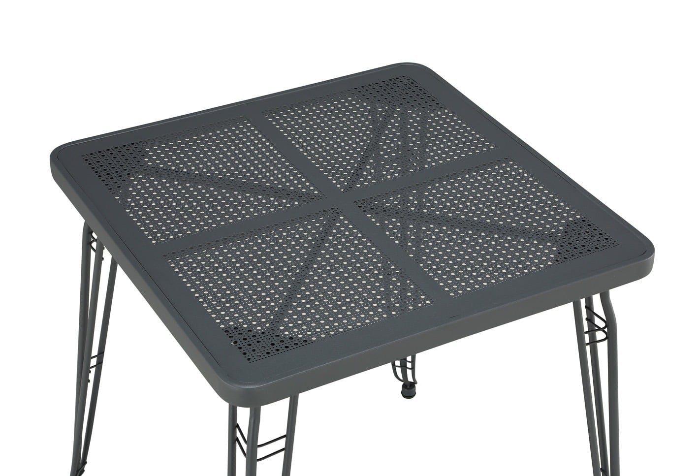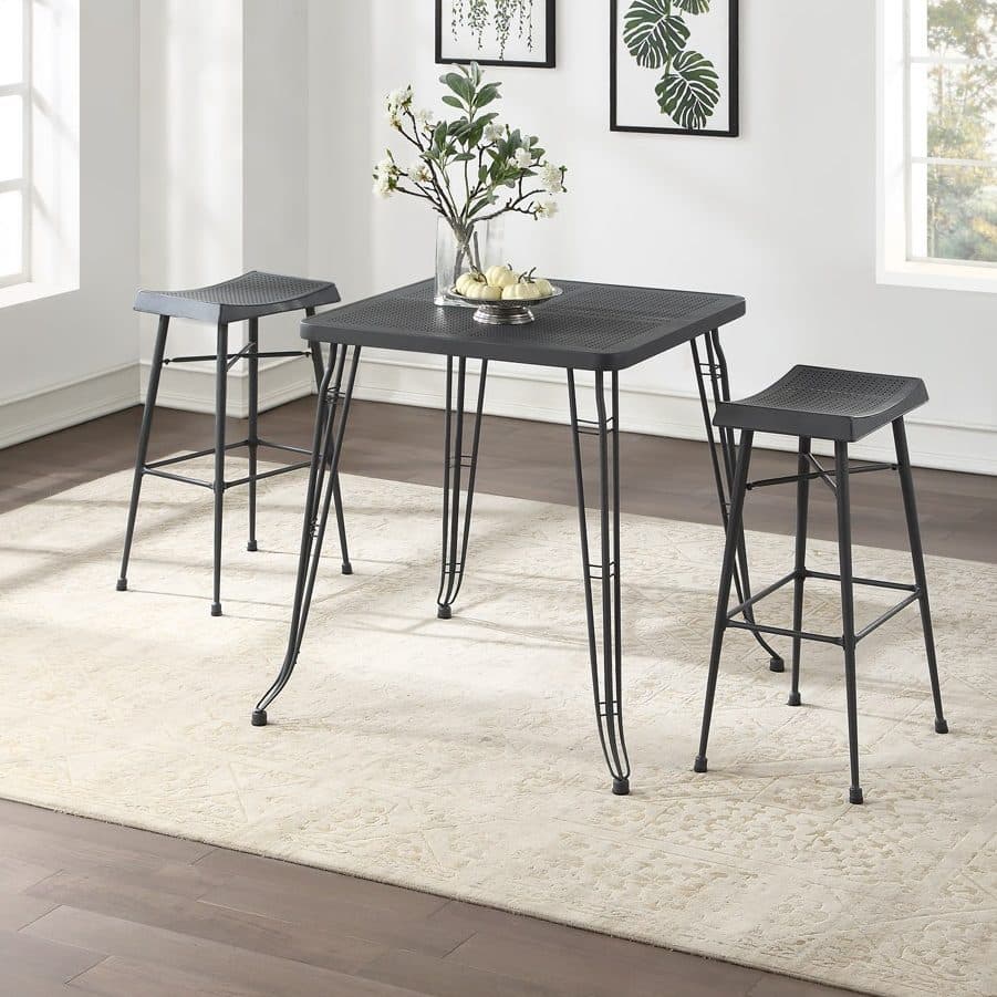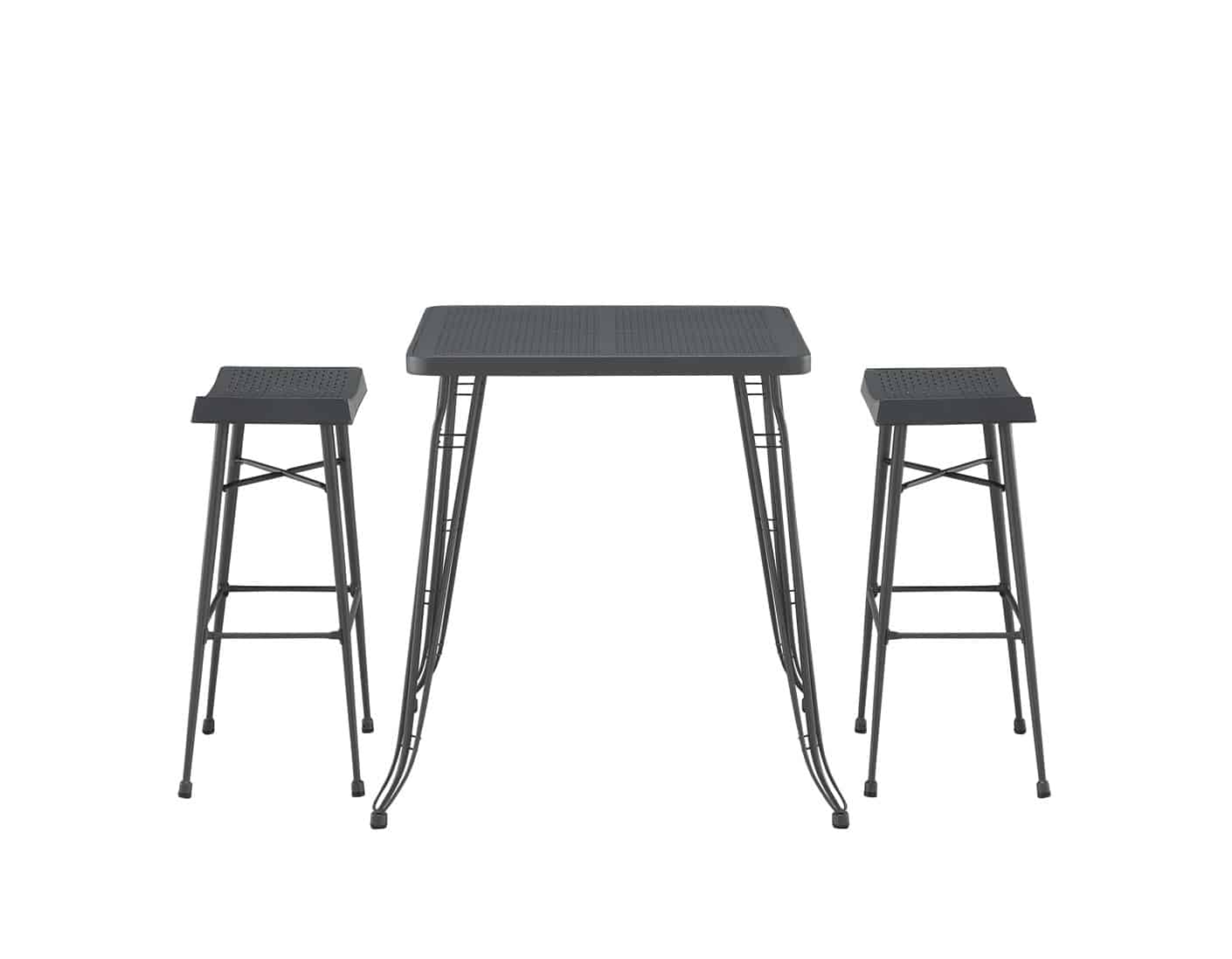 The Carson 3-Piece Pub Set immediately infuses your dining area with a dose of industrial cool. This 3-piece set is crafted entirely from steel with a gray finish. Perforated cutouts dot the stool seats and the tabletop, adding extra edge. The stool seats are molded for comfort and the built-in footrest adds stability and relaxation. Also available in 5-Piece Set. Ships ready to assemble with all hardware included.