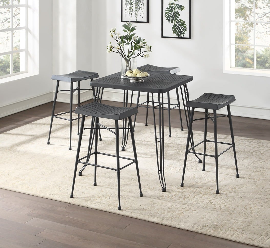Adding industrial edge is as easy as placing the Carson 5-Piece Pub Set in your dining room or breakfast area. This 5-piece set is crafted from 100% steel with decorative perforated cutouts dotting the seat and tabletop. The stool seats are molded for comfort and the built-in footrests add stability and relaxation. Floor glides on the metal feet protect against damage to your floors. Also available in 3-Piece Set. Ships ready to assemble with all hardware included.