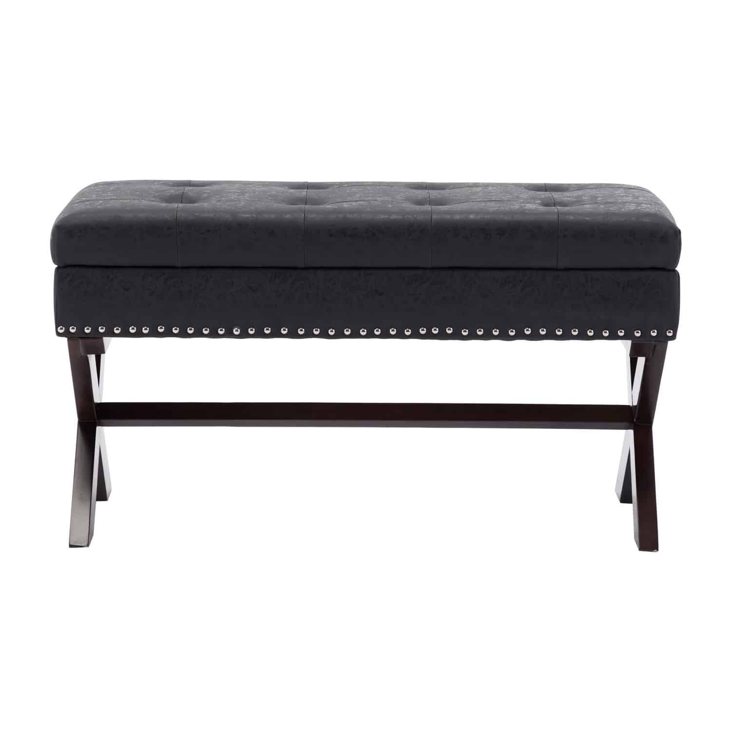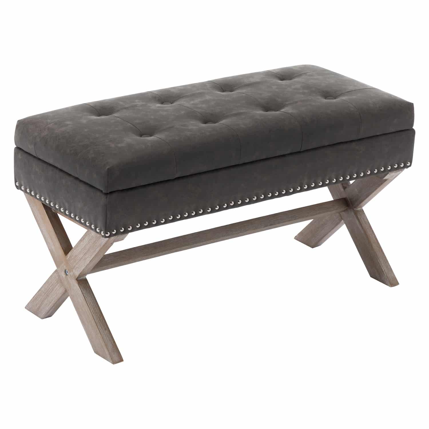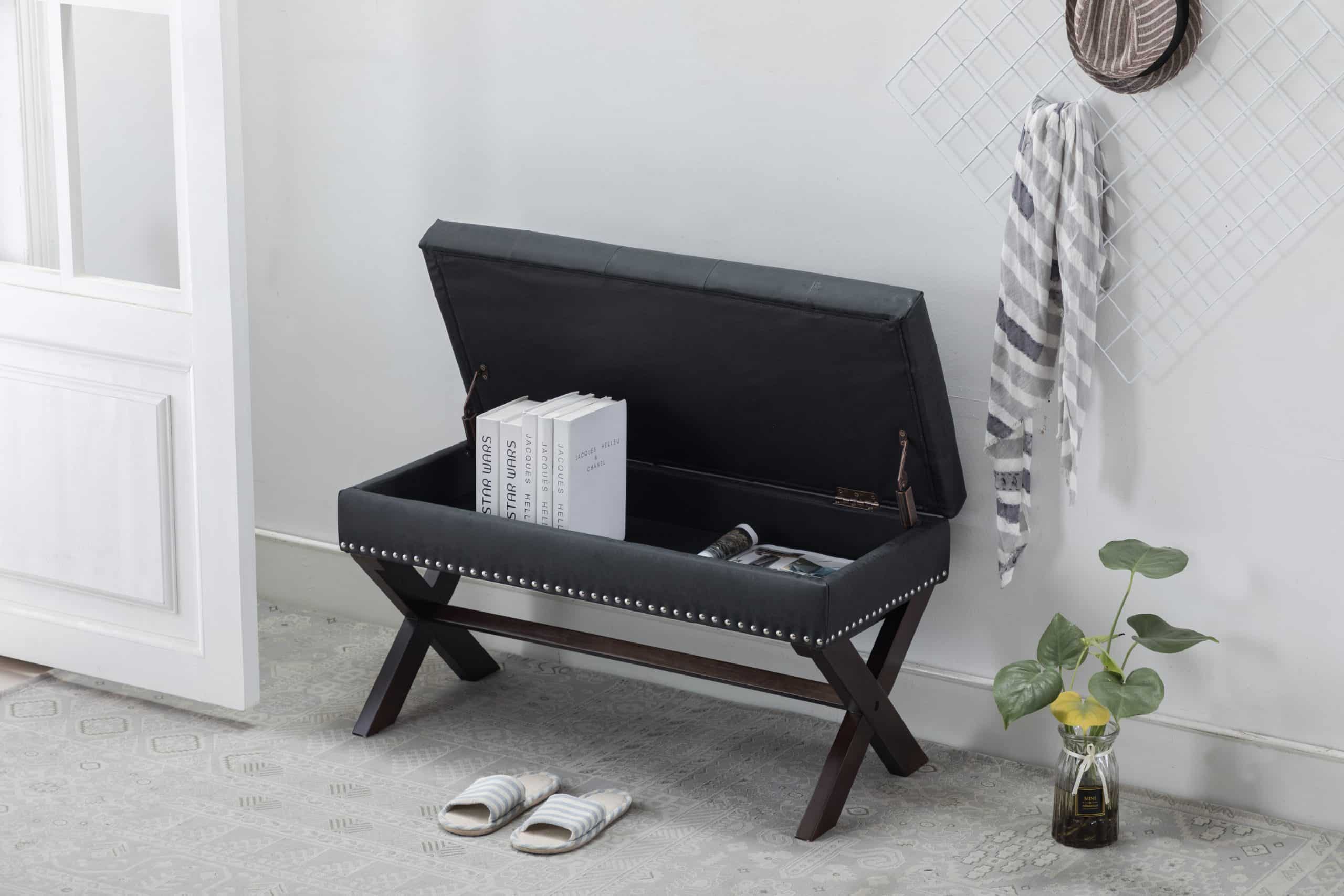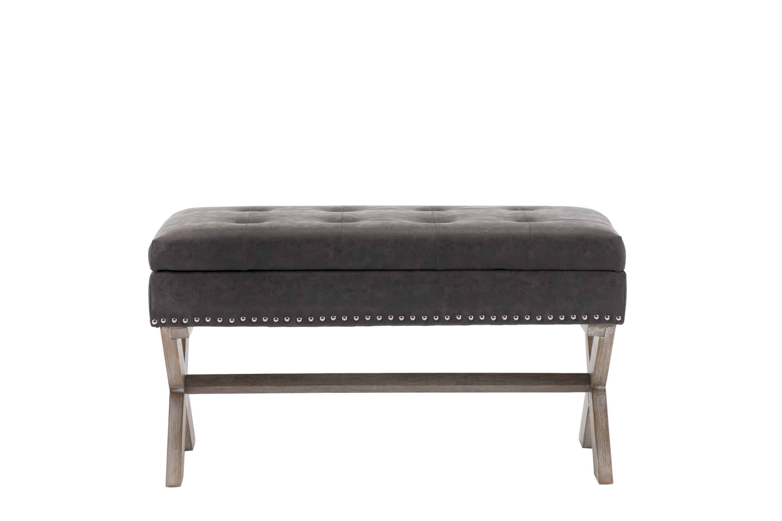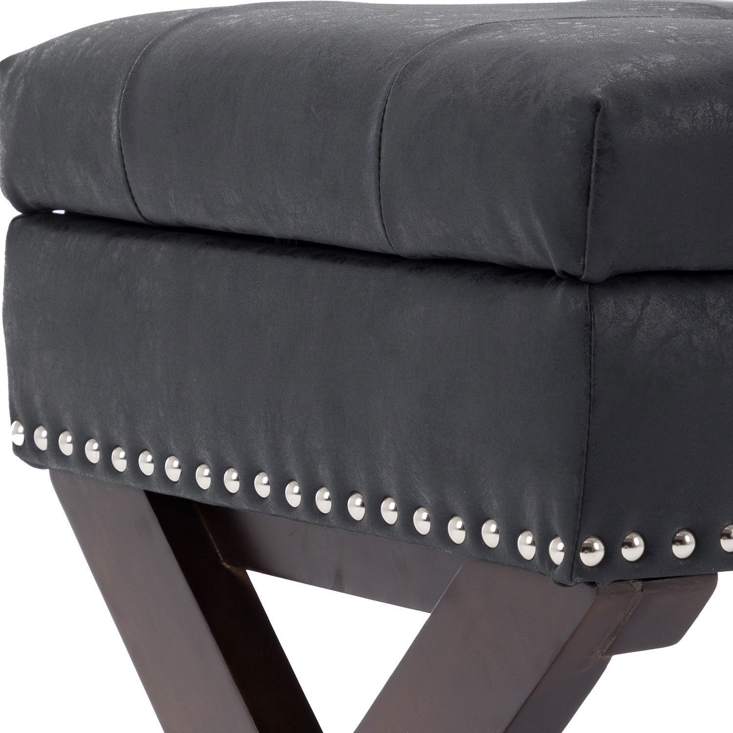 Available in two finished; black and gray. Upholstered, nail head trim, X-shaped legs.