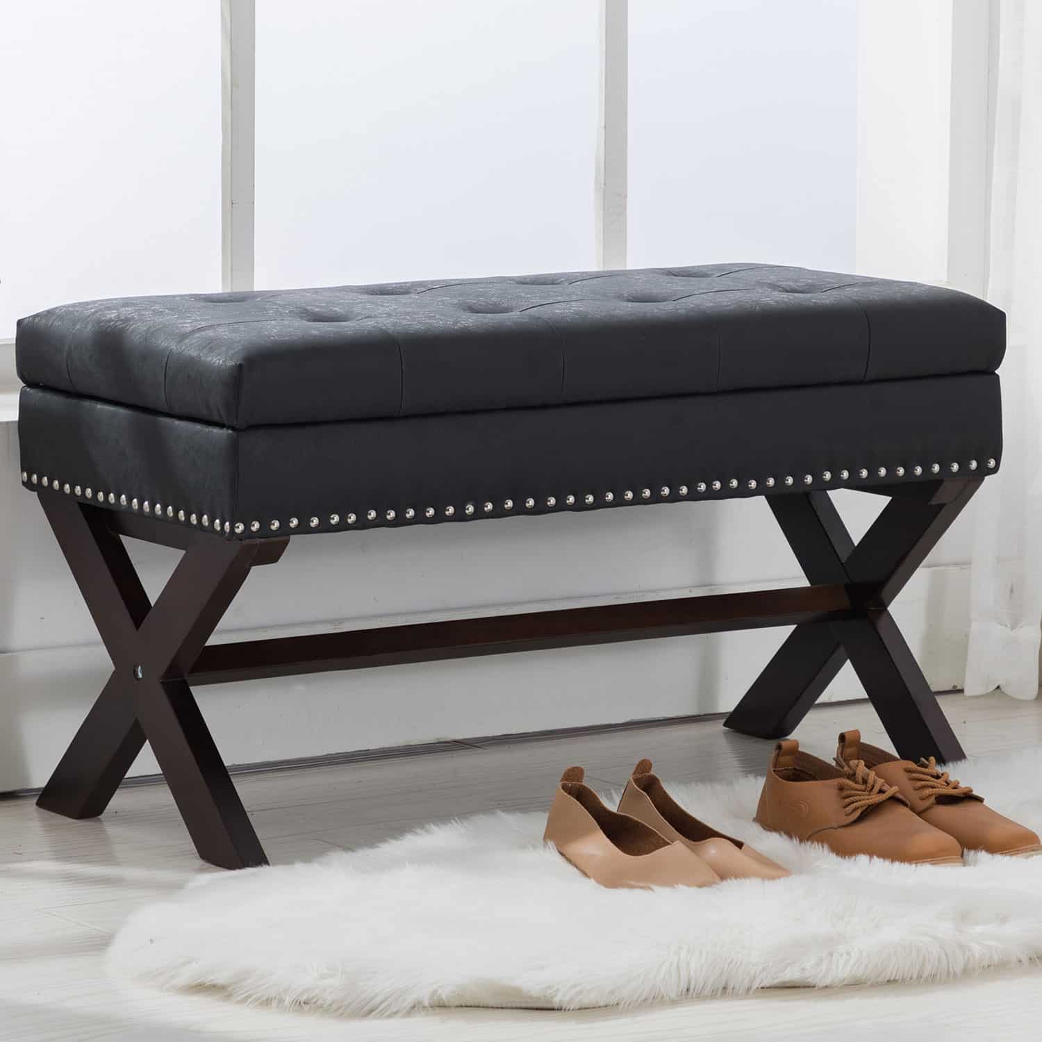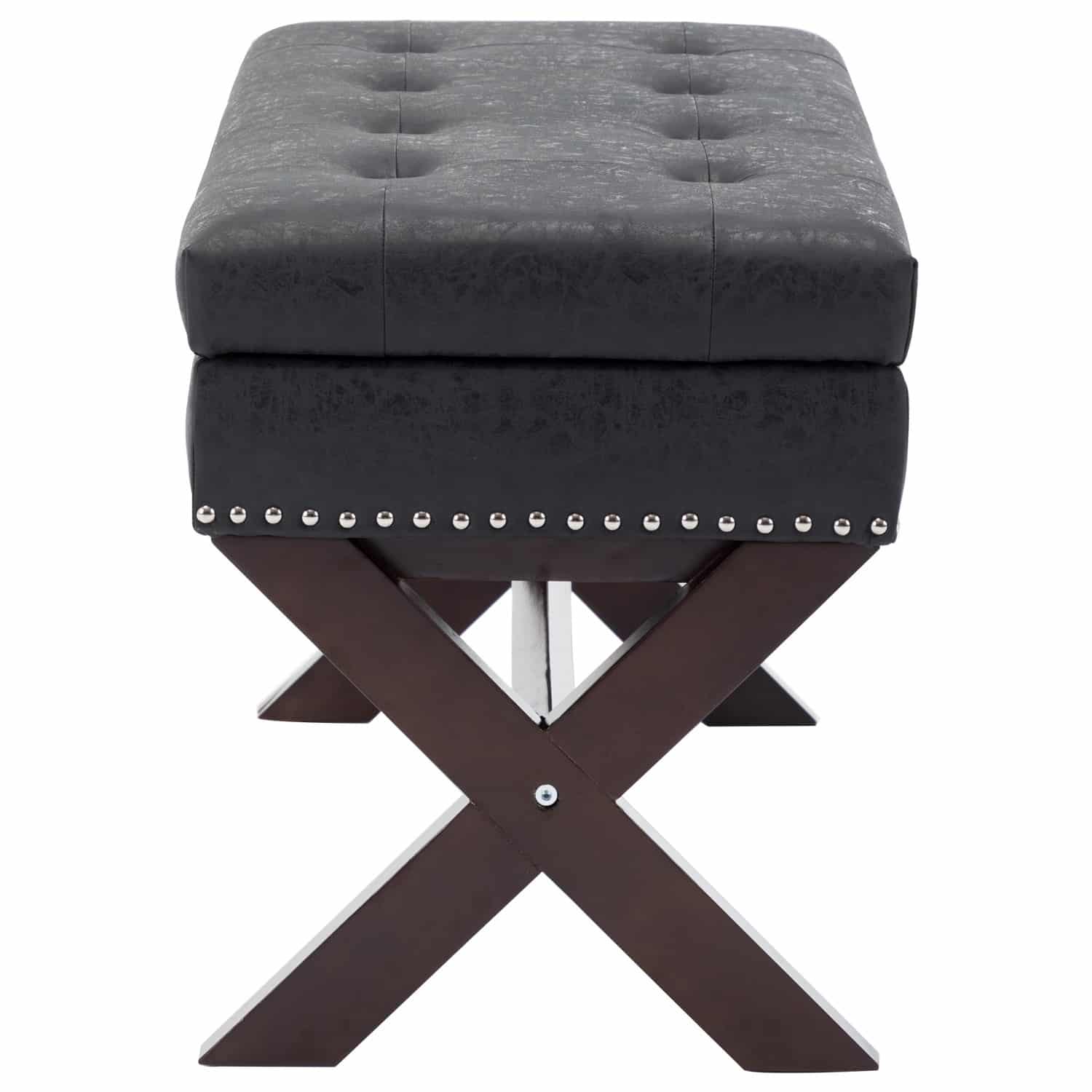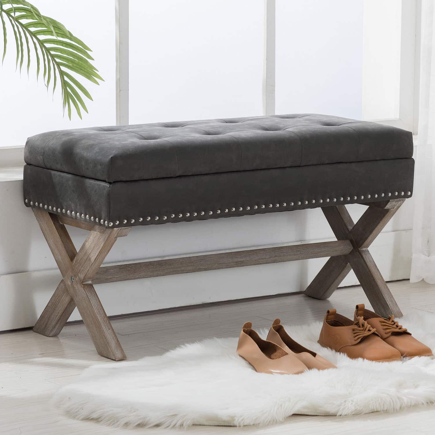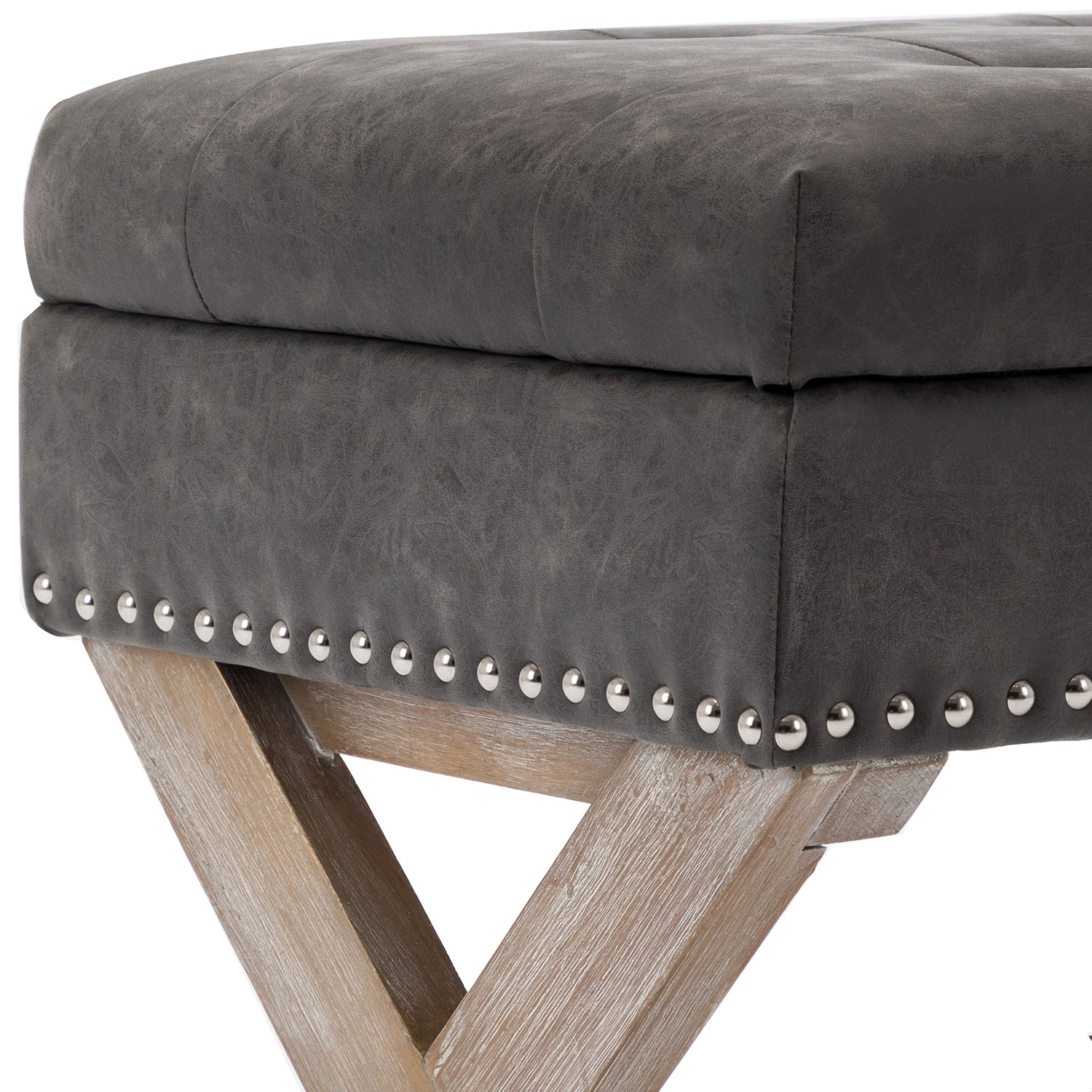 Available in two finished; black and gray. Upholstered, nail head trim, X-shaped legs.