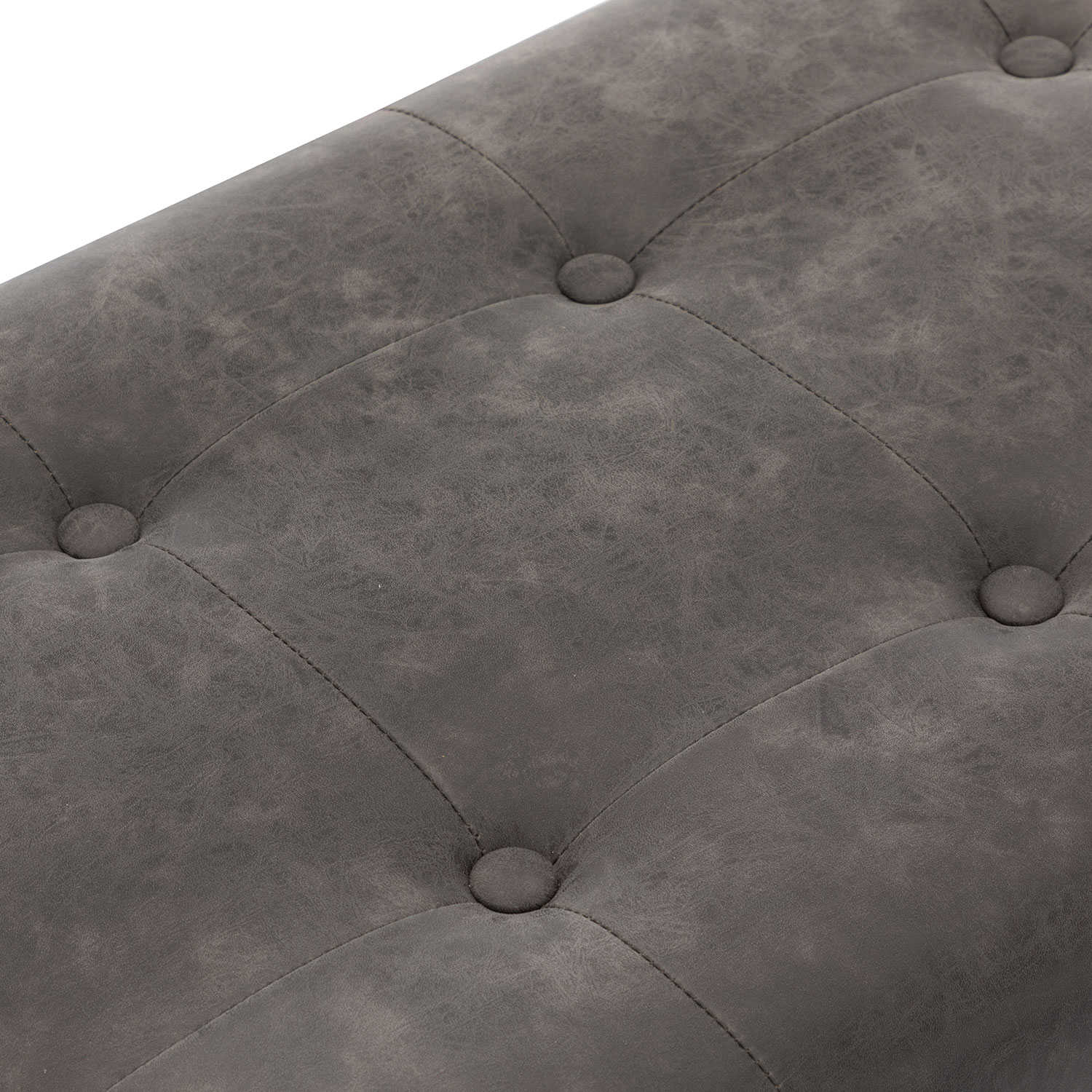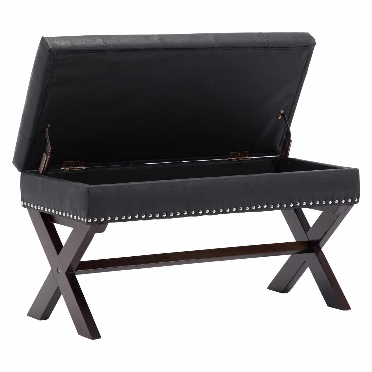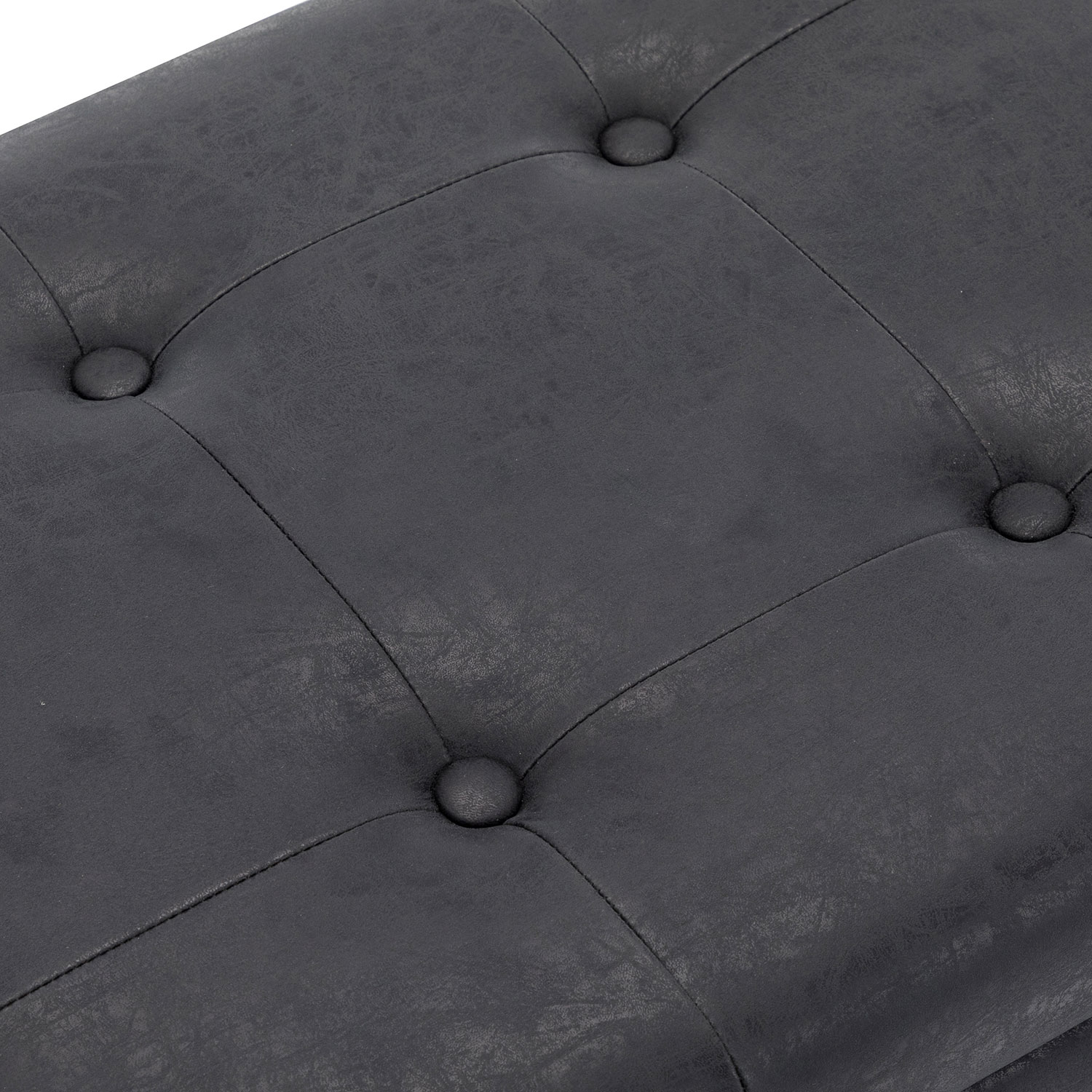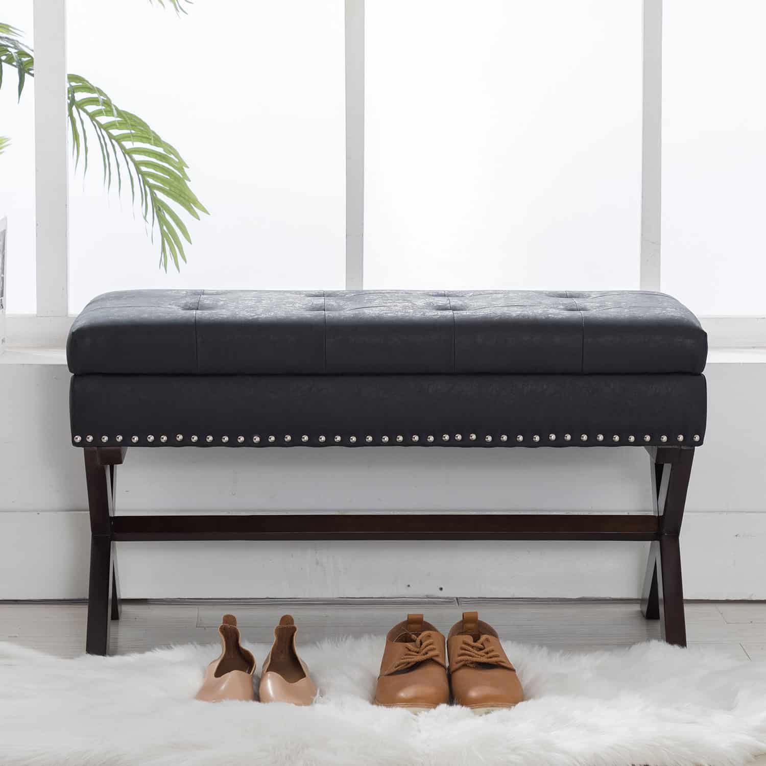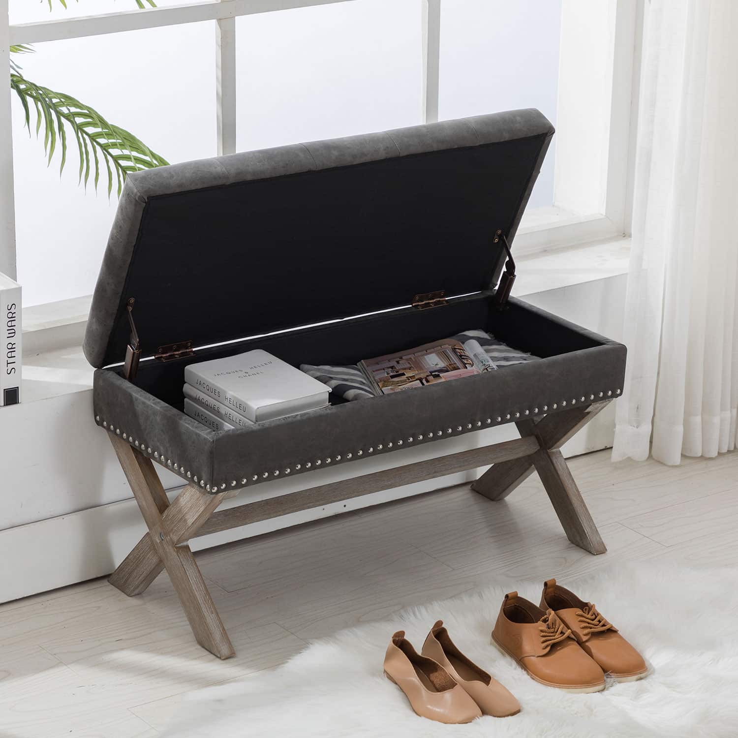 Available in two finished; black and gray. Upholstered, nail head trim, X-shaped legs.