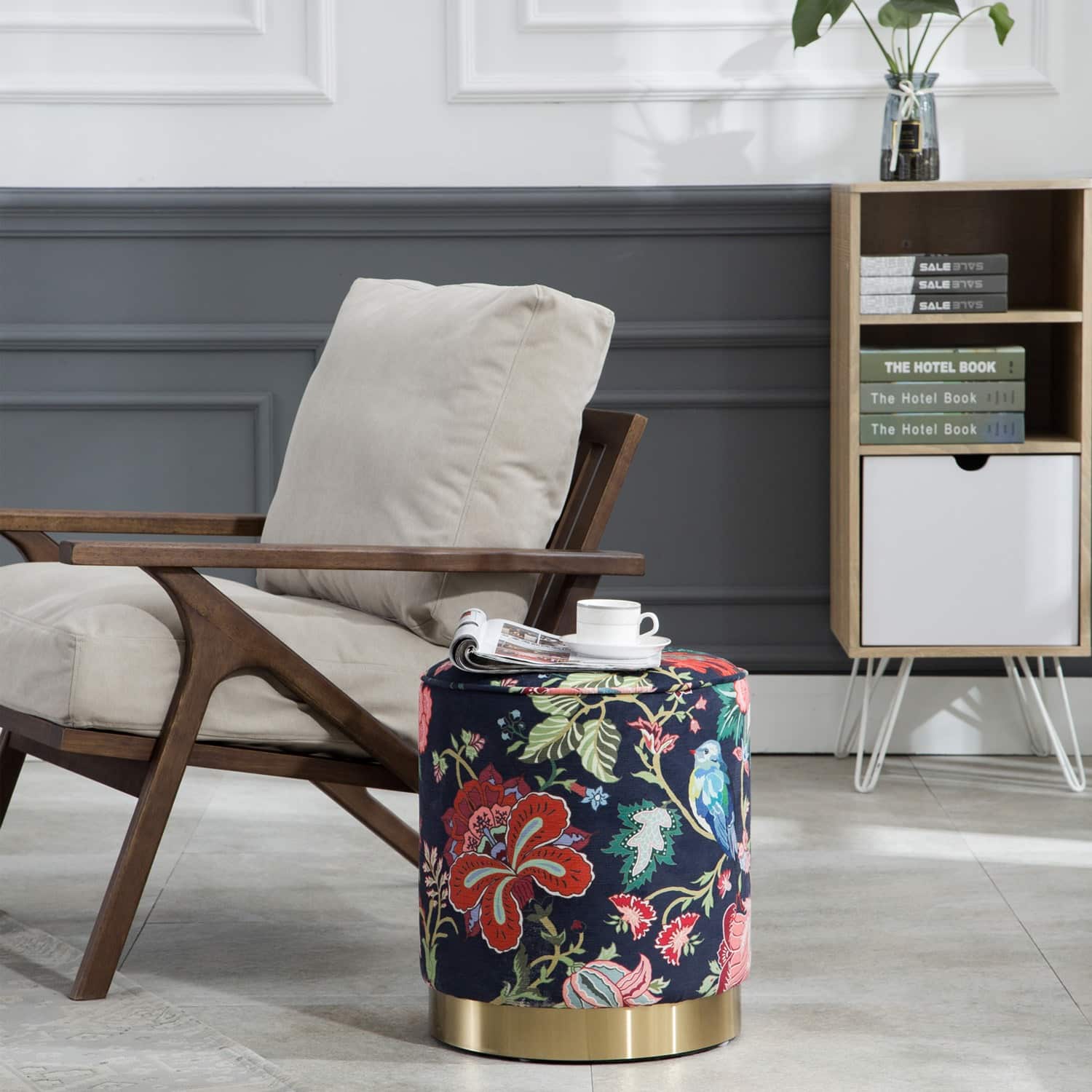 Unique flannel ottoman in terms of style. It is constructed with a flannel and sponge top and sides with an iron base. Available in three finishes; green, ivory, and floral. It is a perfect addition to your bedroom or living room. No assembly required.