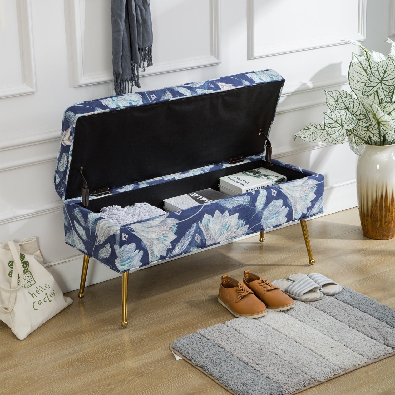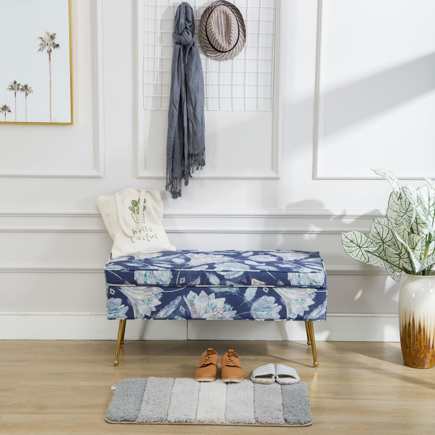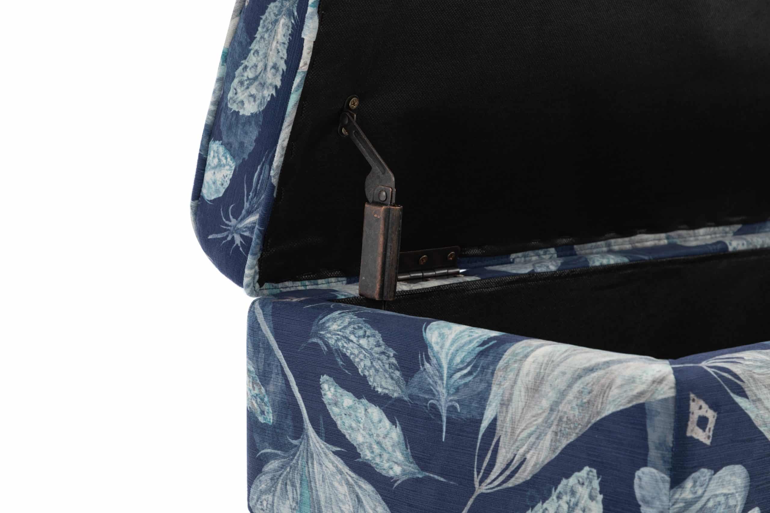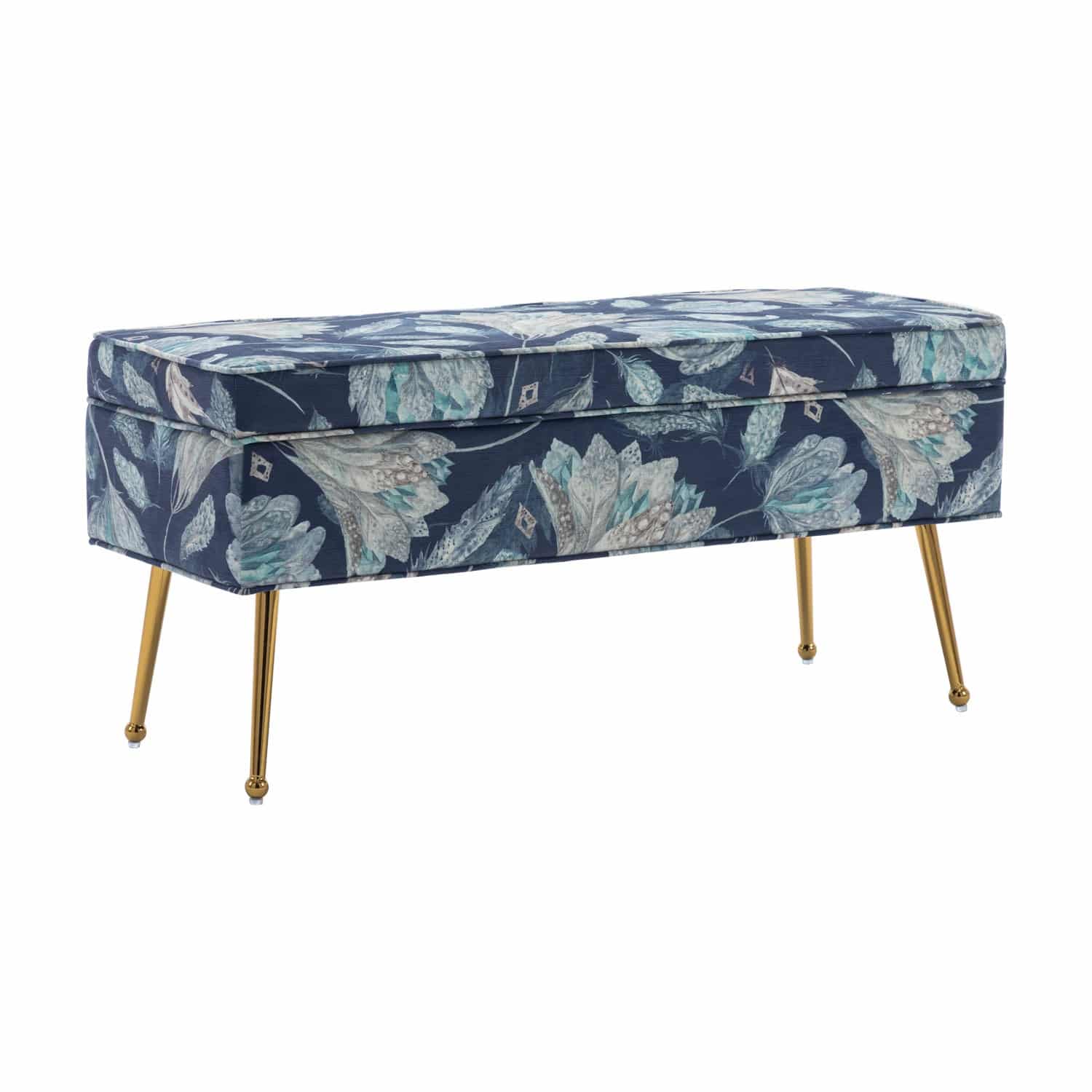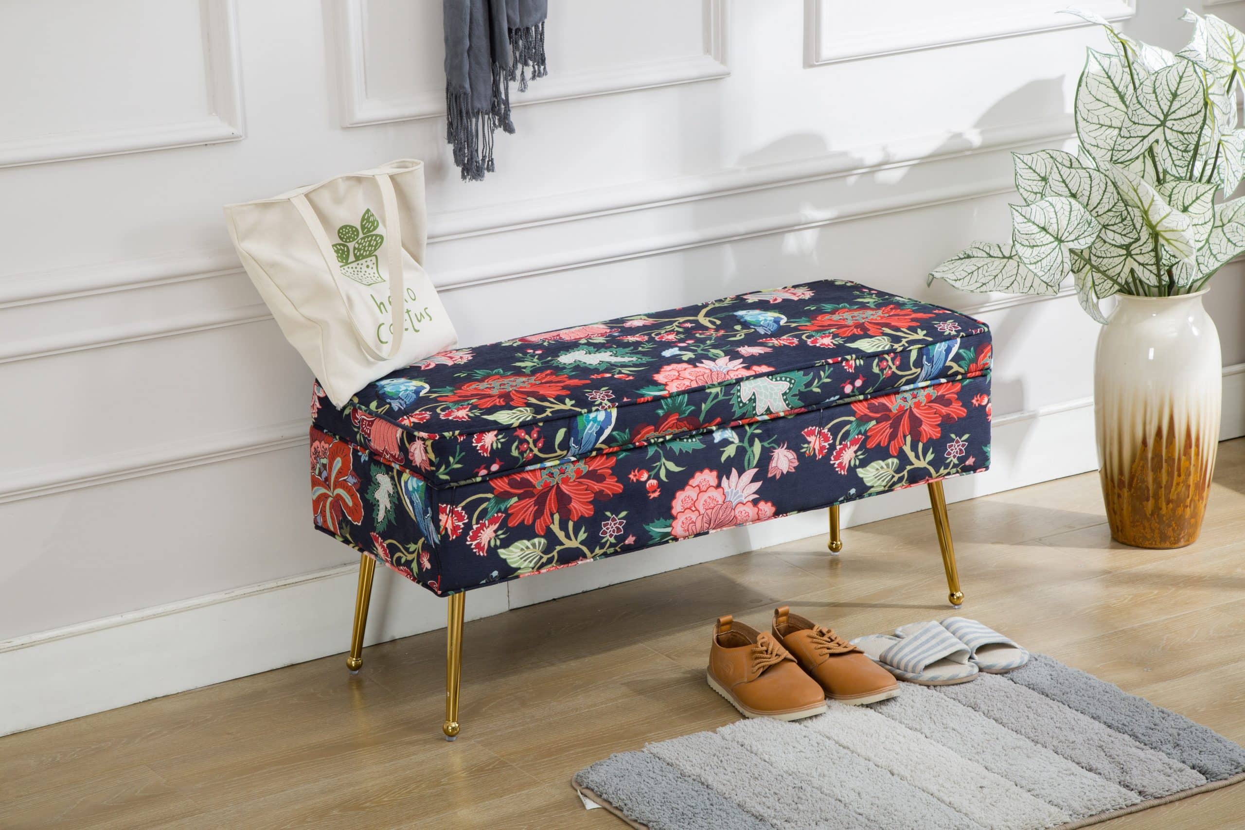 Large storage bench that would be a great addition into your bedroom or living room. It is available in four finishes; gray, ivory, floral, and navy floral. It is constructed with flannel, sponge, and iron legs. The top opens up for the large storage area.