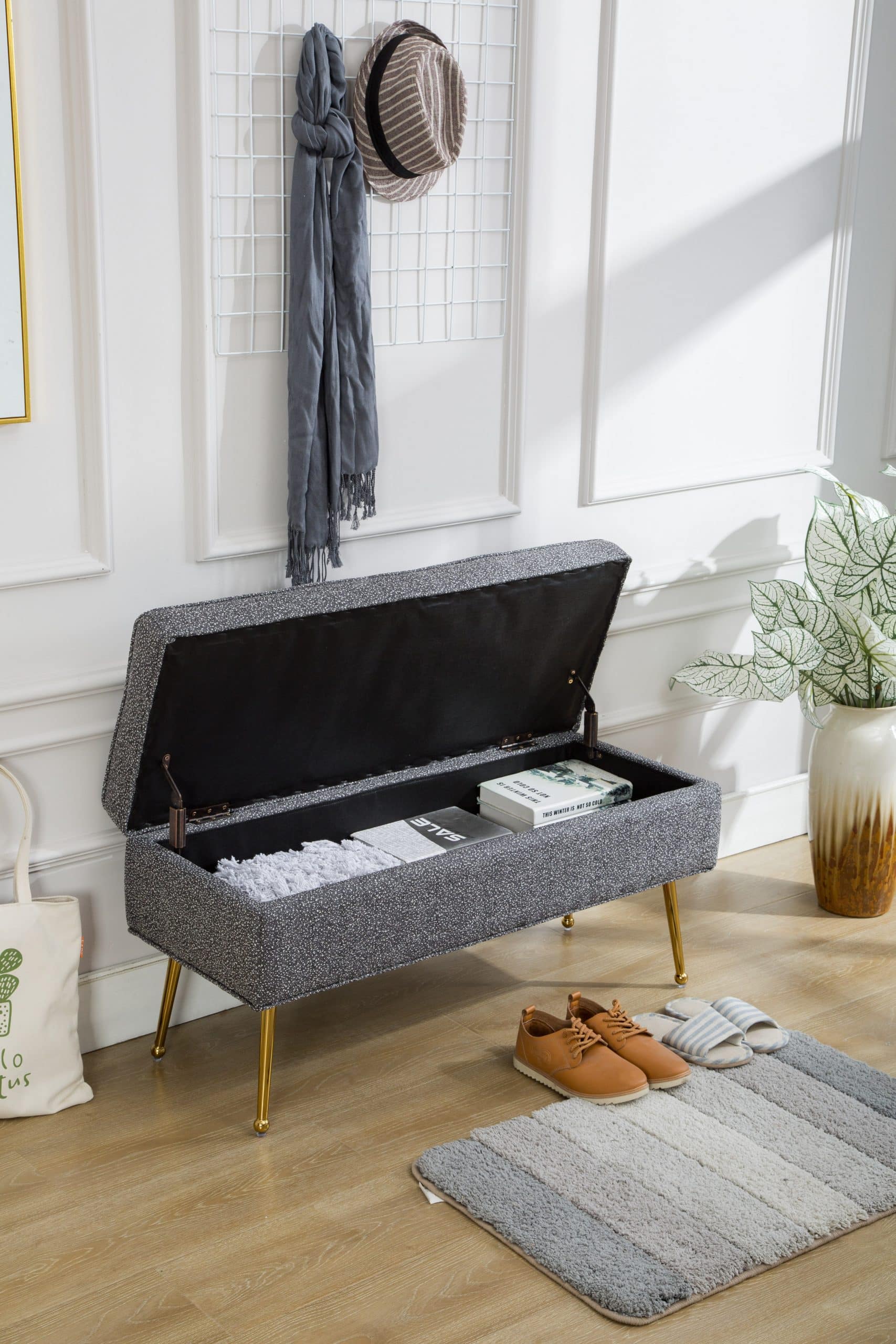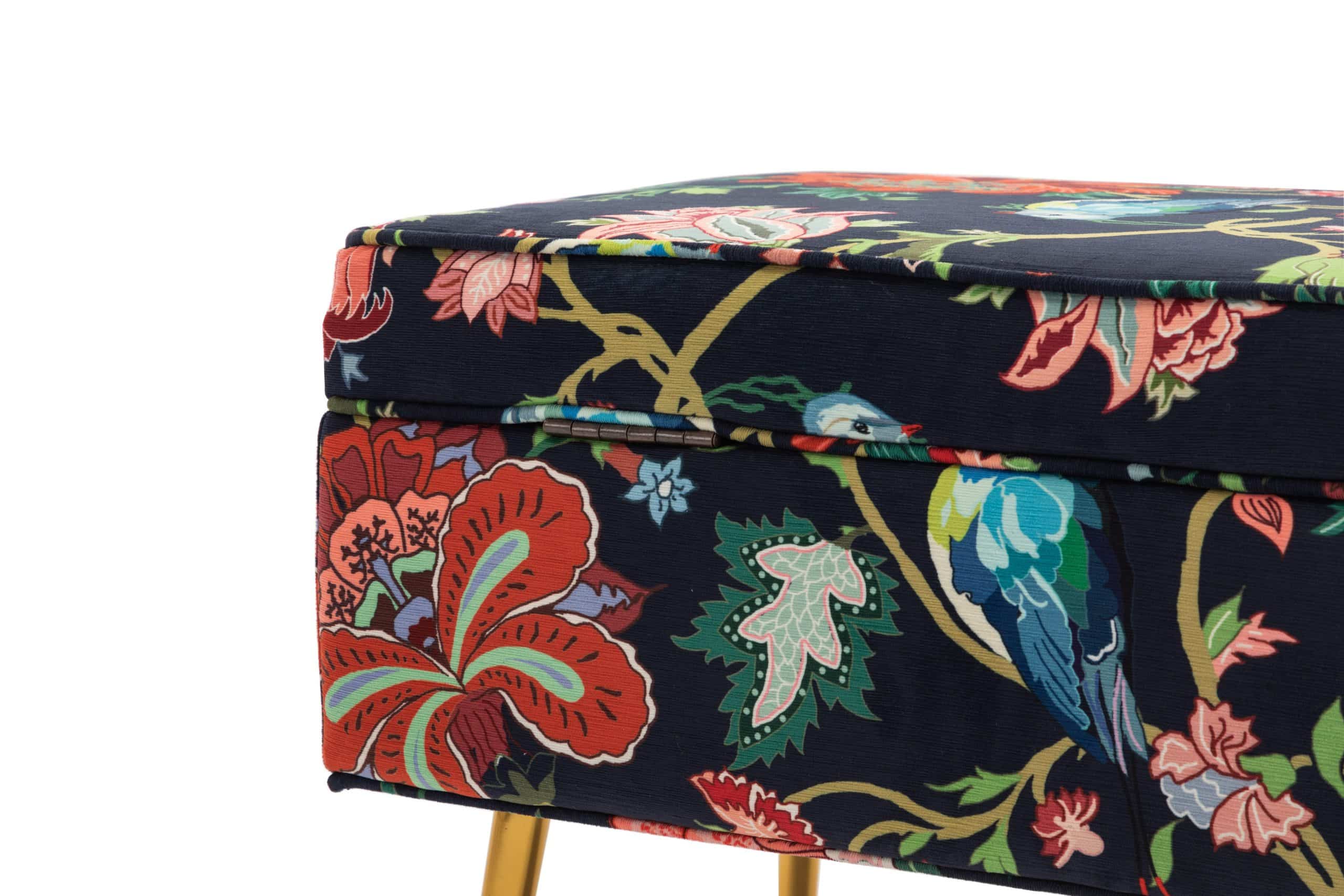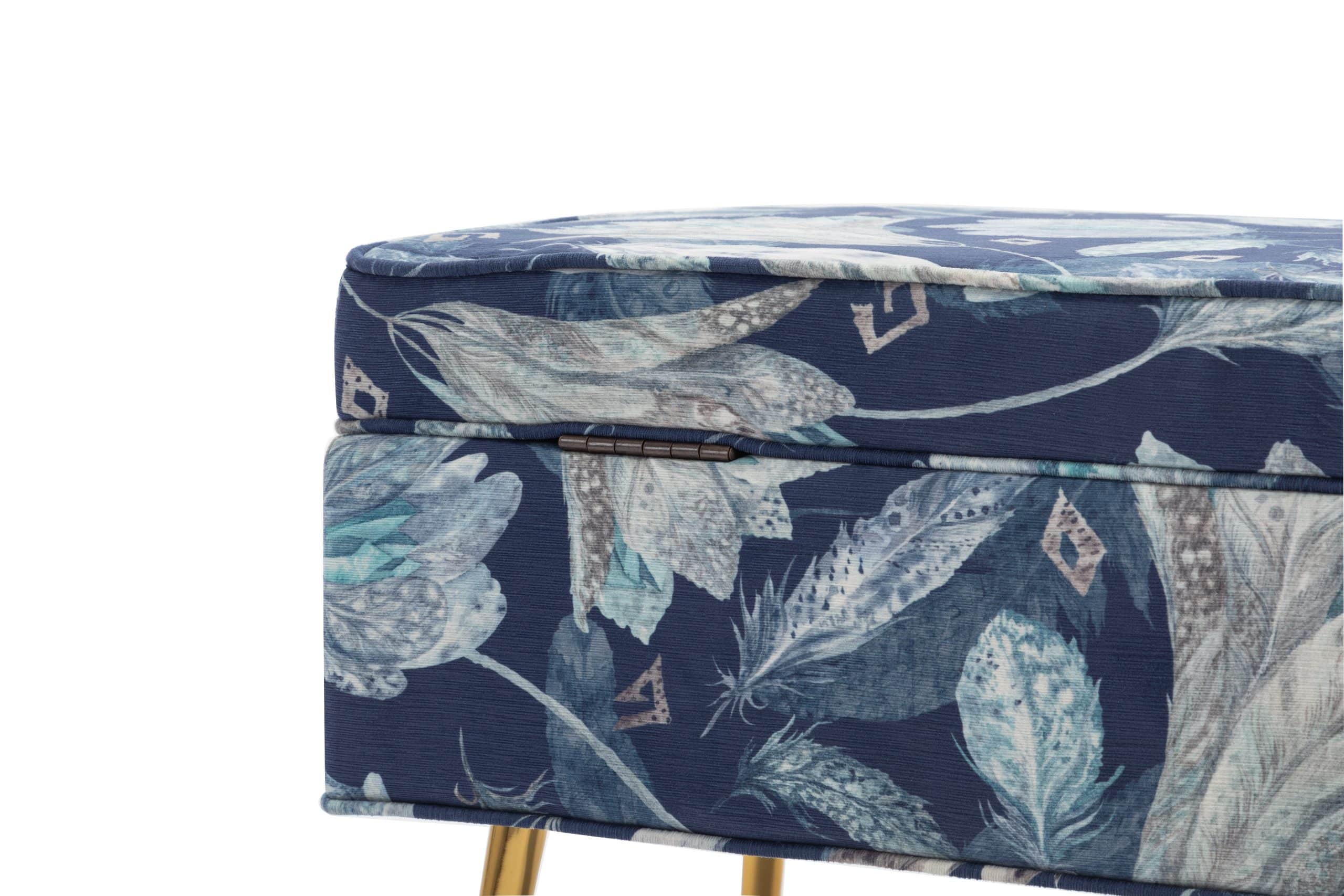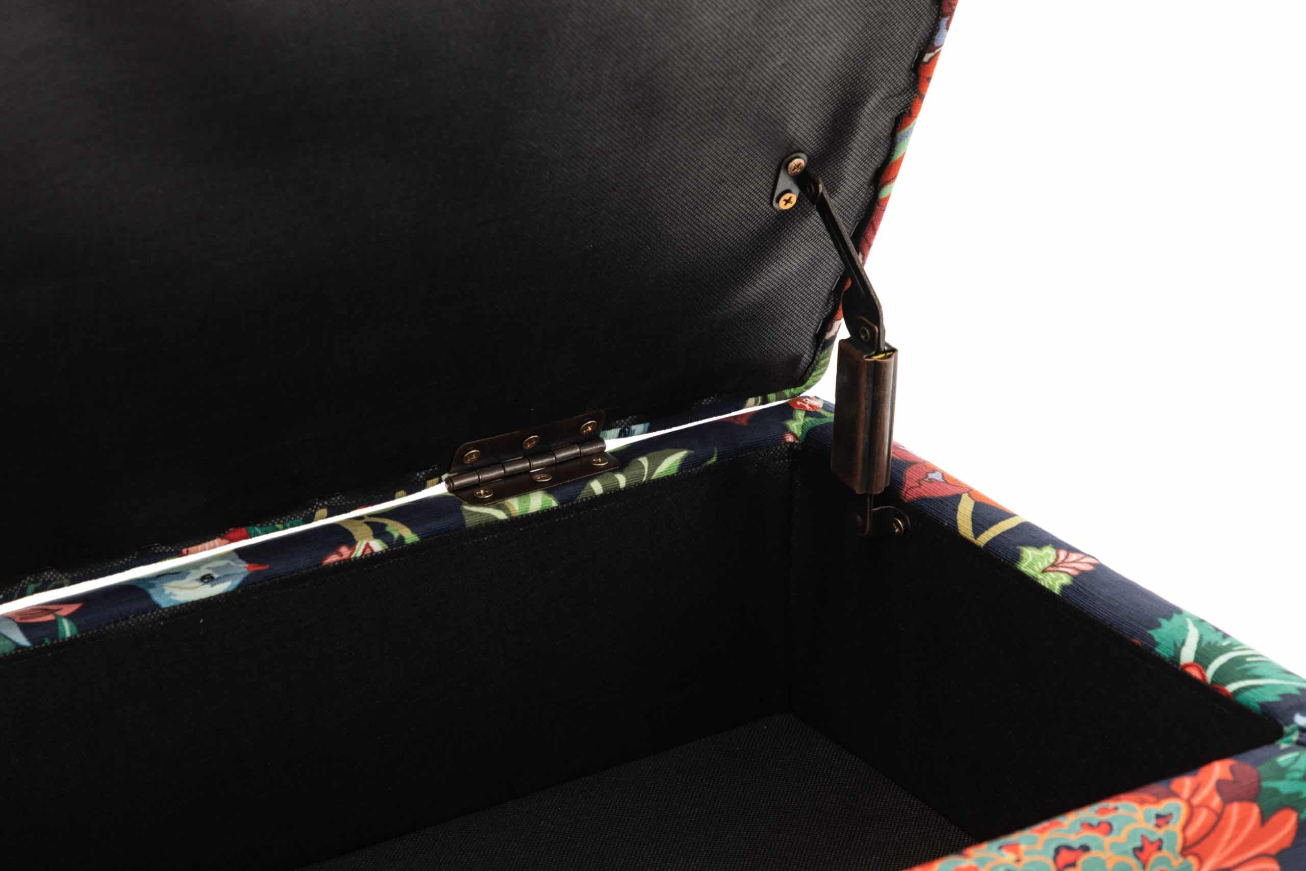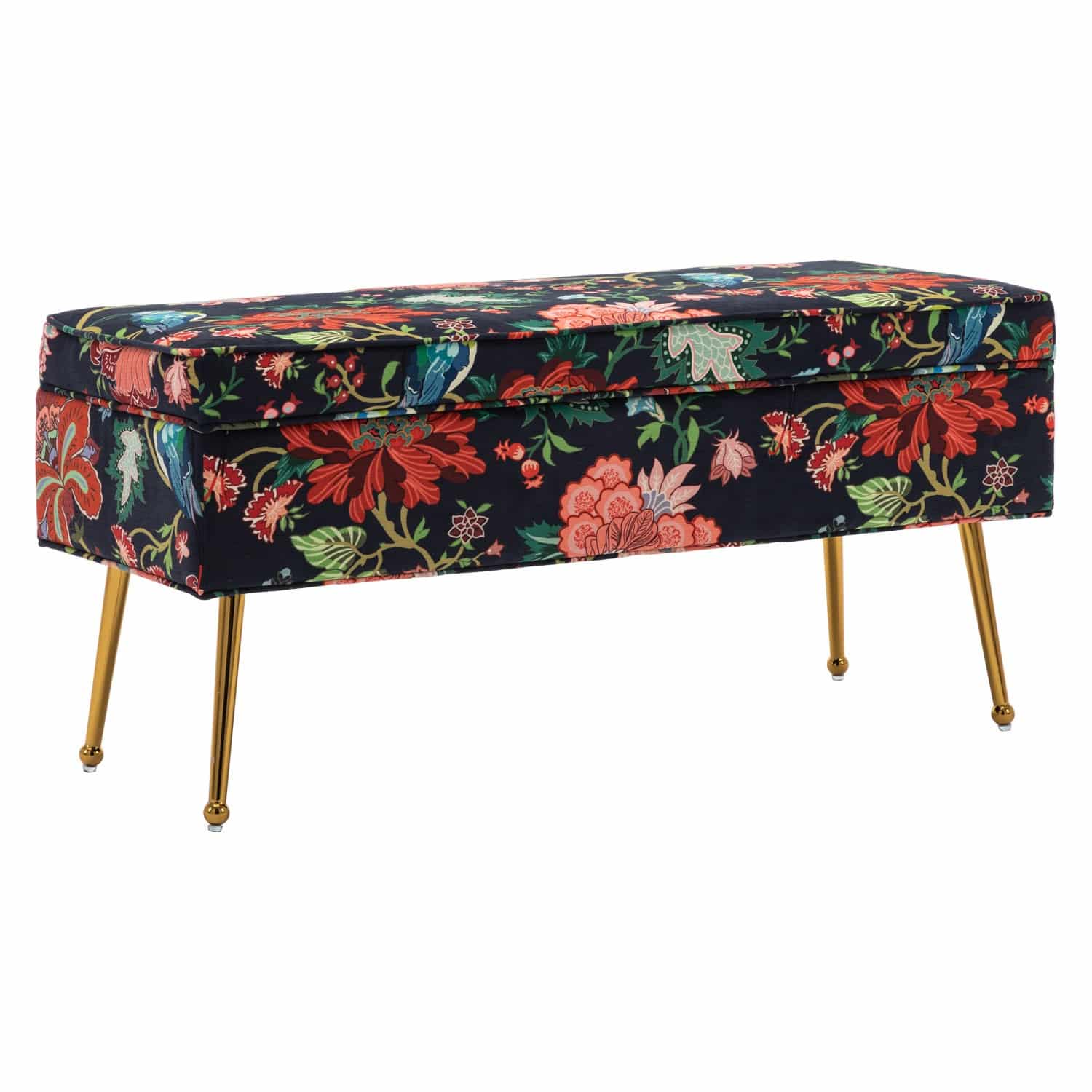 Large storage bench that would be a great addition into your bedroom or living room. It is available in four finishes; gray, ivory, floral, and navy floral. It is constructed with flannel, sponge, and iron legs. The top opens up for the large storage area.