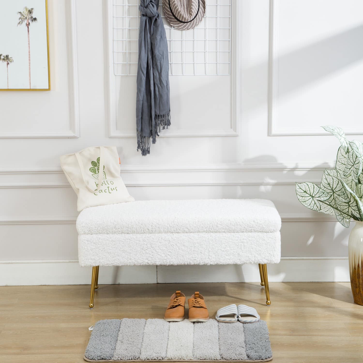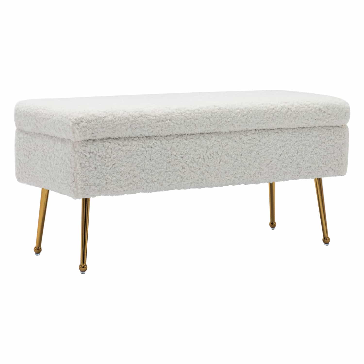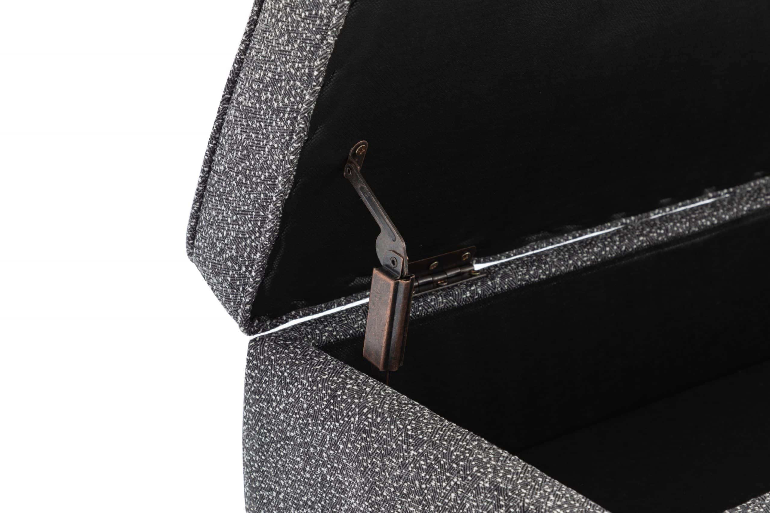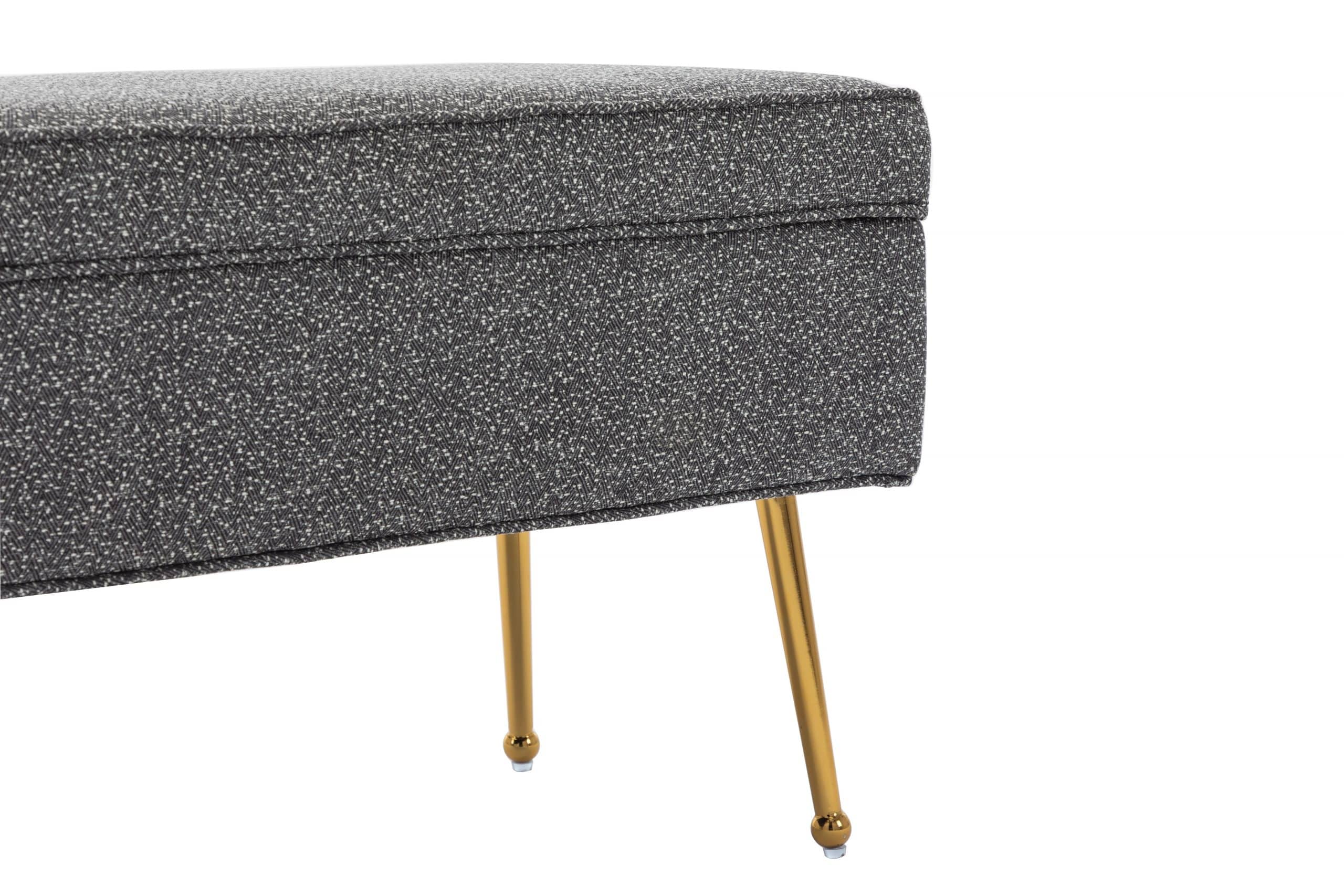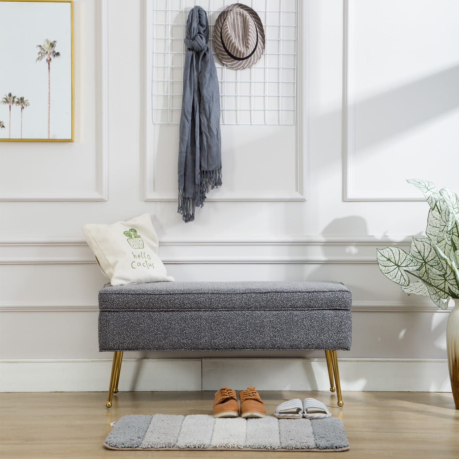 Large storage bench that would be a great addition into your bedroom or living room. It is available in four finishes; gray, ivory, floral, and navy floral. It is constructed with flannel, sponge, and iron legs. The top opens up for the large storage area.