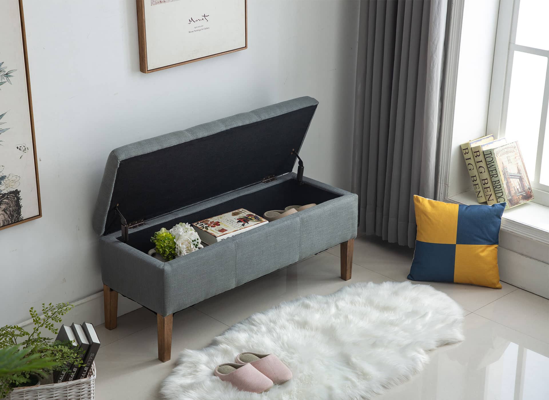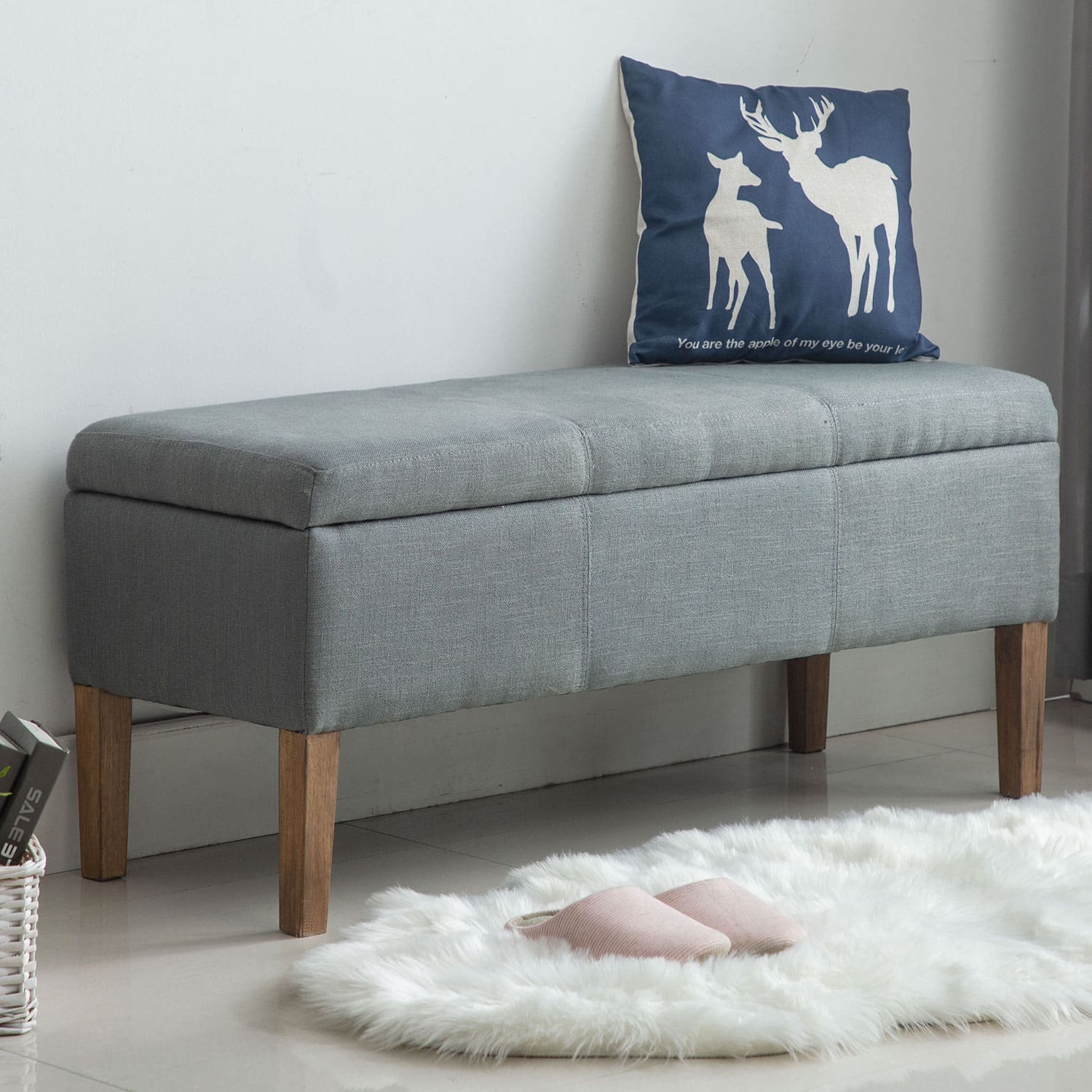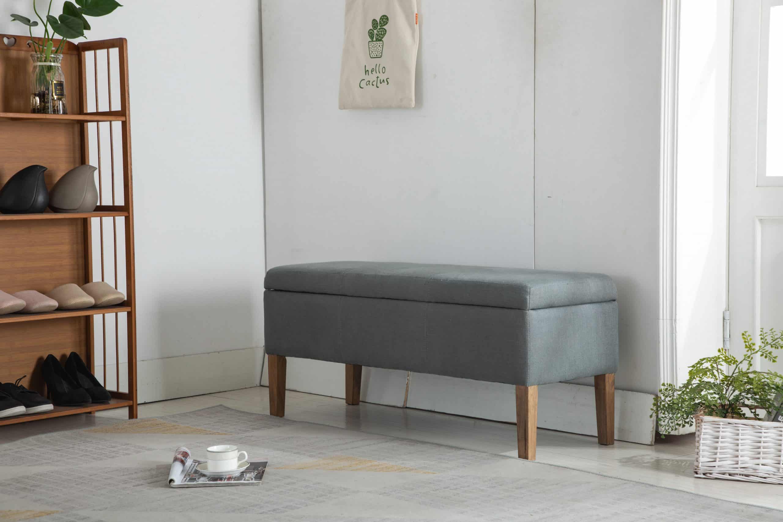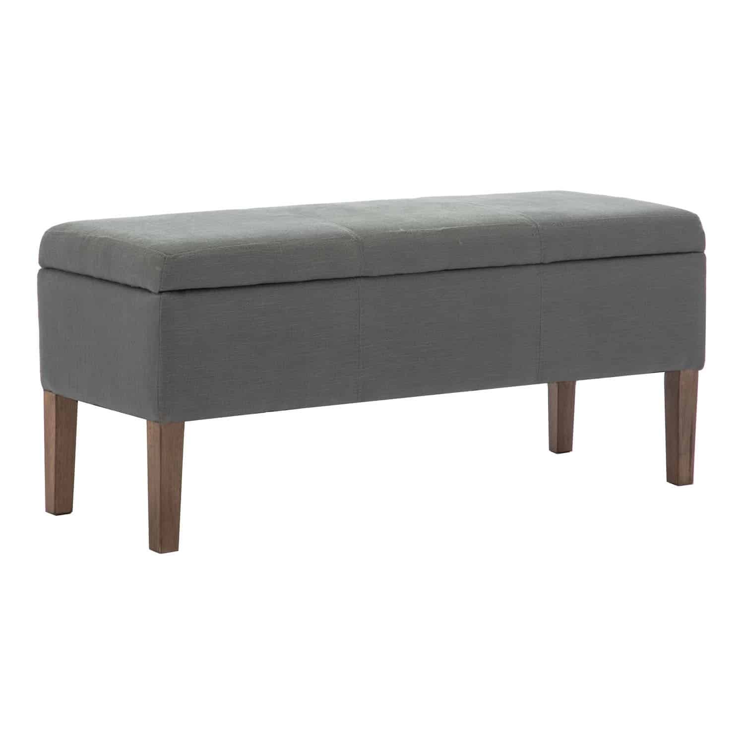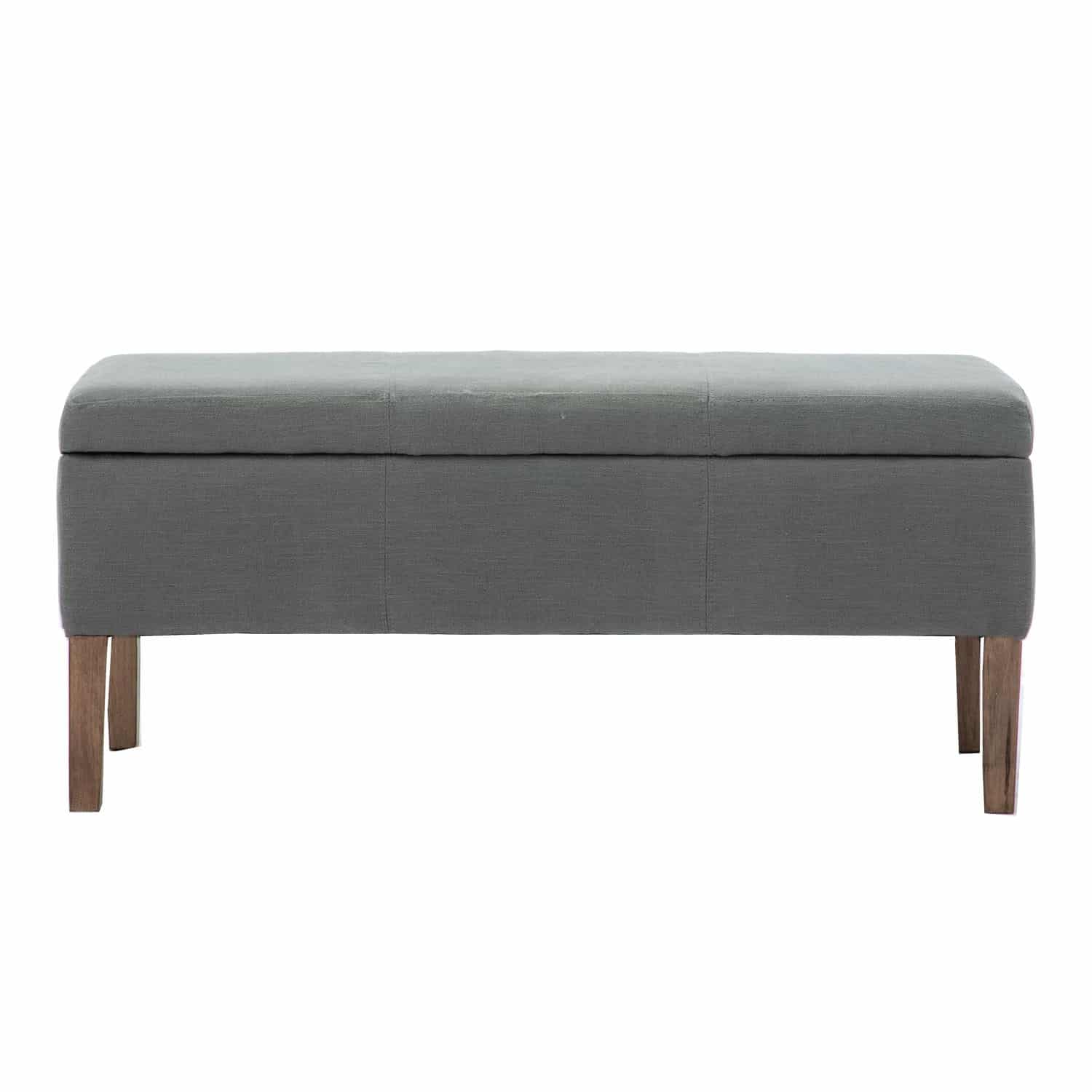 Gray finish, more storage than other benches, constructed with wood and fabric.