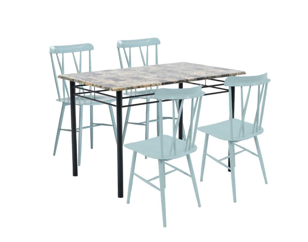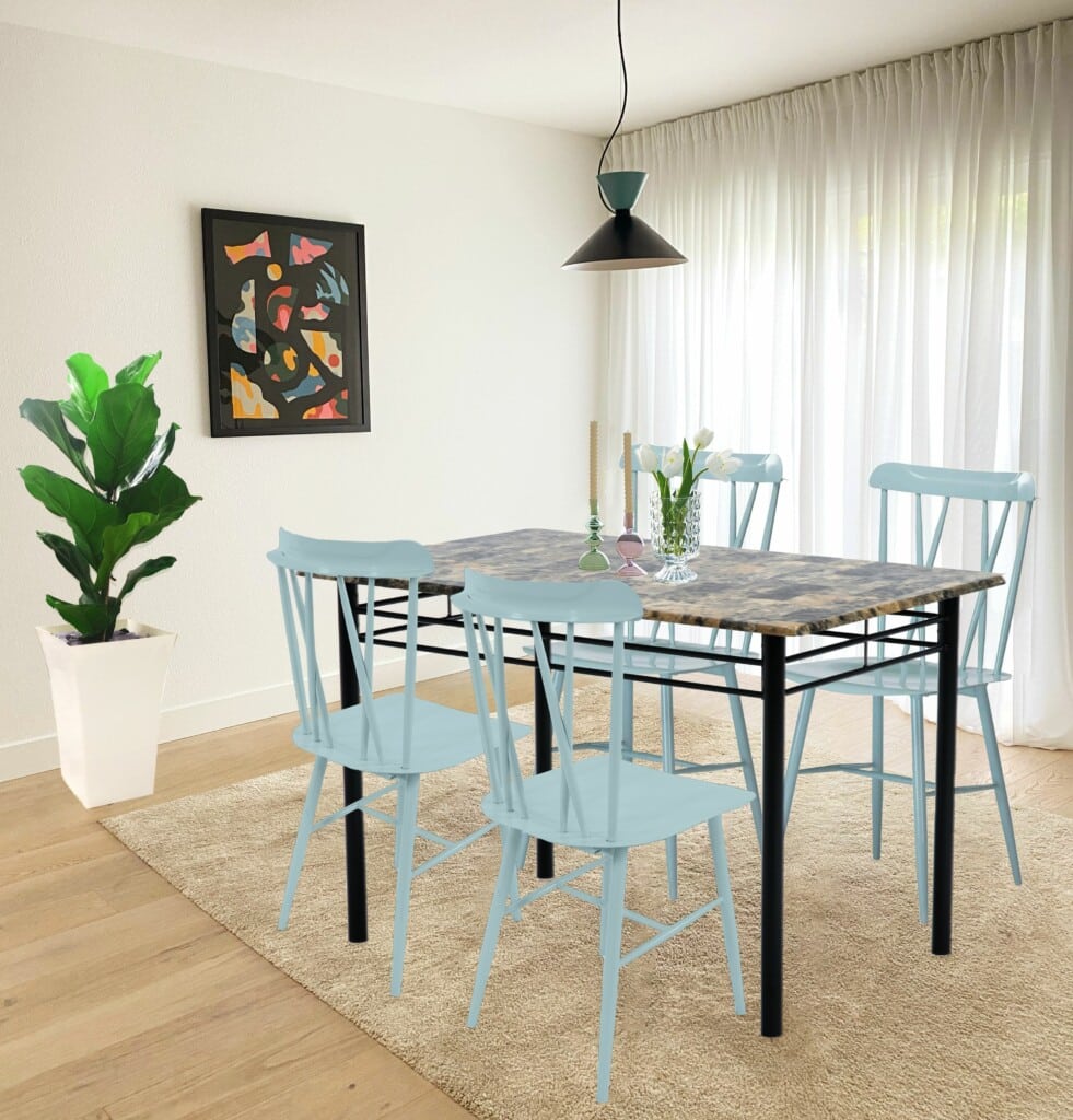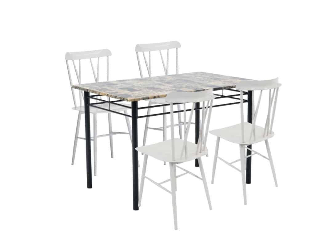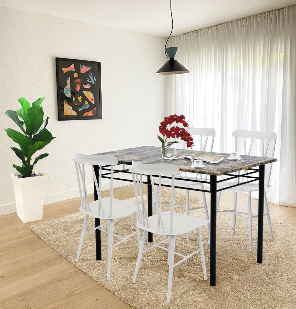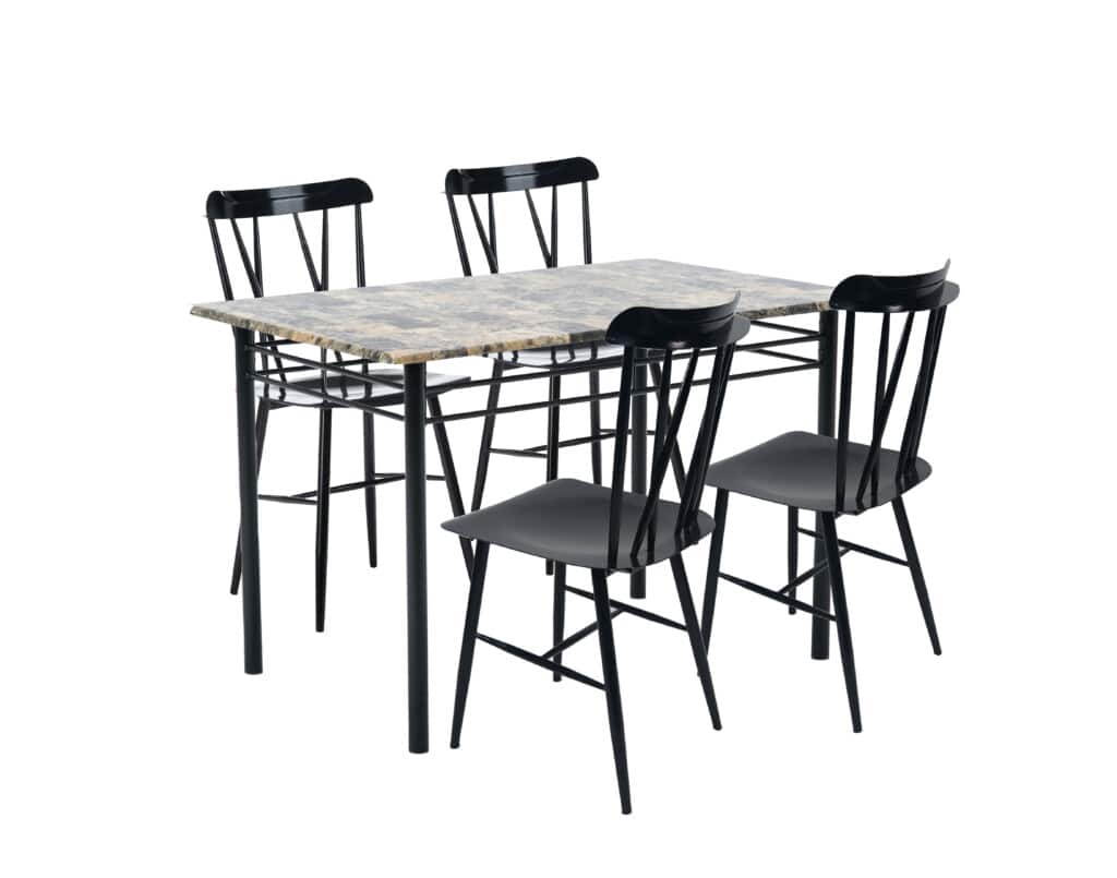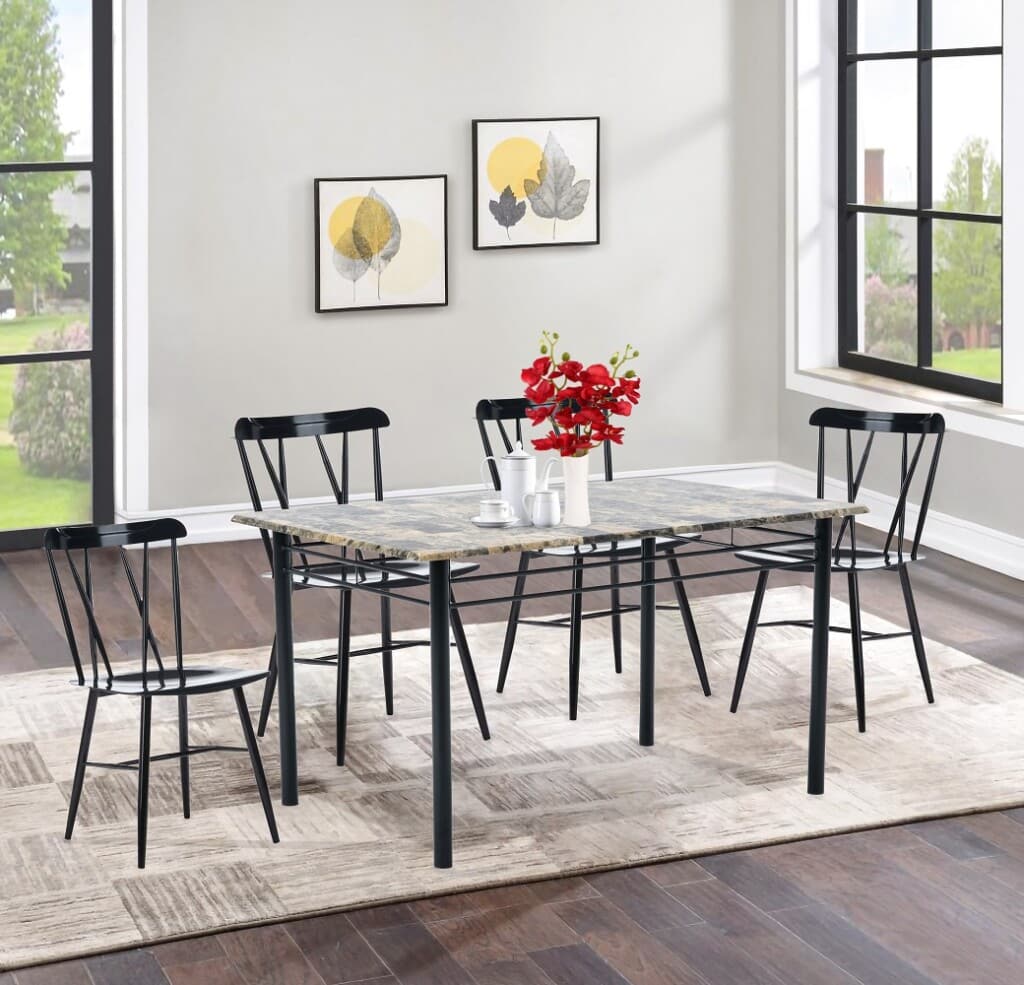 Whether hosting a dinner party with close friends or enjoying an everyday meal with the family, this 5-piece dining set is a must-have for your home. The dining table strikes a rectangular silhouette and is crafted from a black metal frame and a faux marble tabletop. The four metal dining chairs each feature an open double-x style back. The dining table set is suitable for any space in your home. Spend quality time with your family, make life elegant and practical, and enjoy life in this moment.