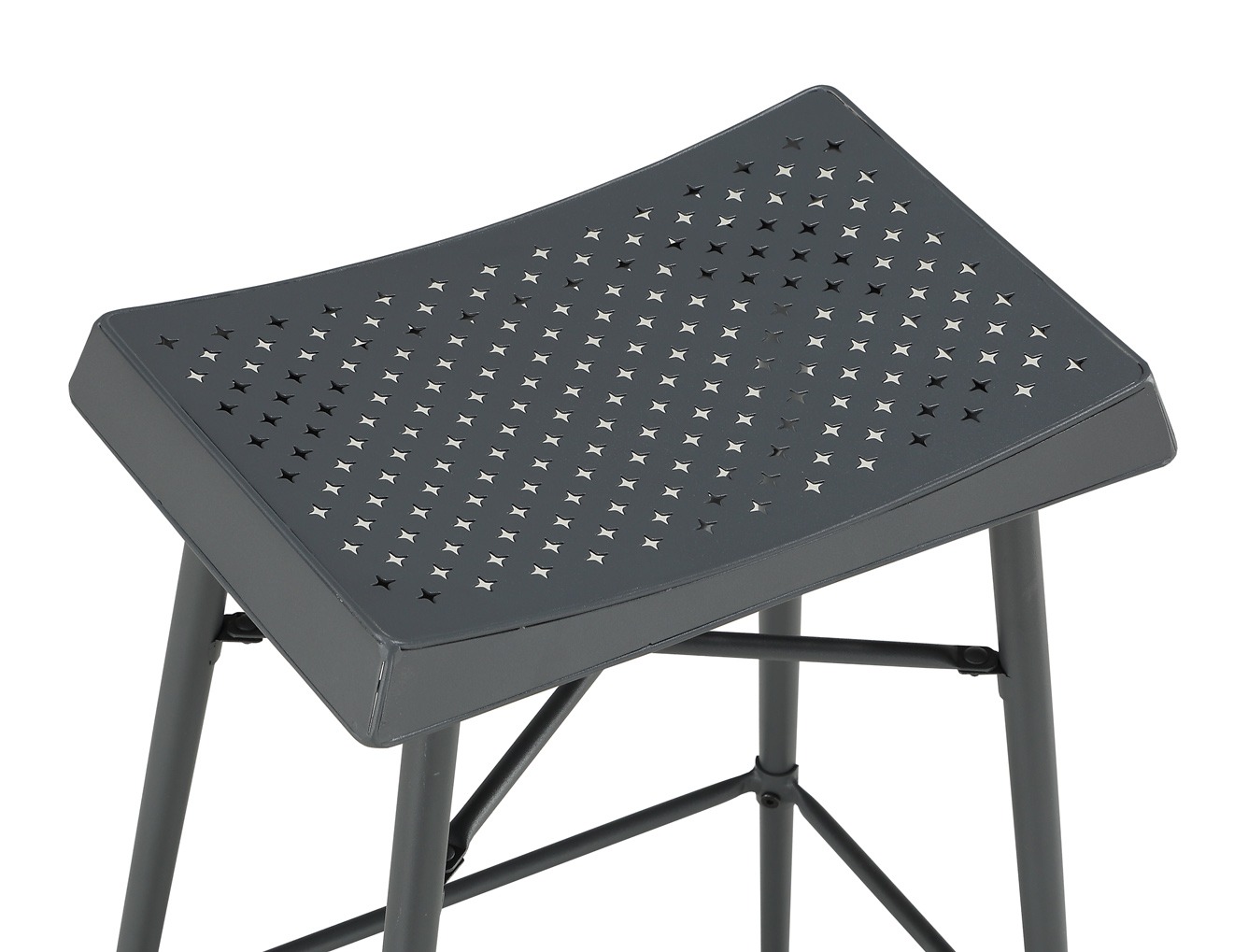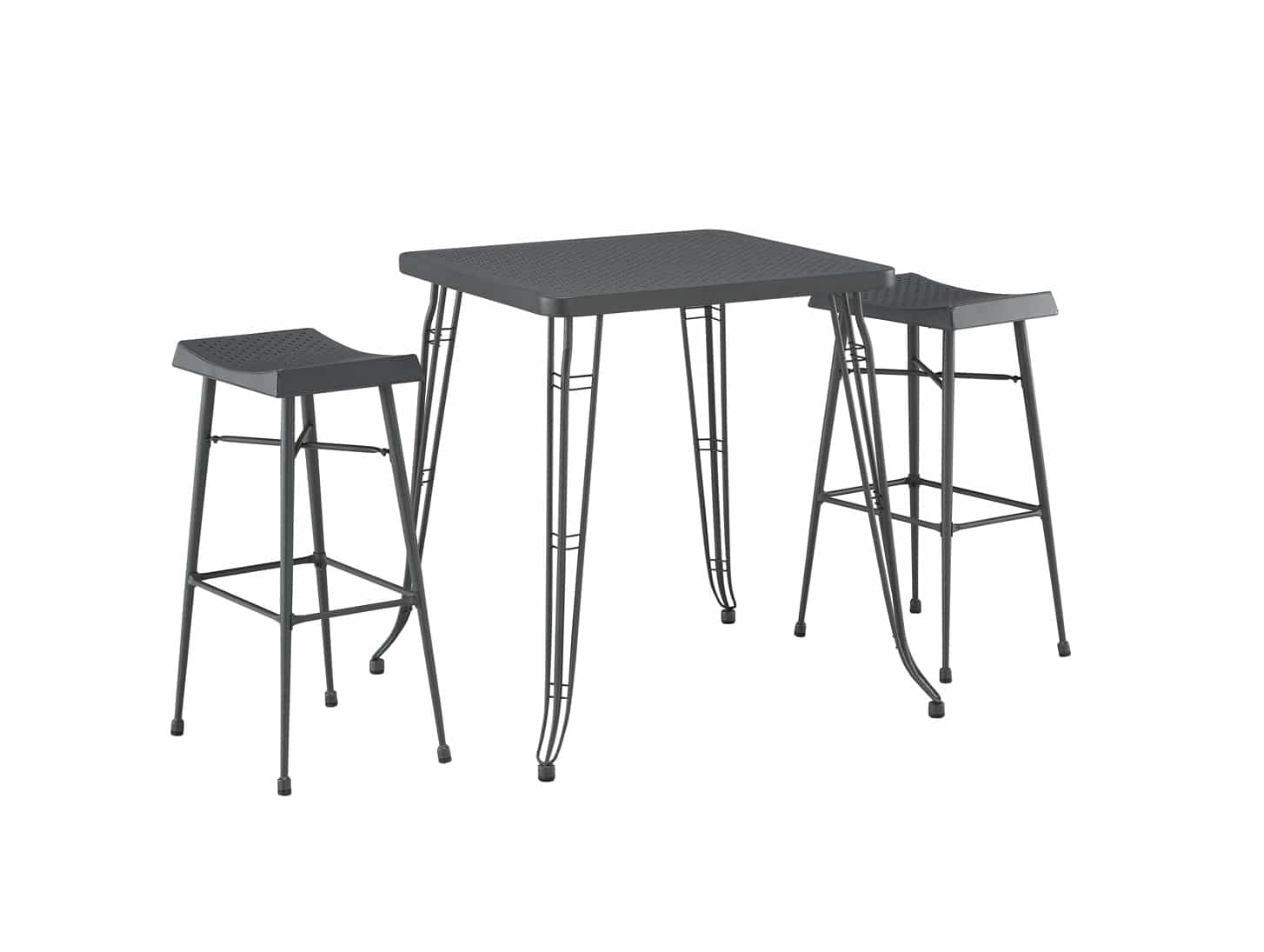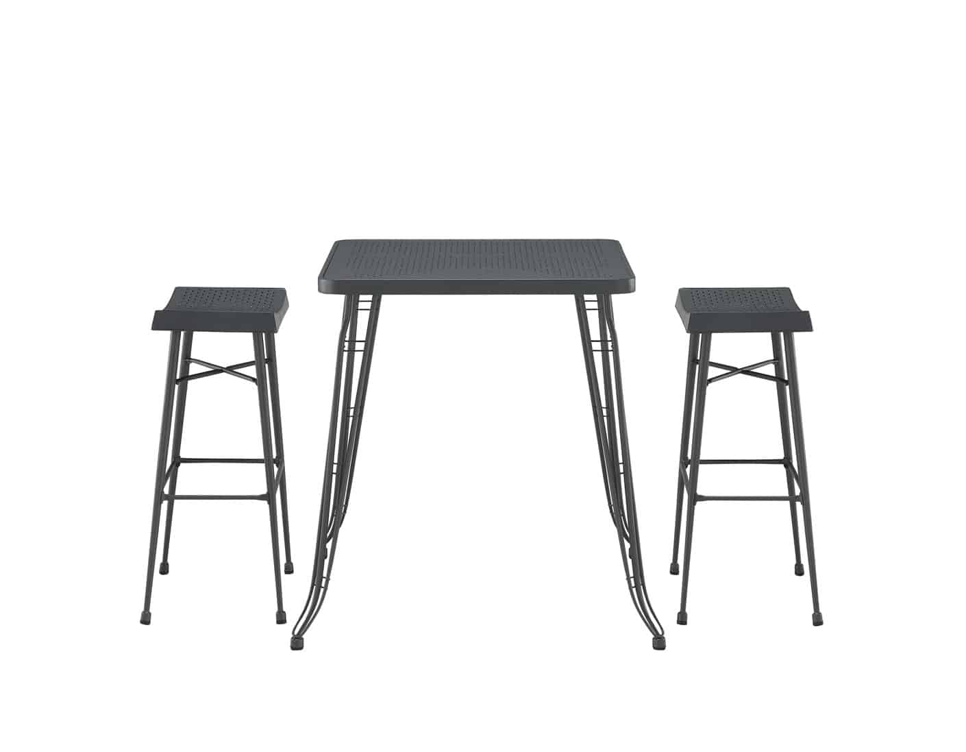 The Gilbert 3-Piece Pub Set proves that industrial design can still be inviting. Although this 3-piece set is crafted from 100 percent steel, it’s designed for comfort with molded seats and built-in footrests. Perforated stars decorate the tops of each item, increasing the industrial feel. Also available in a 5-Piece Set. Ships ready to assemble with all hardware included.