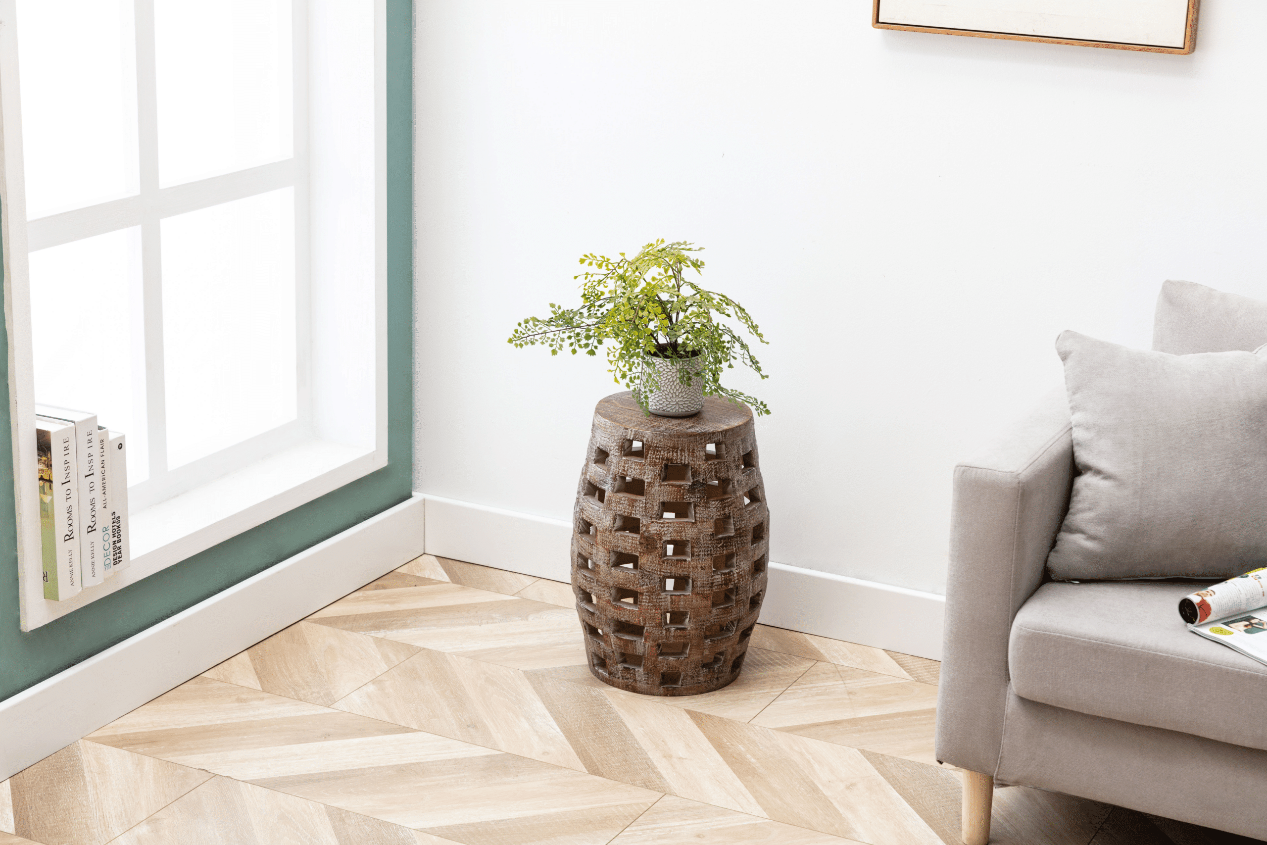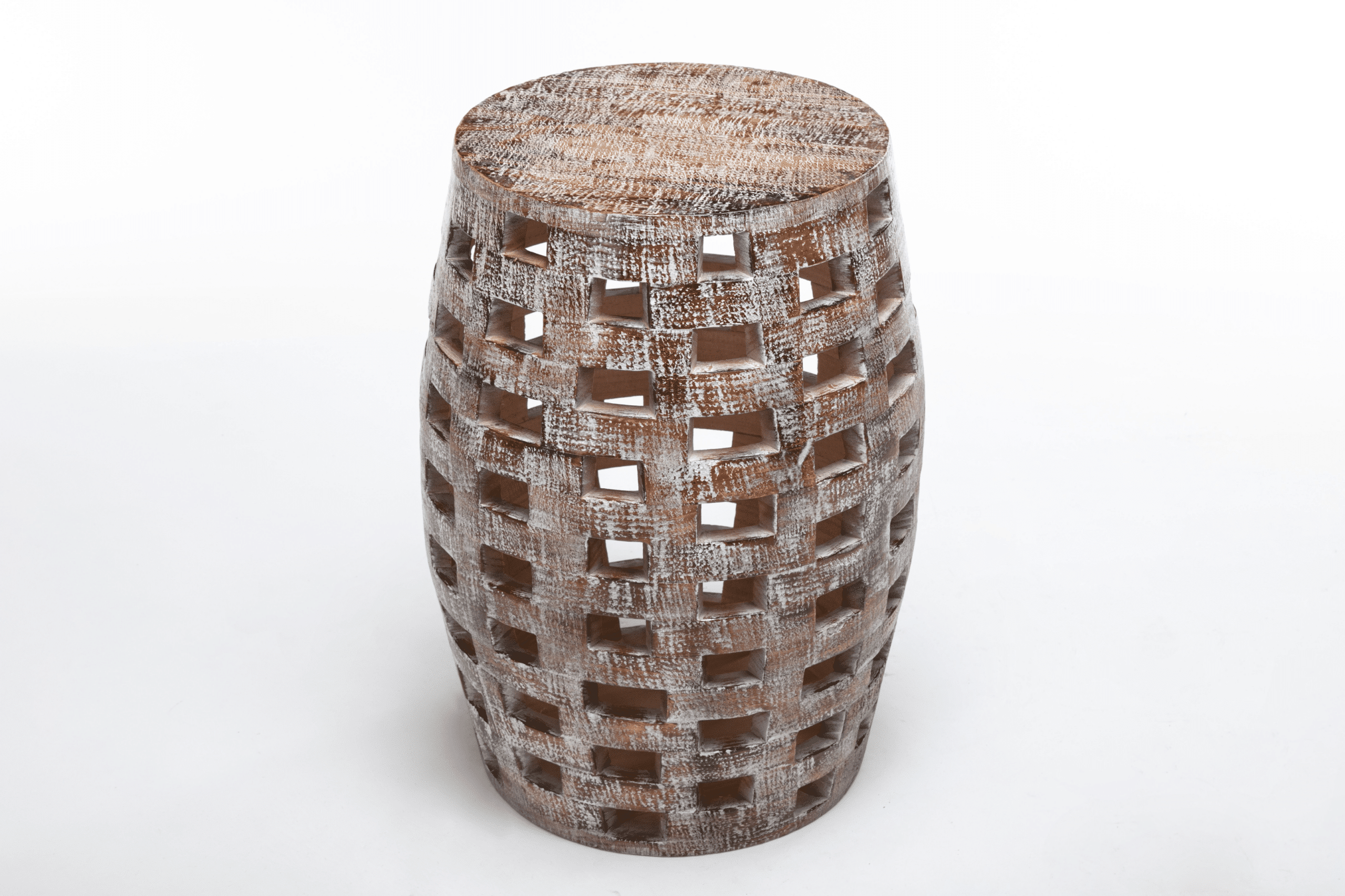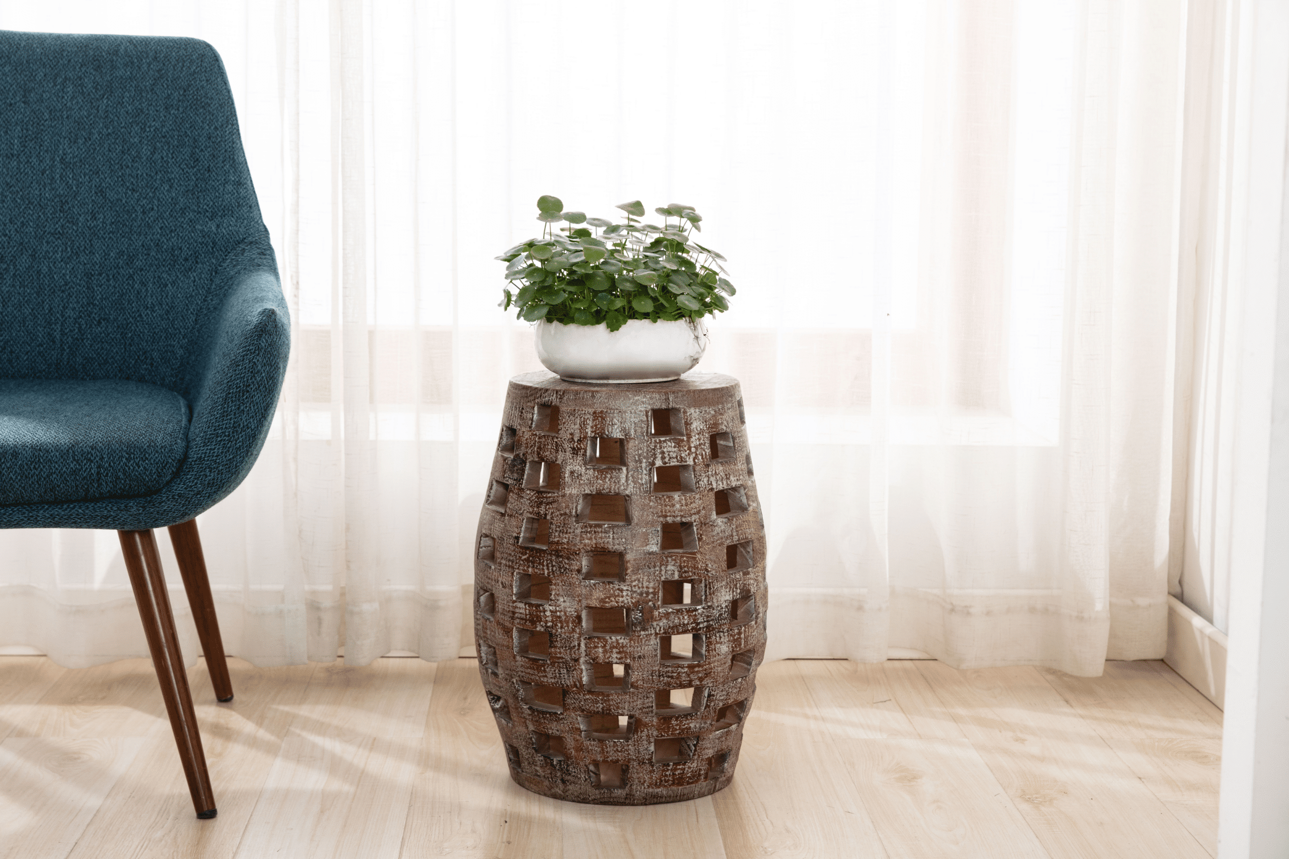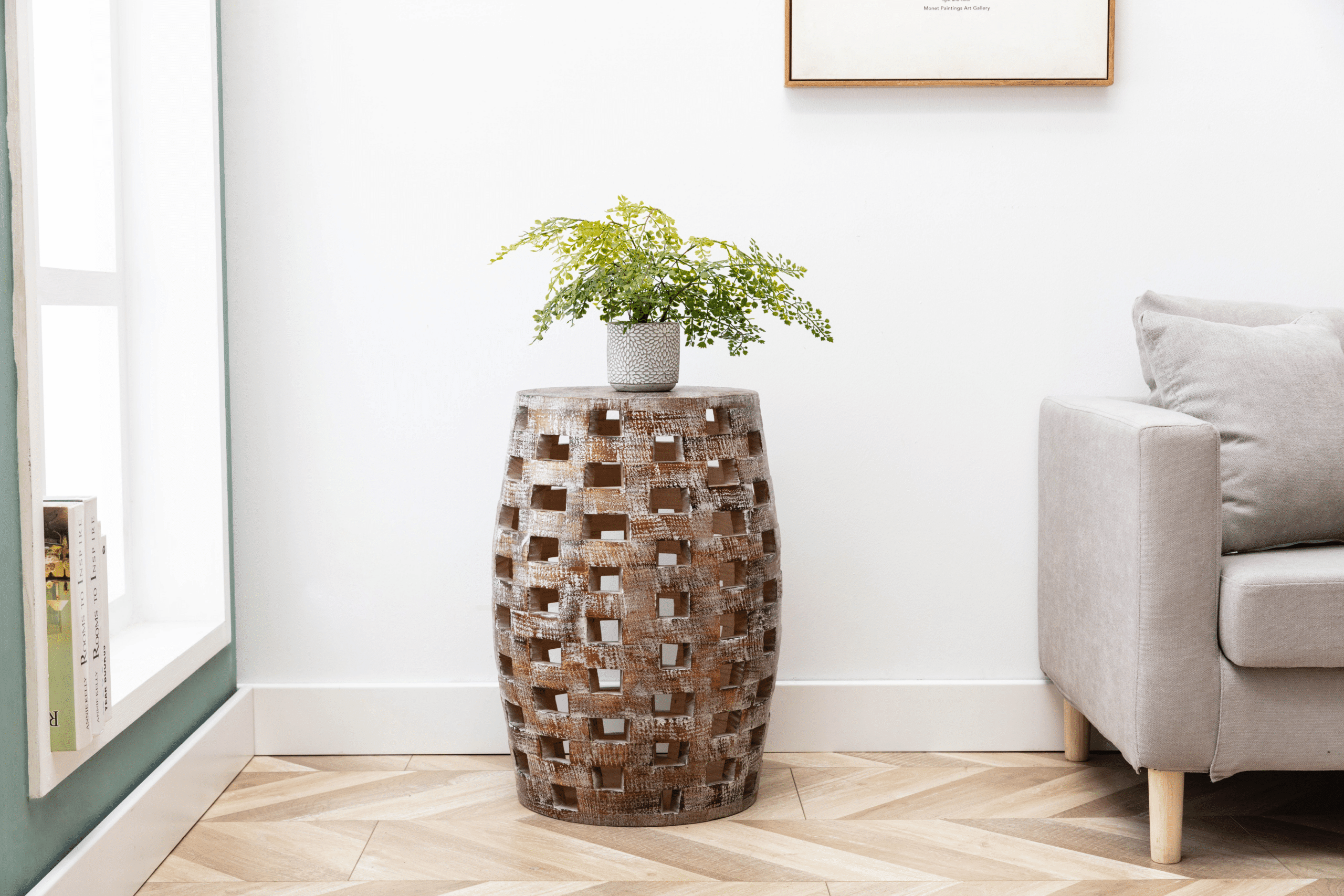 The Boraam Hampton Side Table brings a nice rustic feel into your home. Made to look like a small barrel with a unique hole pattern all around the side, the Hampton Side Table is constructed with pine wood and is available in our weathered walnut finish. It is available in two different heights; 18″ and 26″. These are perfect pieces to bring into your living room and bar area. It will be sure to have your family and friends talking. No assembly is required, The Hampton Side Table is ready to use right out of the box!