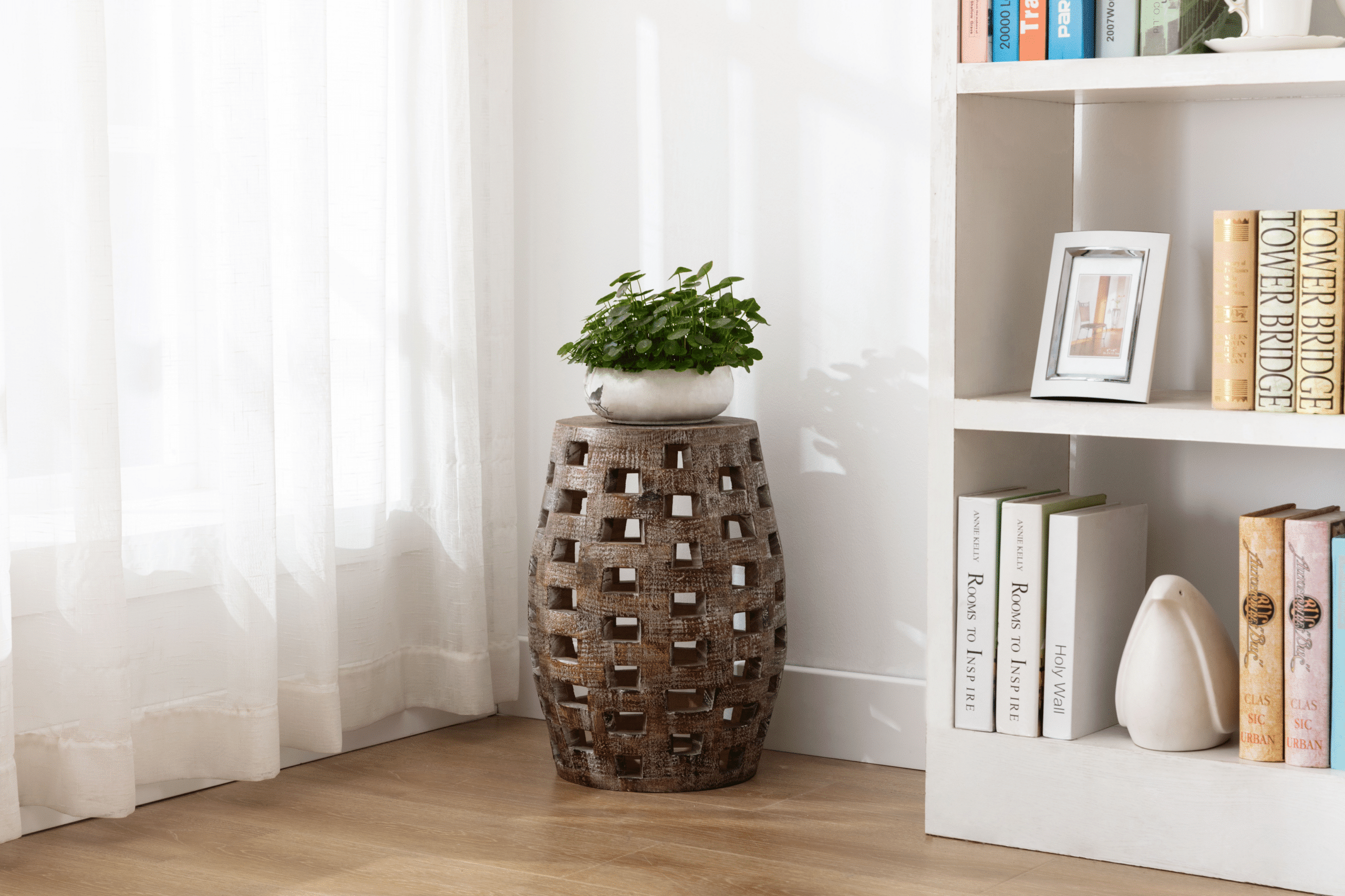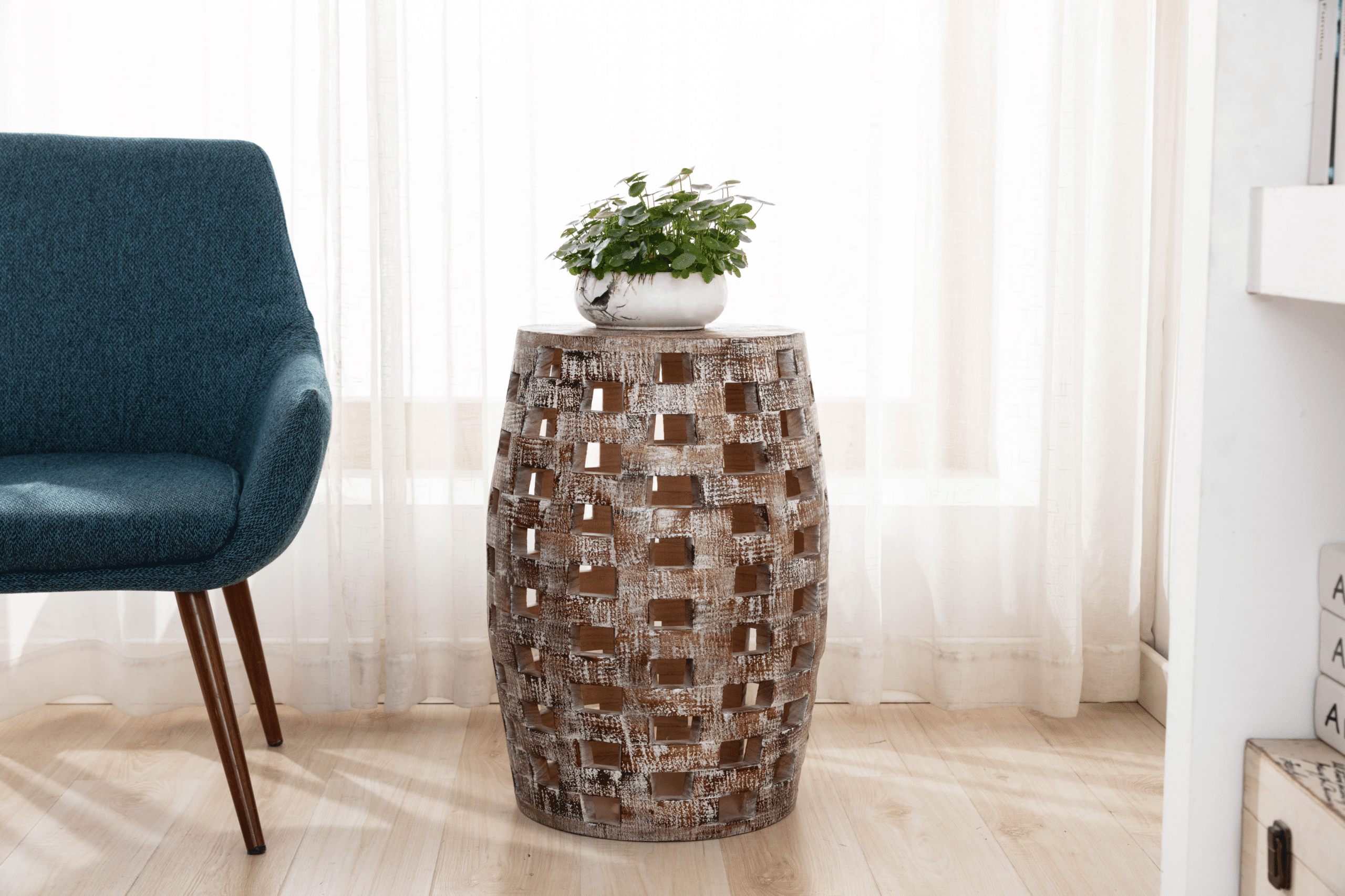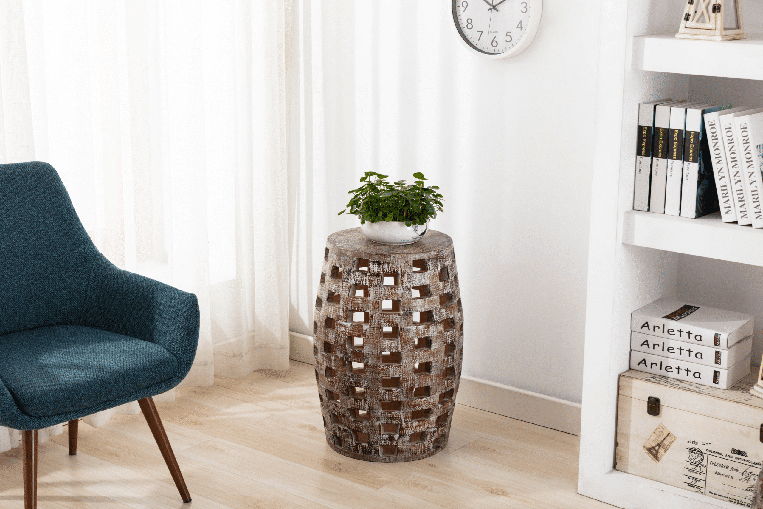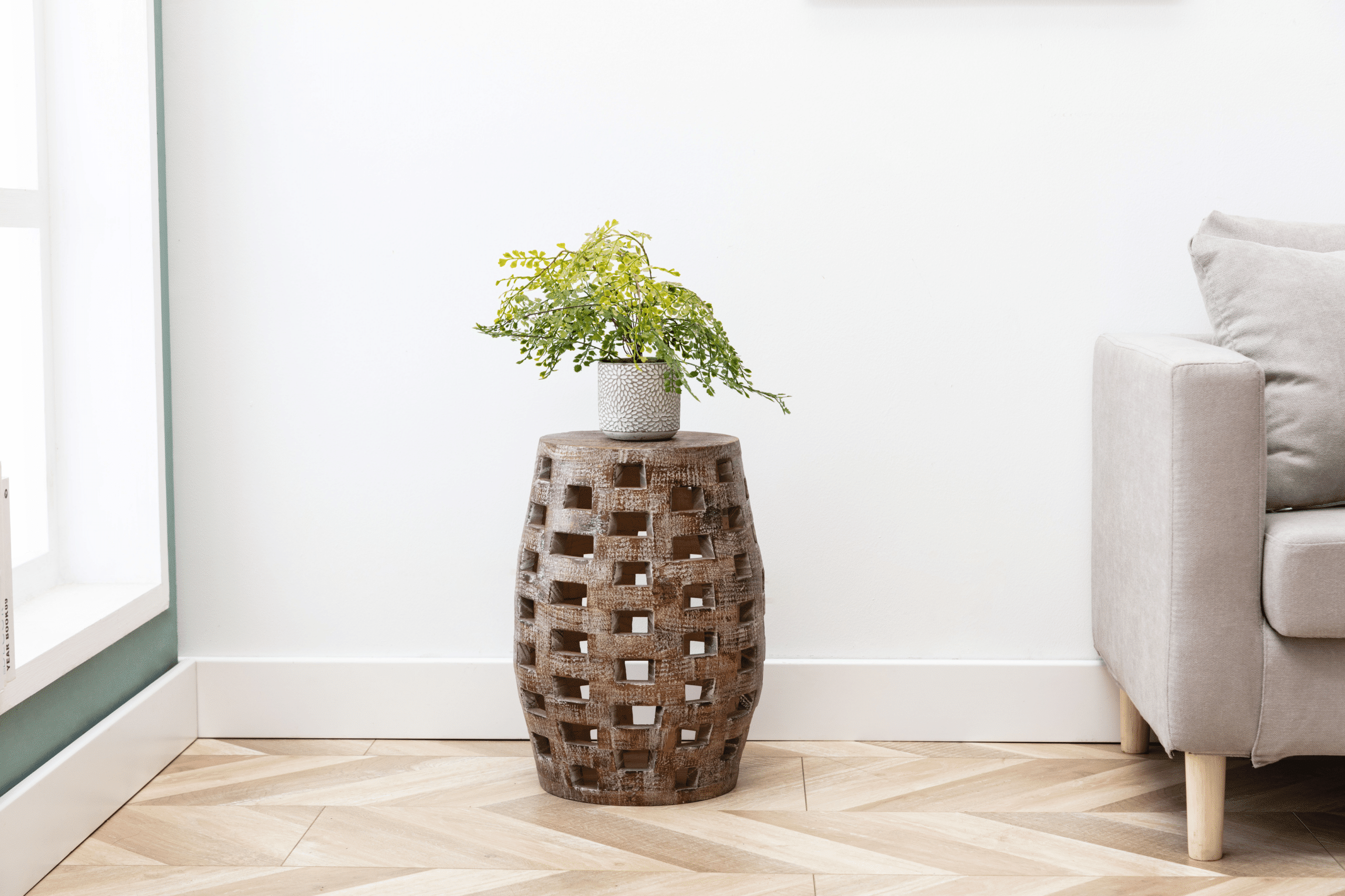 The Boraam Hampton Side Table brings a nice rustic feel into your home. Made to look like a small barrel with a unique hole pattern all around the side, the Hampton Side Table is constructed with pine wood and is available in our weathered walnut finish. It is available in two different heights; 18″ and 26″. These are perfect pieces to bring into your living room and bar area. It will be sure to have your family and friends talking. No assembly is required, The Hampton Side Table is ready to use right out of the box!