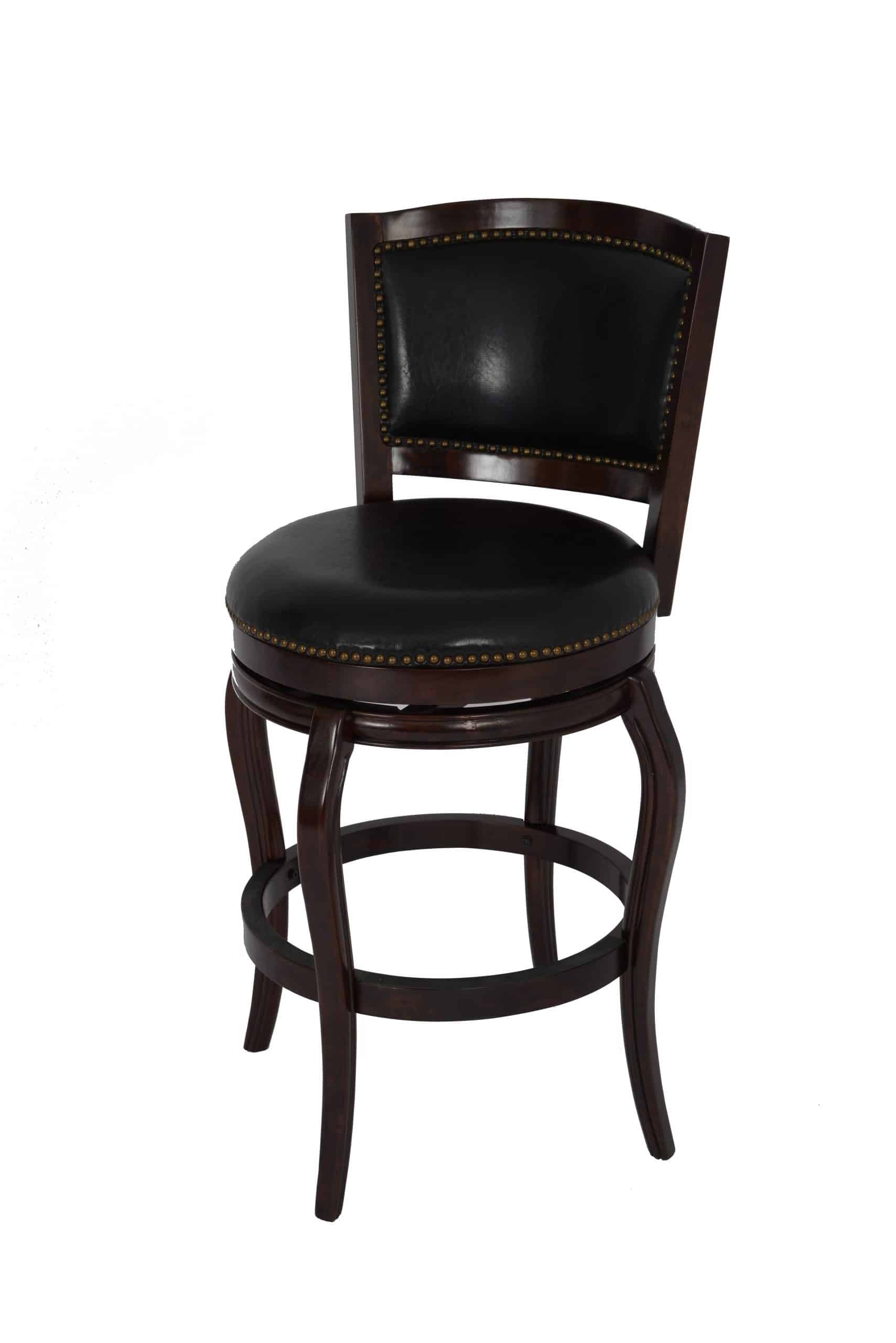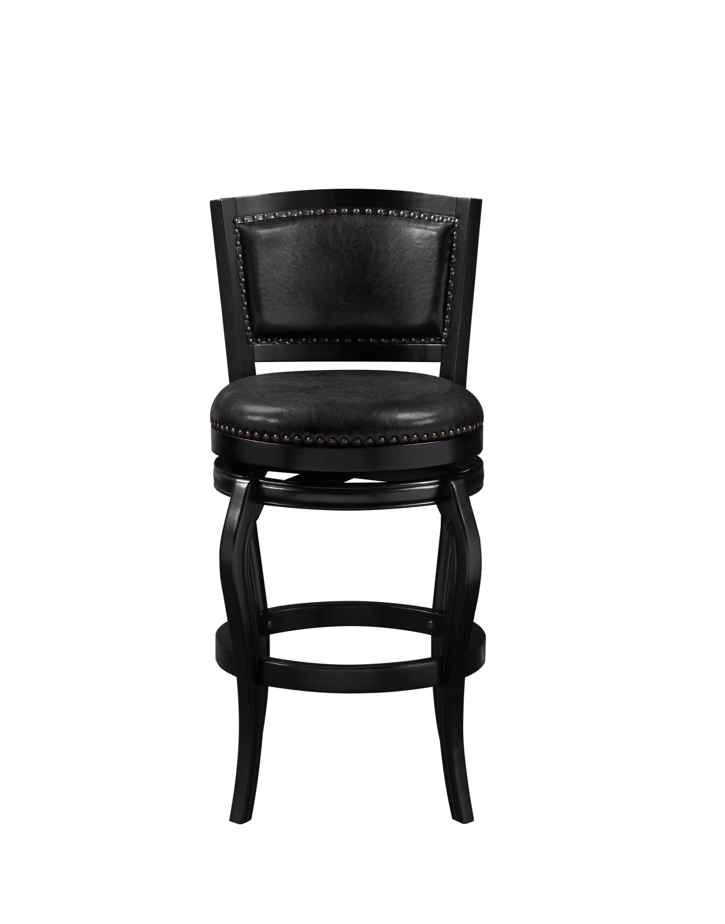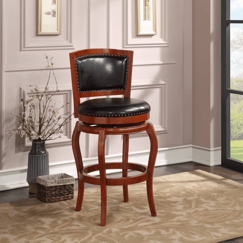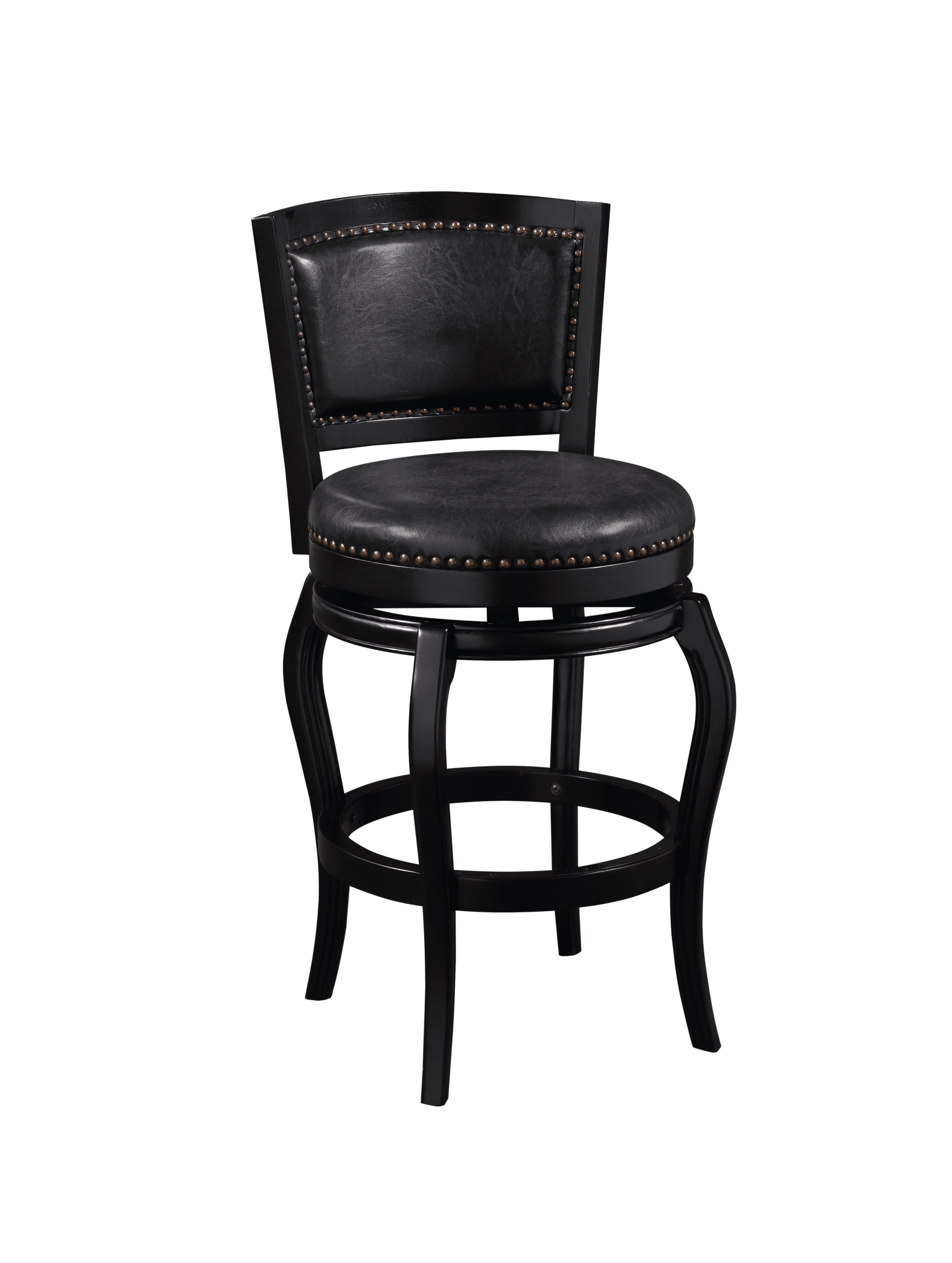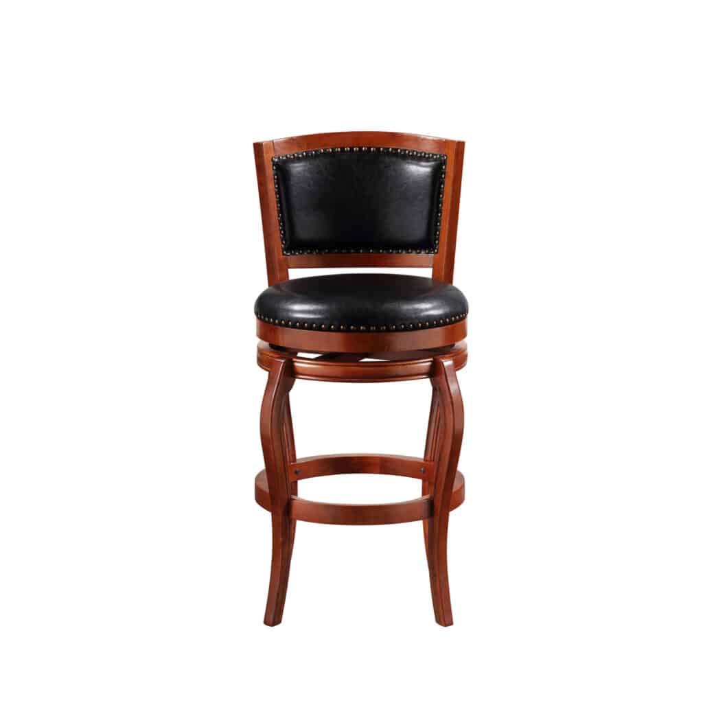 The Harris Swivel Stool knows you take your comfort seriously. That’s why it features an oversized seat (22 inches diameter!) with padded high-density foam cushioning in the seat and backrest. Genuine brass nailheads provide a traditional accent to the black faux leather upholstery. Comfort and durability are of equal importance to looks. Legs flare slightly underneath a circular stability stretcher, to rest your feet after a long day. This traditional swivel stool is a welcome addition to any game room, home bar, den, or kitchen. The Harris is available in three different finishes: Cappuccino, Black, and Cherry. Make this a three-piece set by pairing two barstools with Boraam’s Florence pub table in a matching color. This stool is recommended for residential use only.