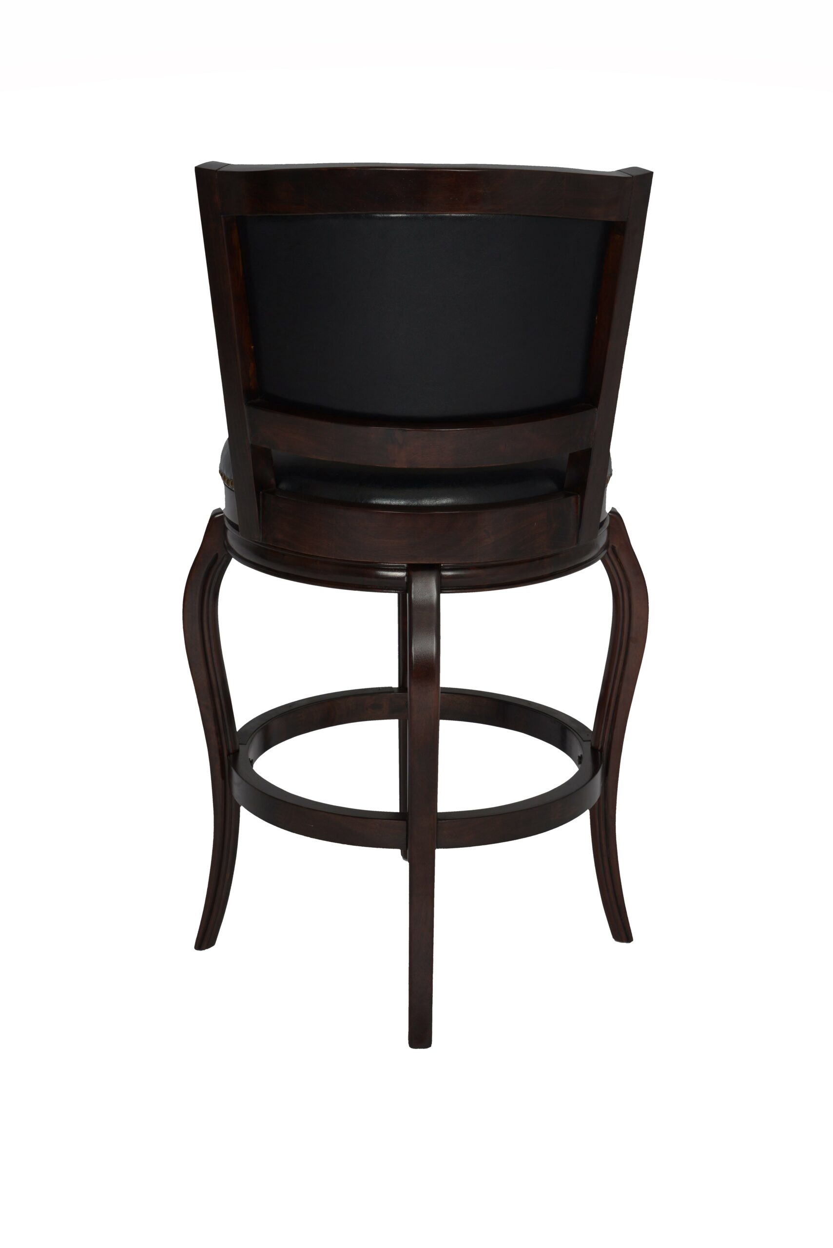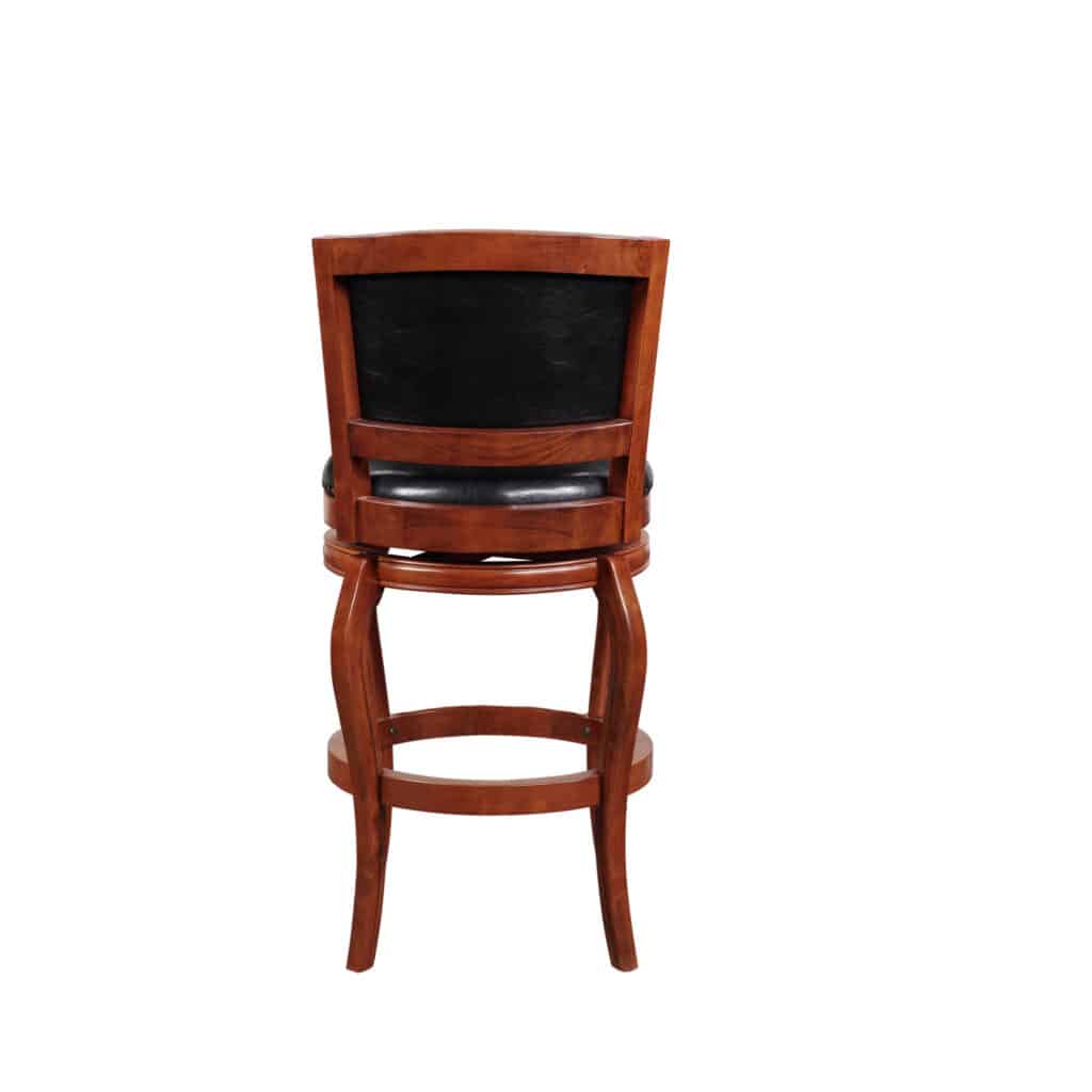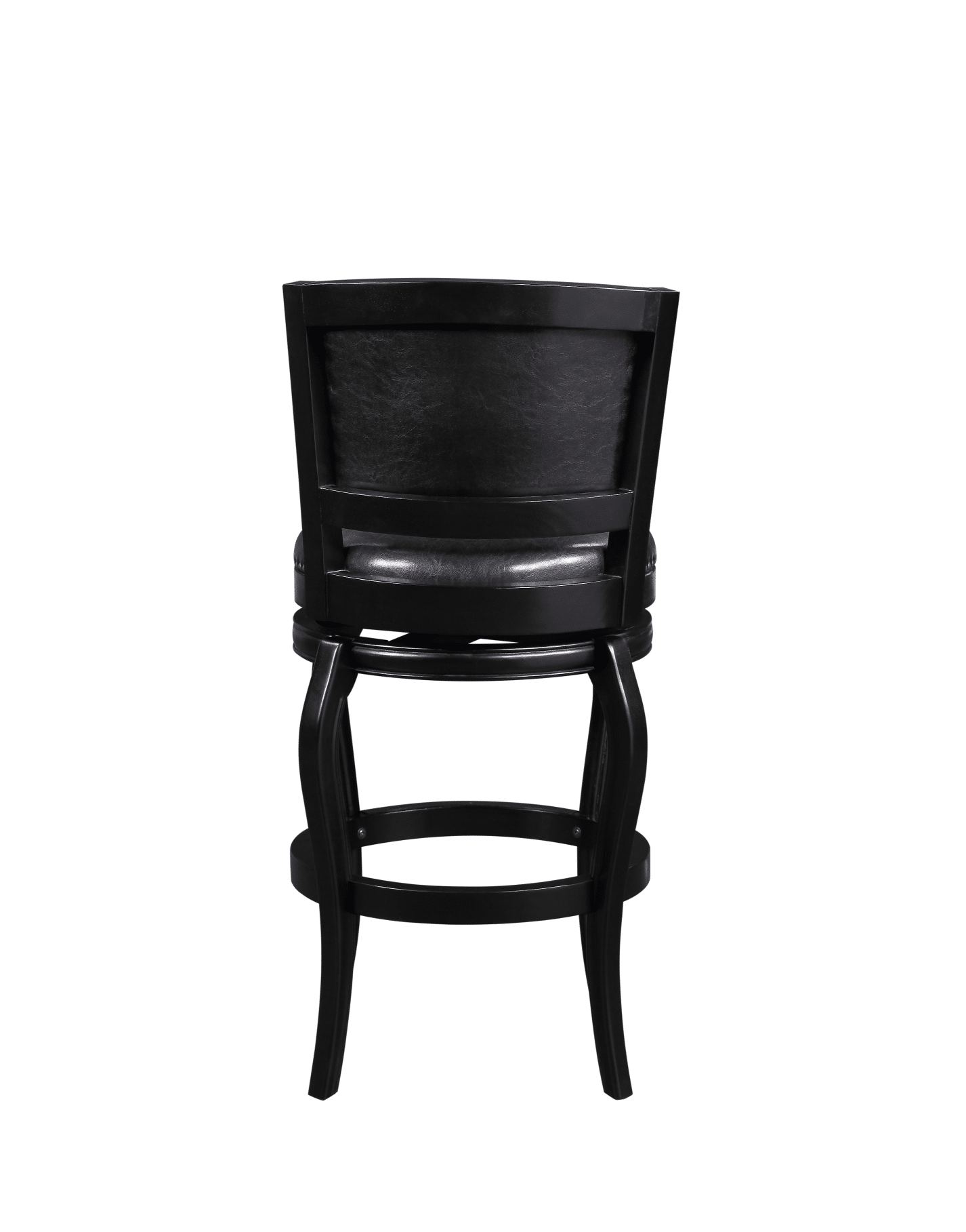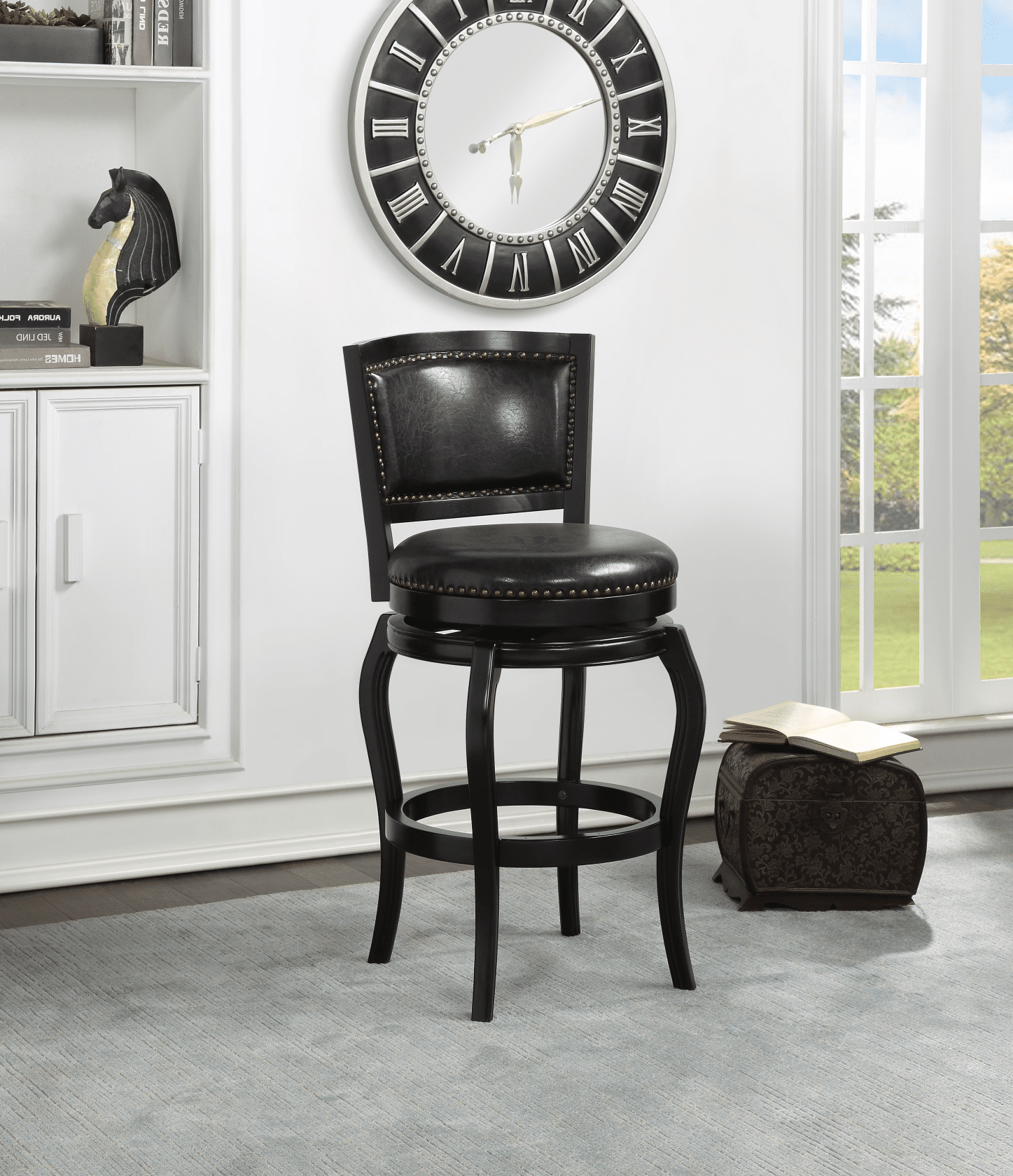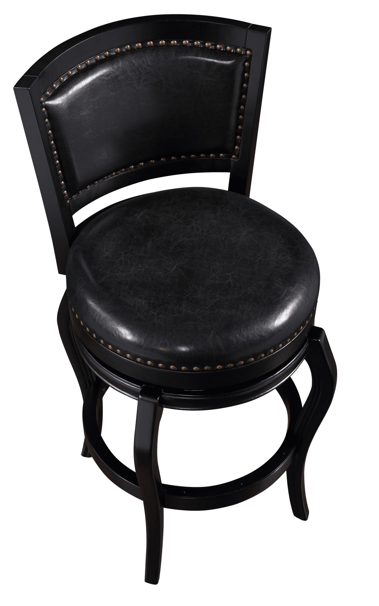 The Harris Swivel Stool knows you take your comfort seriously. That’s why it features an oversized seat (22 inches diameter!) with padded high-density foam cushioning in the seat and backrest. Genuine brass nailheads provide a traditional accent to the black faux leather upholstery. Comfort and durability are of equal importance to looks. Legs flare slightly underneath a circular stability stretcher, to rest your feet after a long day. This traditional swivel stool is a welcome addition to any game room, home bar, den, or kitchen. The Harris is available in three different finishes: Cappuccino, Black, and Cherry. Make this a three-piece set by pairing two barstools with Boraam’s Florence pub table in a matching color. This stool is recommended for residential use only.