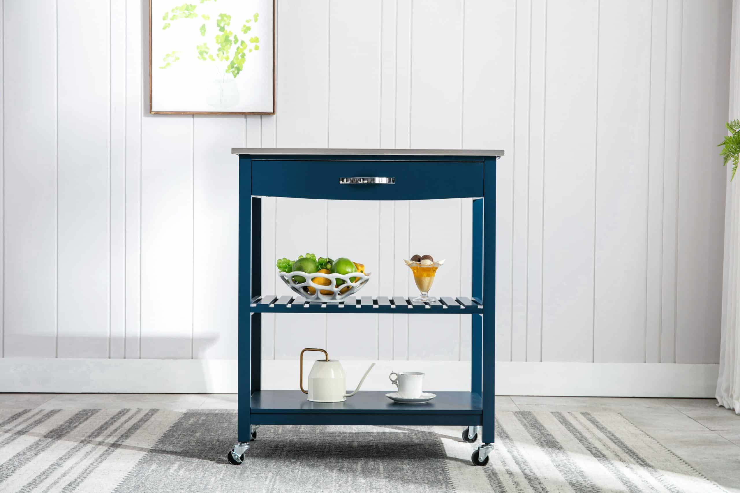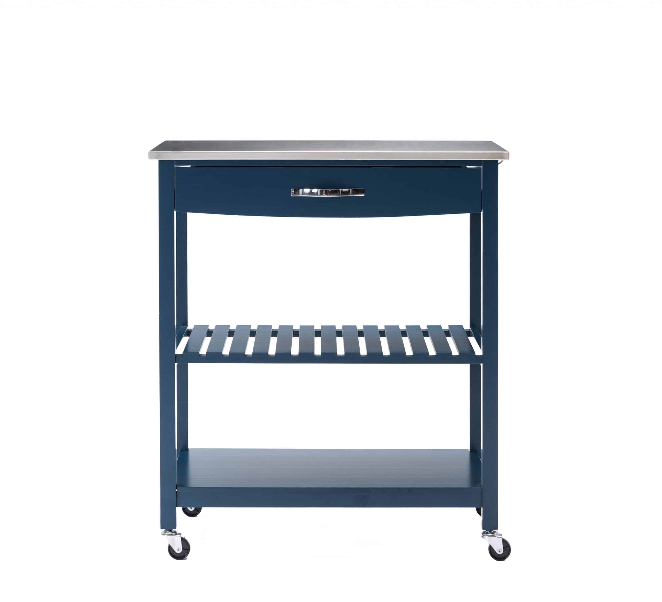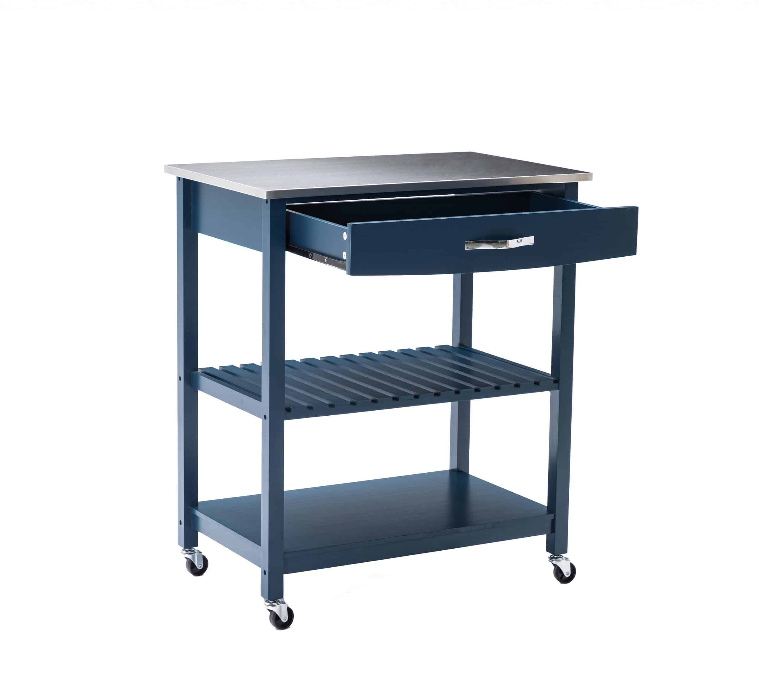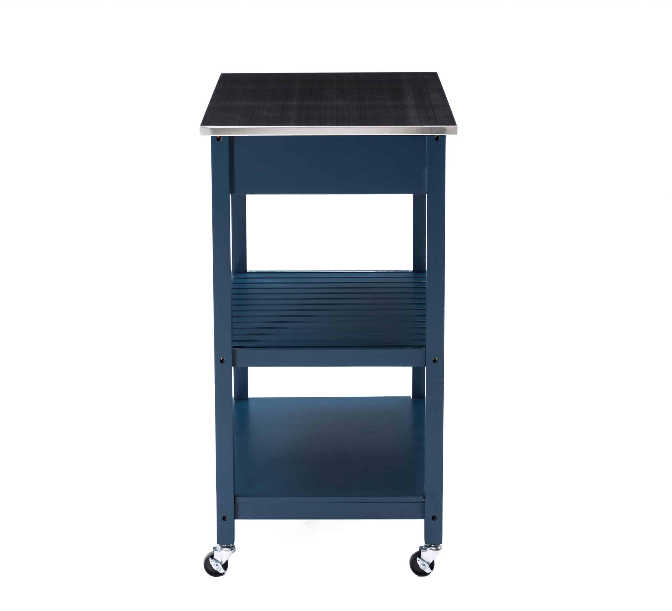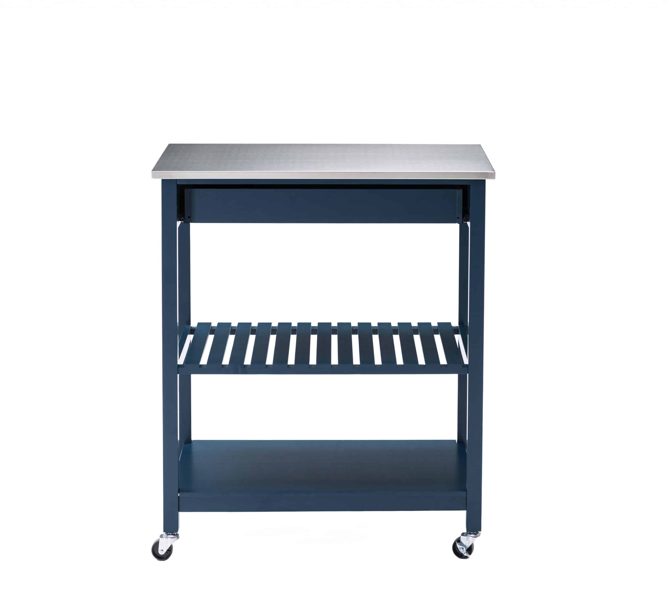 If you need a little extra storage and prep space for your kitchen, look no further than the Holland Kitchen Cart With Stainless Steel Top. This rolling kitchen cart also makes a great bar cart! Store dishes, glassware, cutlery, or your favorite spirits on the lower shelves. A slender drawer conveniently holds napkins, utensils, corkscrews, and other kitchen must-haves. Use the rolling caster wheels to roll this cart from the kitchen to the living room whenever guests are over, then wheel it back when it’s time to wash the dishes. It’s built from pine wood and medium density fiberboard with a stainless steel work surface. Available in three finishes; Gray, Navy Blue, & White. Ready for assembly upon delivery.