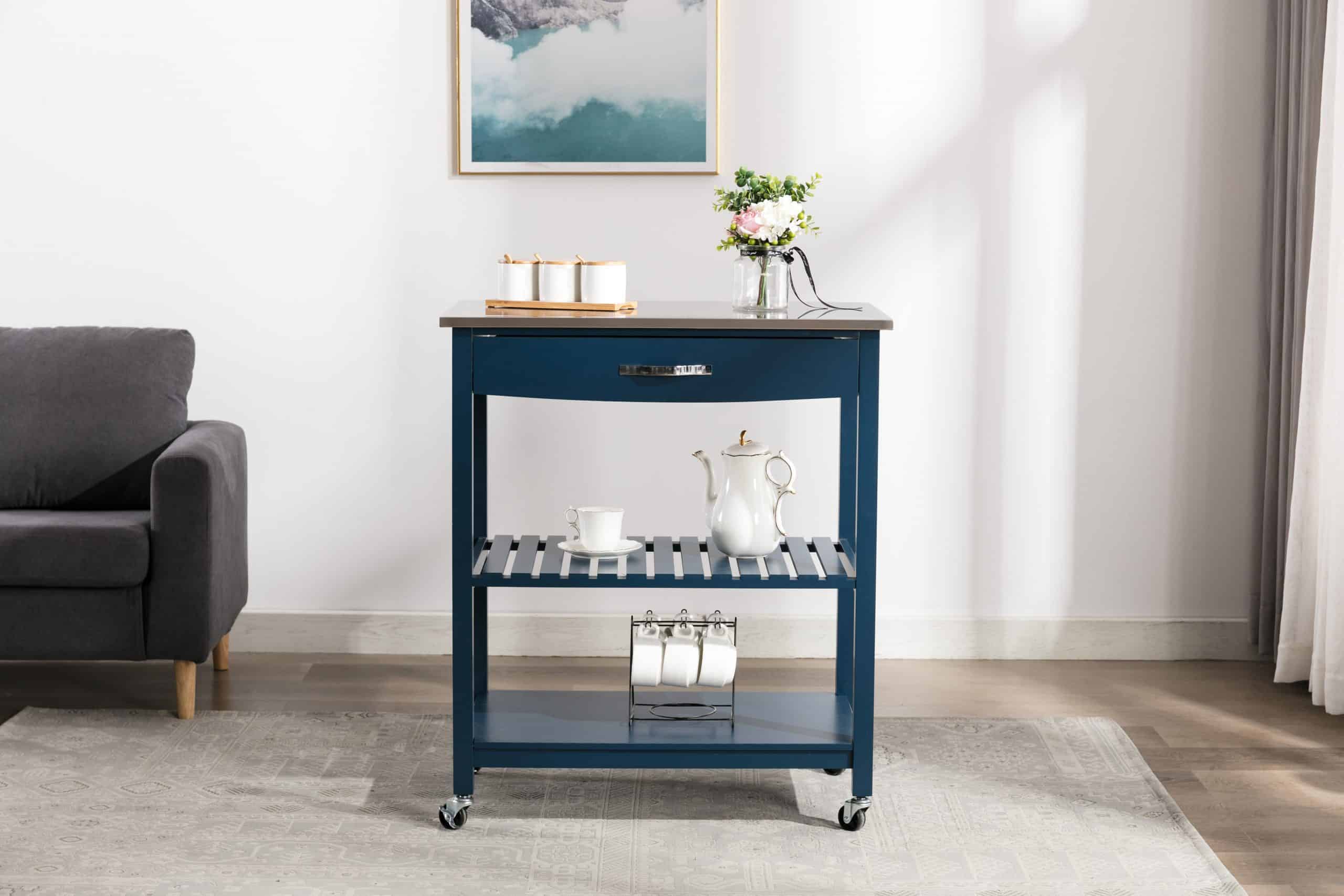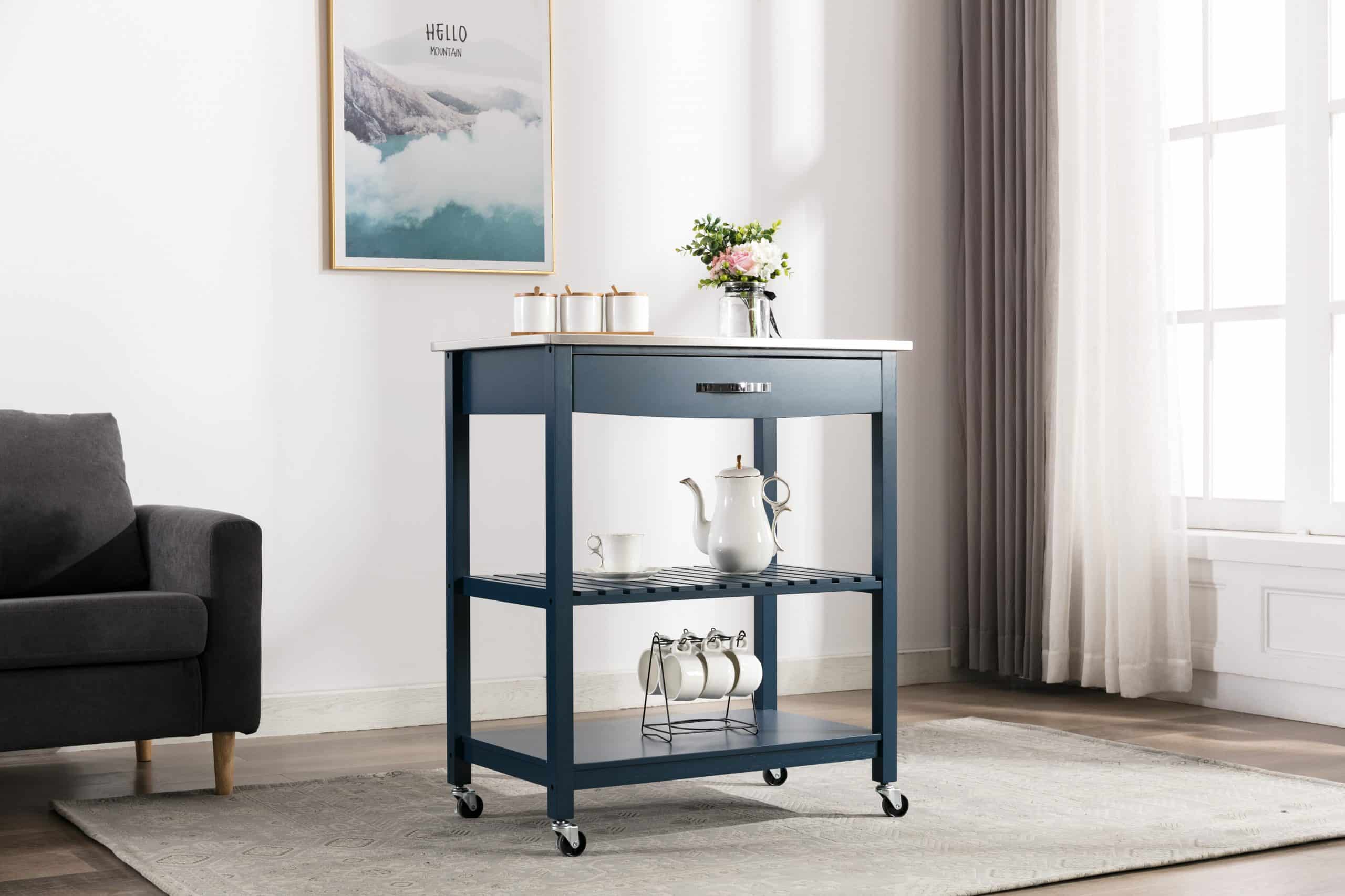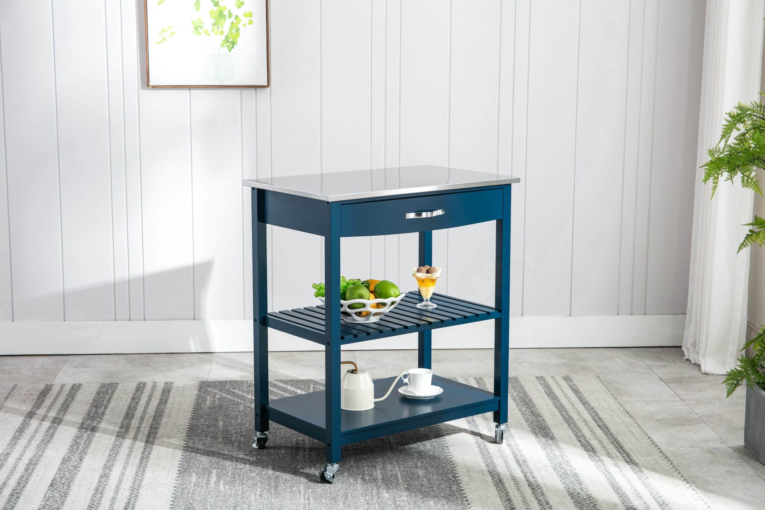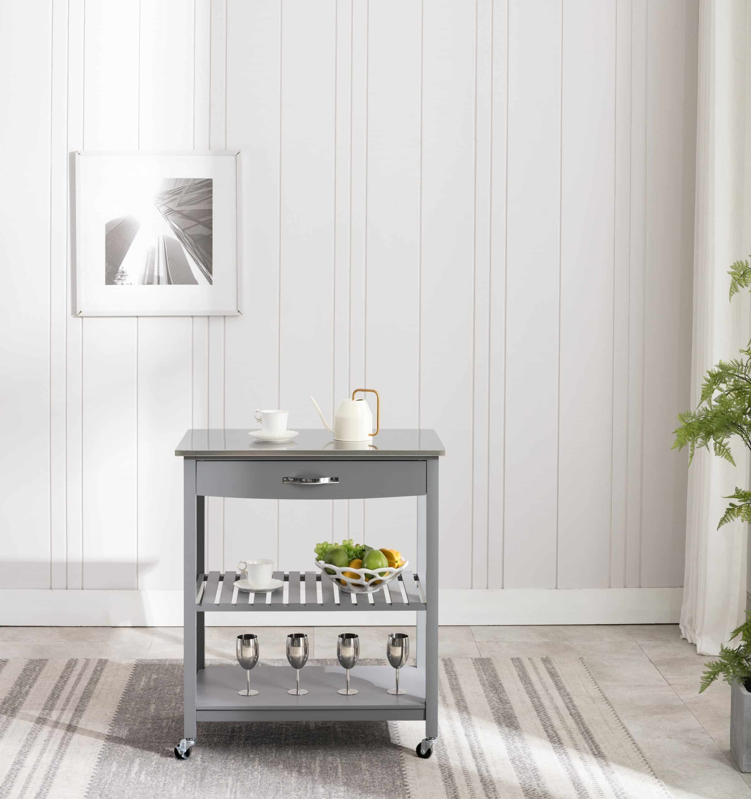 If you need a little extra storage and prep space for your kitchen, look no further than the Holland Kitchen Cart With Stainless Steel Top. This rolling kitchen cart also makes a great bar cart! Store dishes, glassware, cutlery, or your favorite spirits on the lower shelves. A slender drawer conveniently holds napkins, utensils, corkscrews, and other kitchen must-haves. Use the rolling caster wheels to roll this cart from the kitchen to the living room whenever guests are over, then wheel it back when it’s time to wash the dishes. It’s built from pine wood and medium density fiberboard with a stainless steel work surface. Available in three finishes; Gray, Navy Blue, & White. Ready for assembly upon delivery.