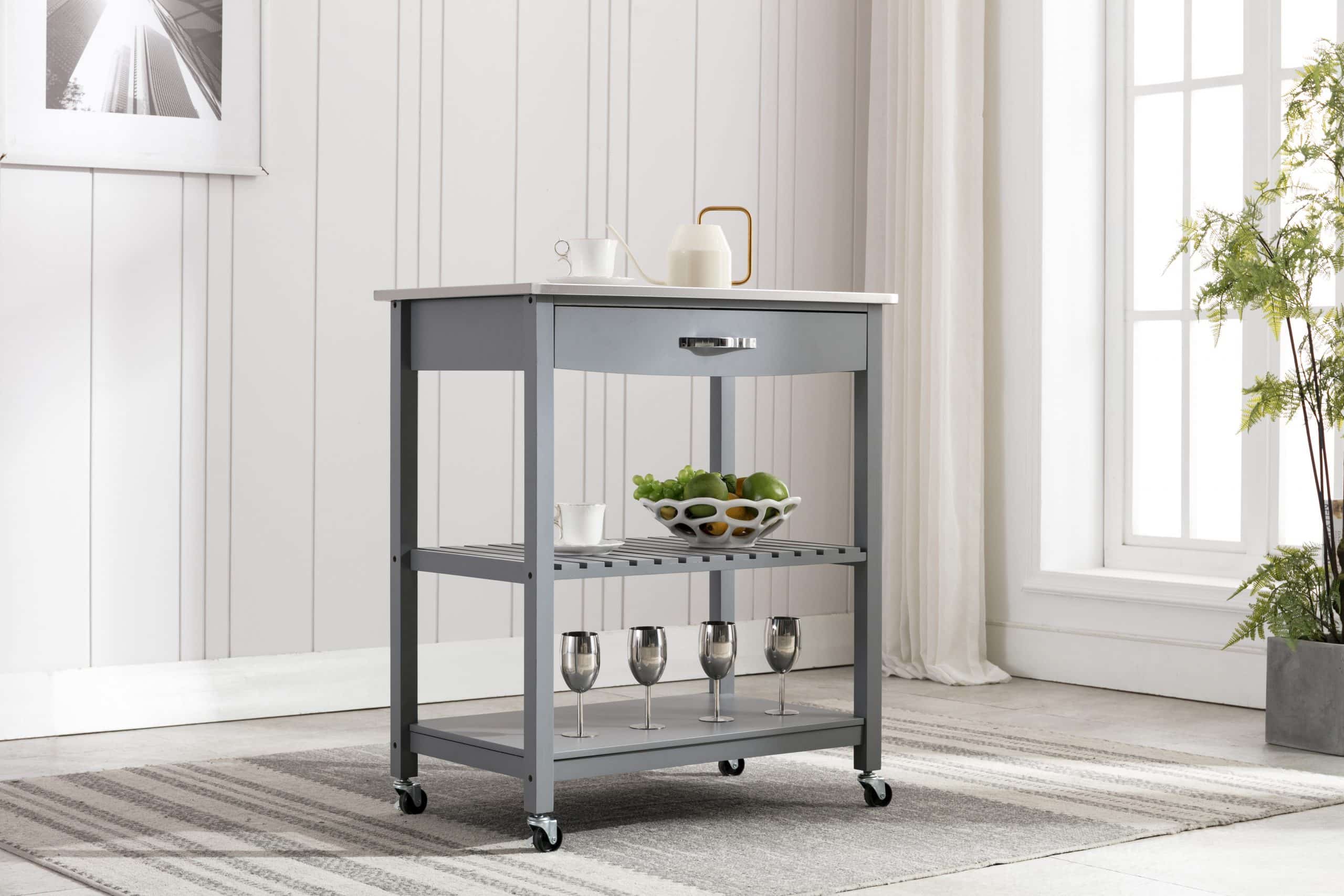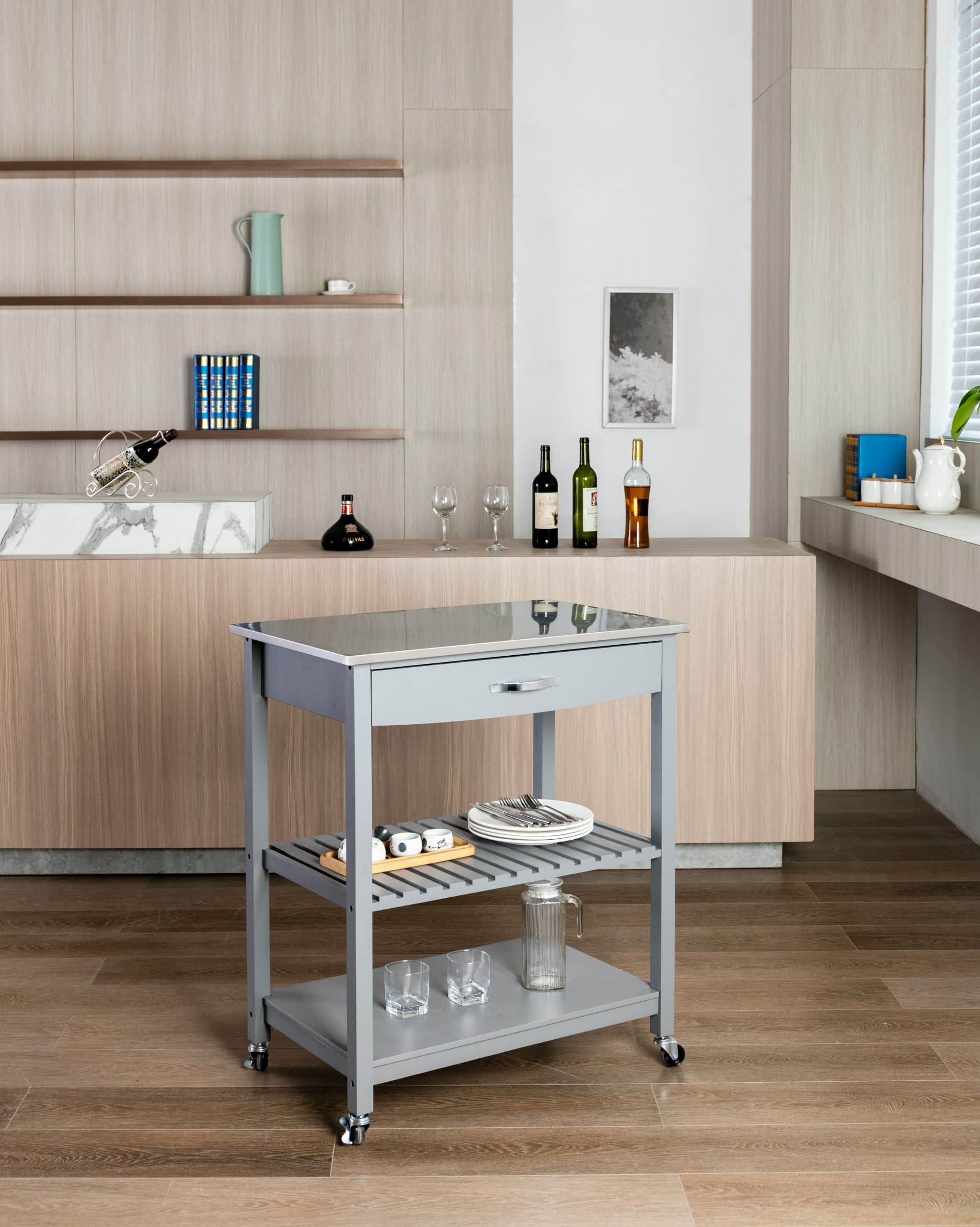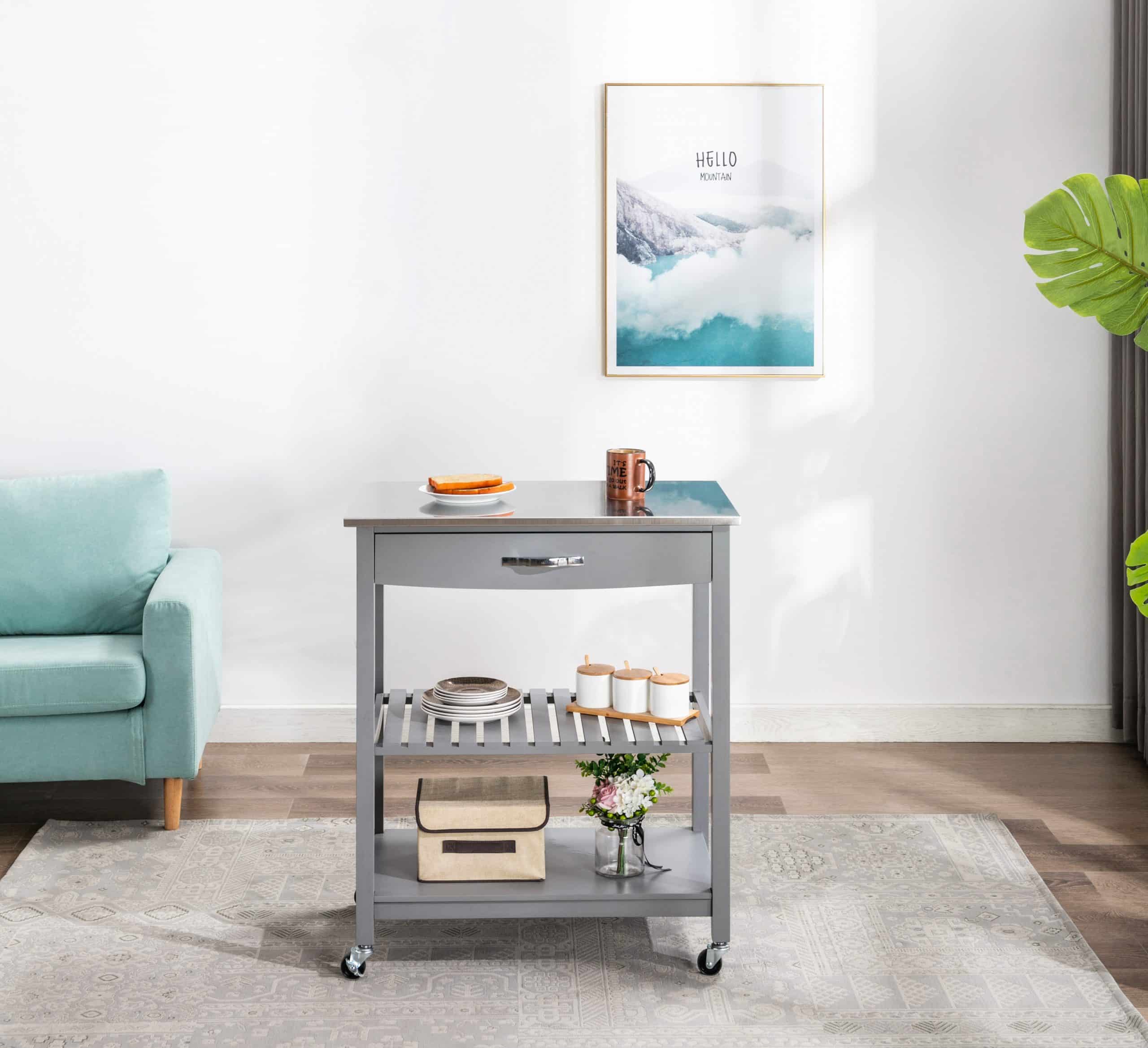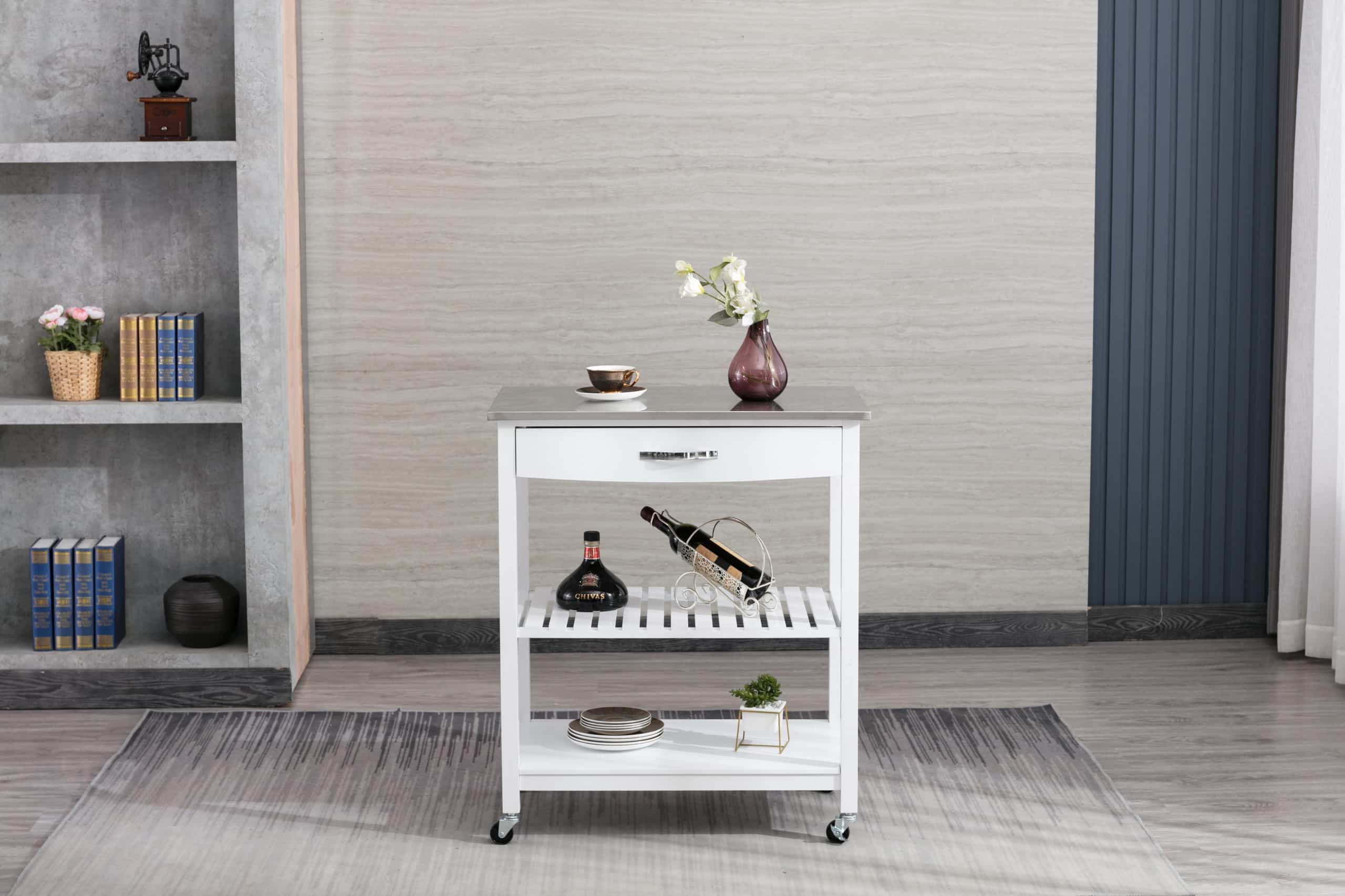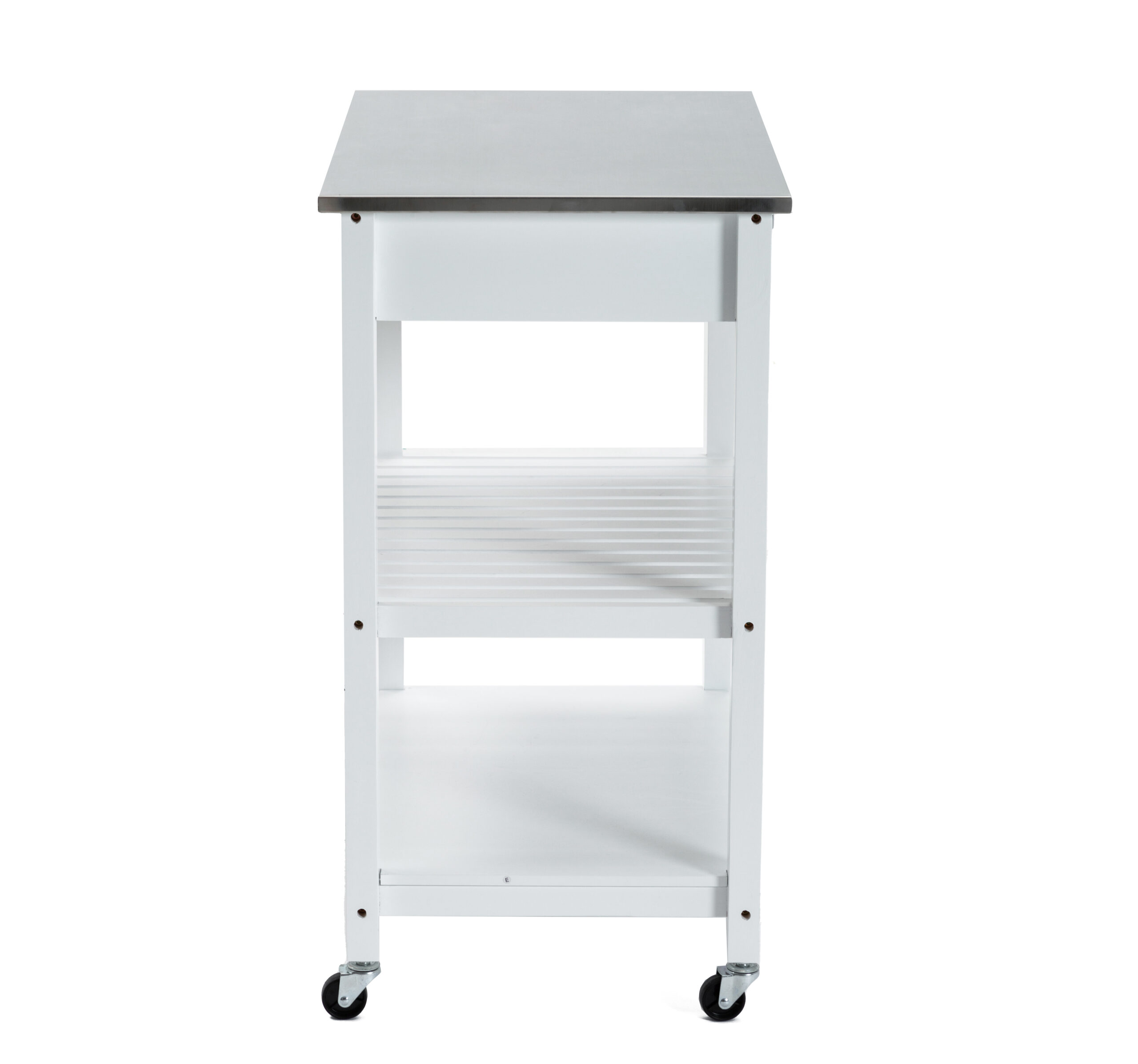 If you need a little extra storage and prep space for your kitchen, look no further than the Holland Kitchen Cart With Stainless Steel Top. This rolling kitchen cart also makes a great bar cart! Store dishes, glassware, cutlery, or your favorite spirits on the lower shelves. A slender drawer conveniently holds napkins, utensils, corkscrews, and other kitchen must-haves. Use the rolling caster wheels to roll this cart from the kitchen to the living room whenever guests are over, then wheel it back when it’s time to wash the dishes. It’s built from pine wood and medium density fiberboard with a stainless steel work surface. Available in three finishes; Gray, Navy Blue, & White. Ready for assembly upon delivery.