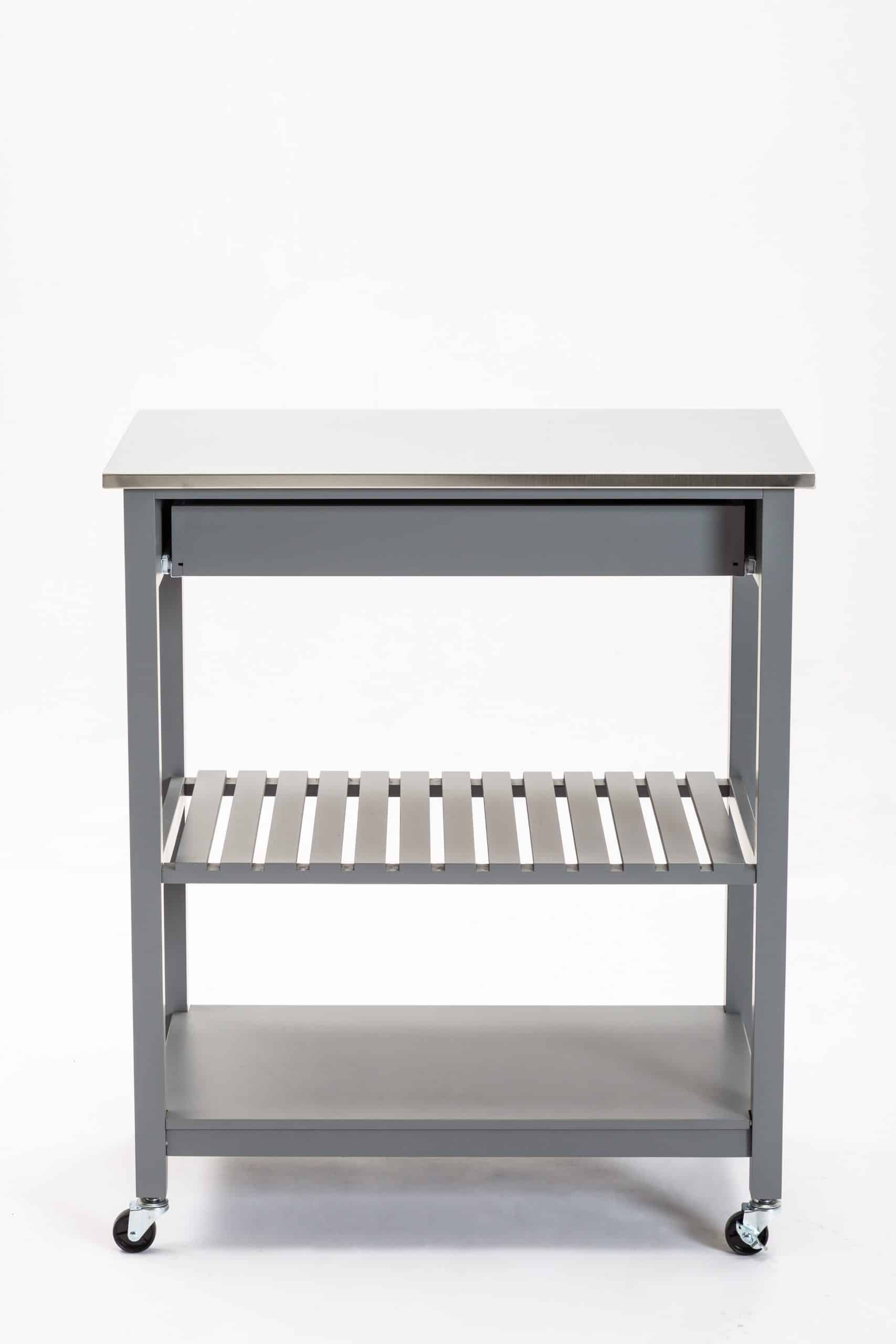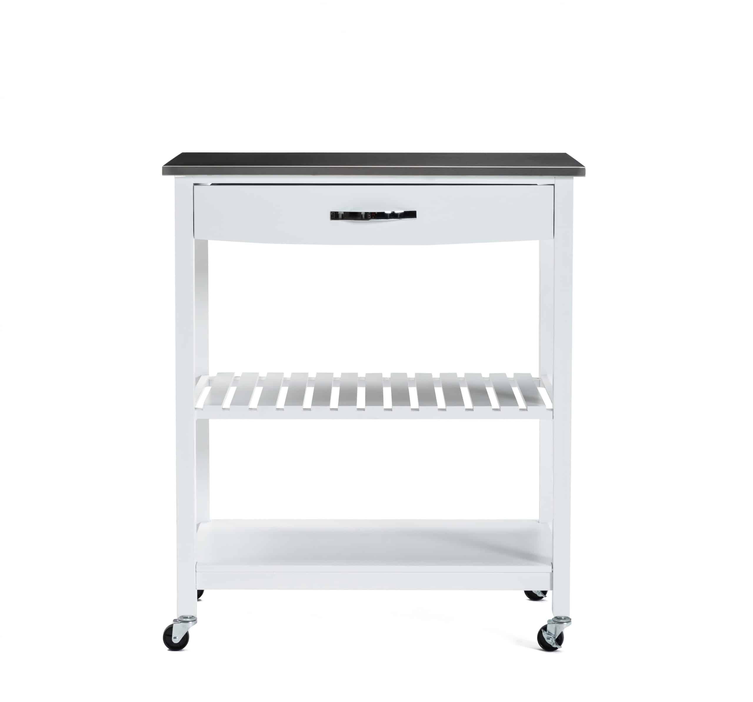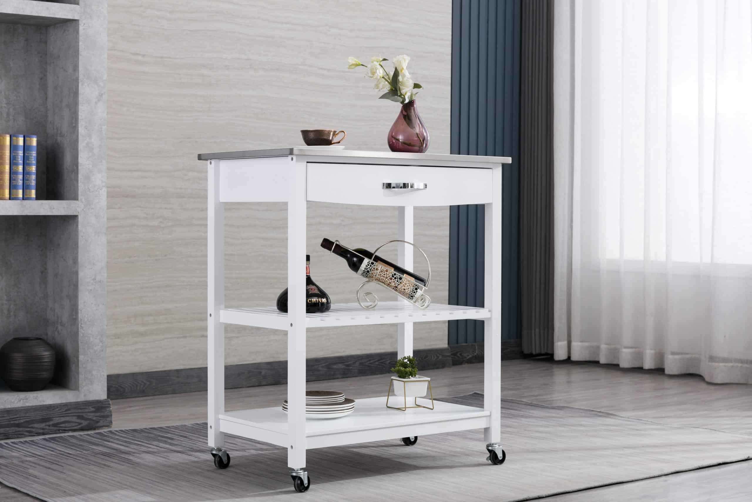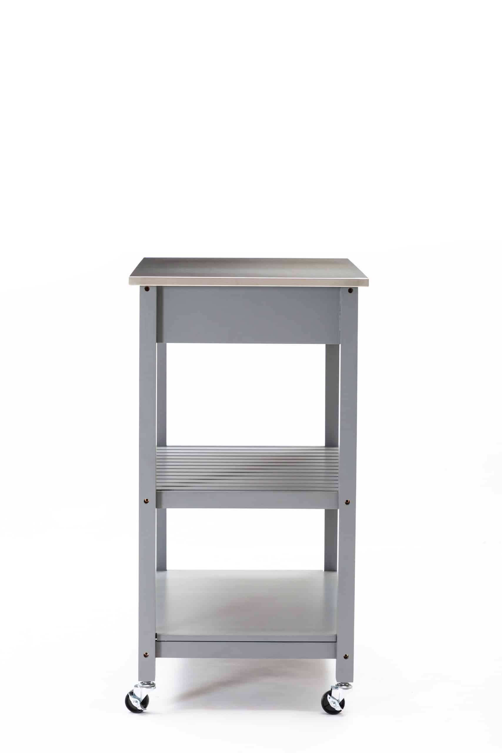 If you need a little extra storage and prep space for your kitchen, look no further than the Holland Kitchen Cart With Stainless Steel Top. This rolling kitchen cart also makes a great bar cart! Store dishes, glassware, cutlery, or your favorite spirits on the lower shelves. A slender drawer conveniently holds napkins, utensils, corkscrews, and other kitchen must-haves. Use the rolling caster wheels to roll this cart from the kitchen to the living room whenever guests are over, then wheel it back when it’s time to wash the dishes. It’s built from pine wood and medium density fiberboard with a stainless steel work surface. Available in three finishes; Gray, Navy Blue, & White. Ready for assembly upon delivery.
