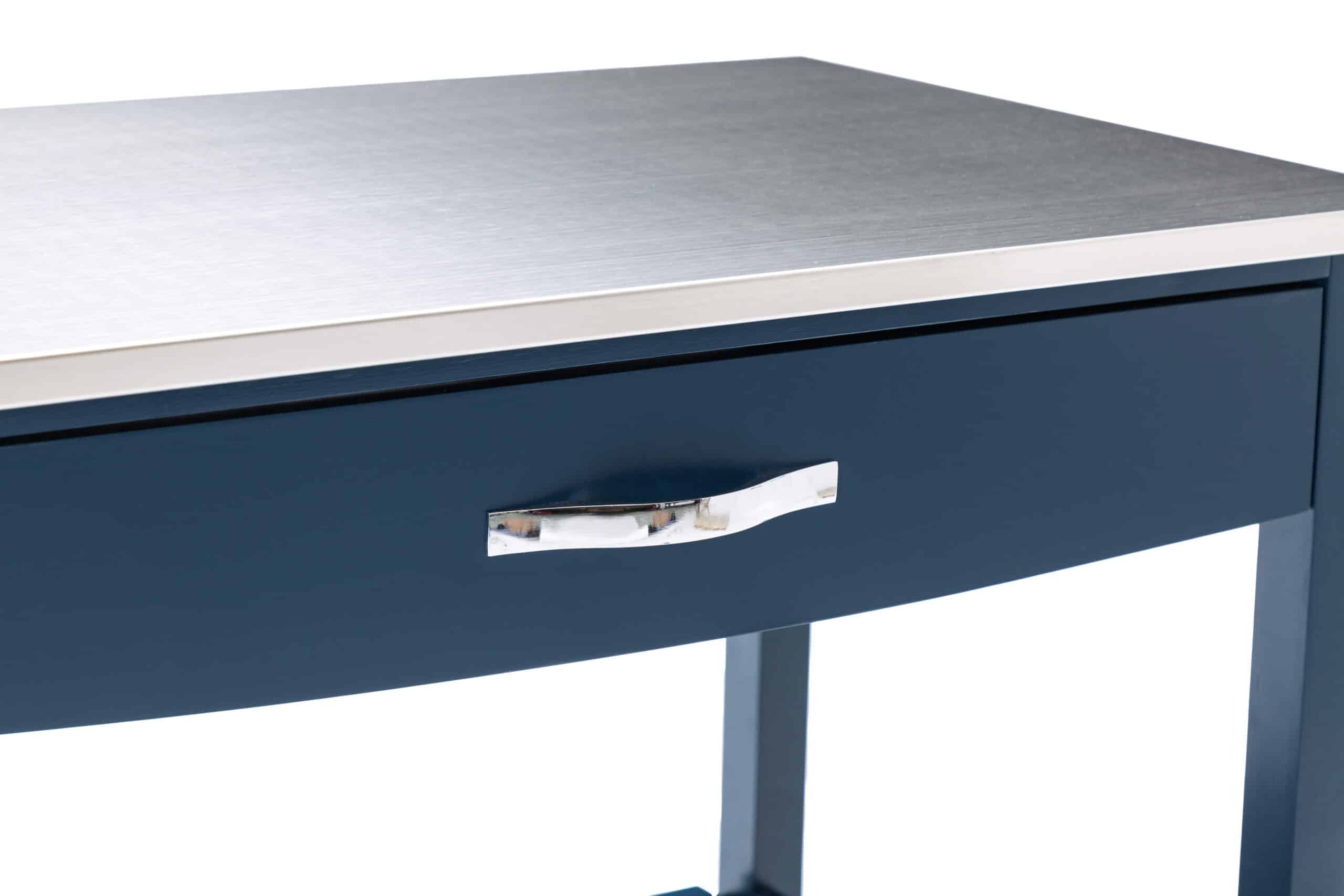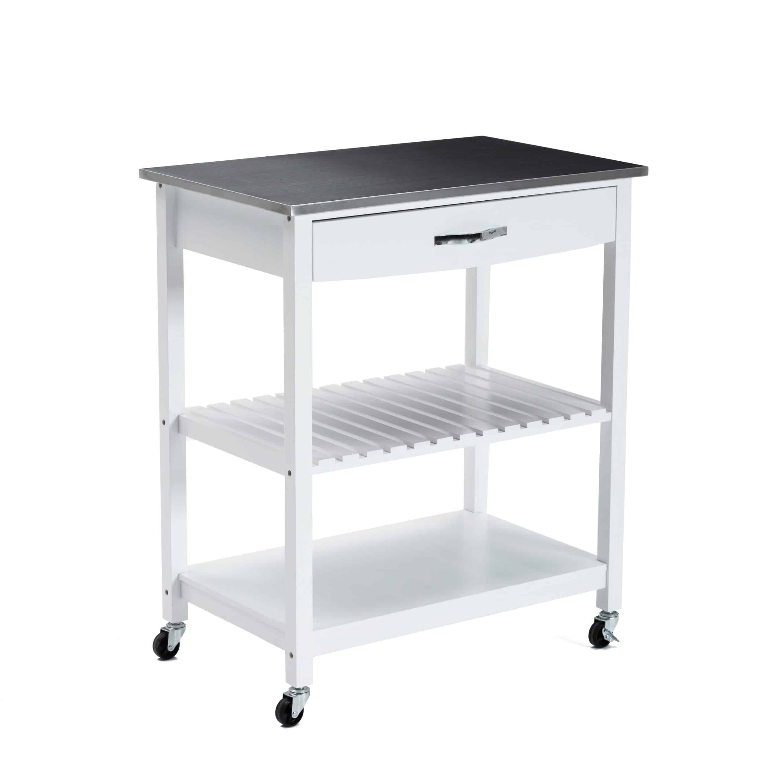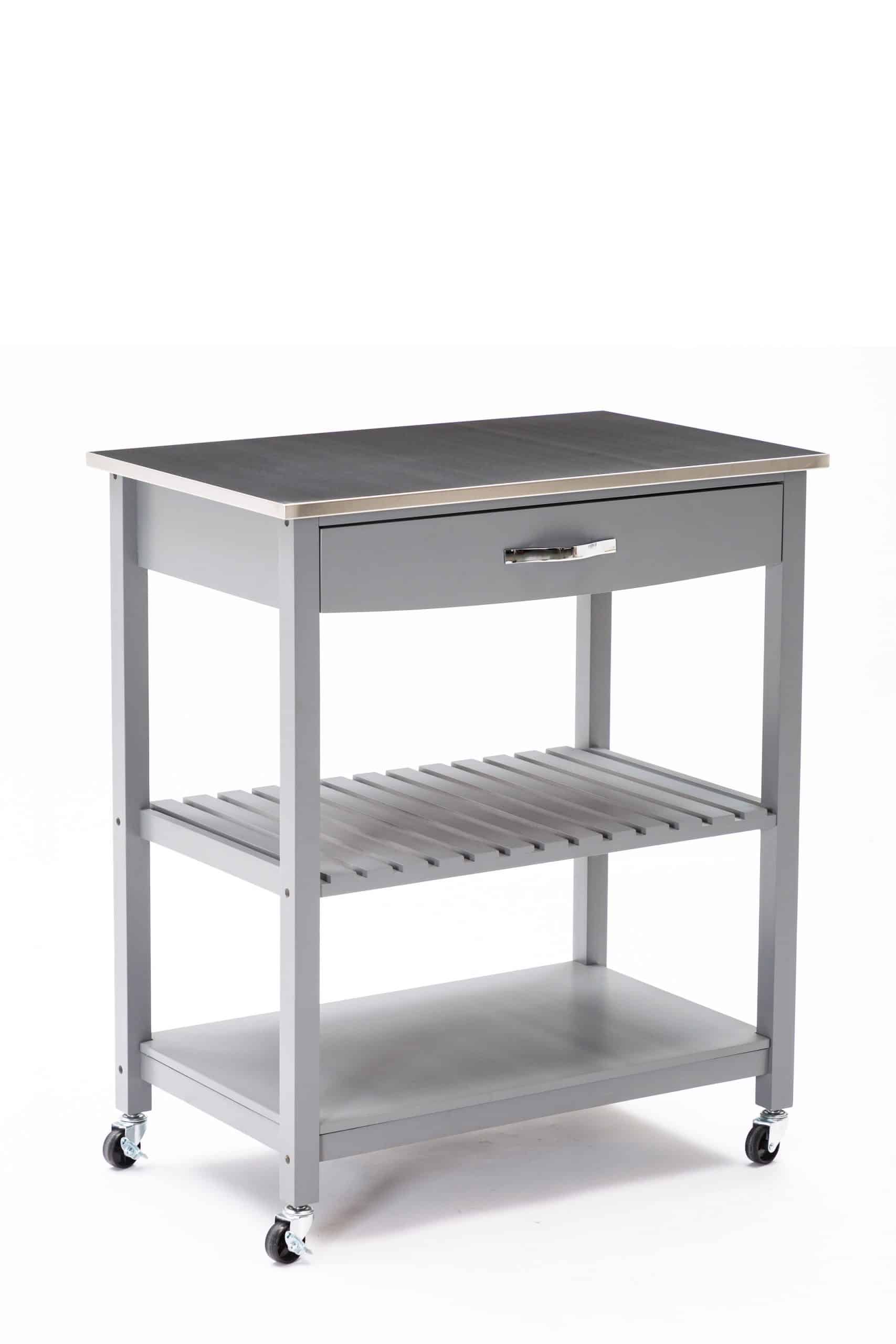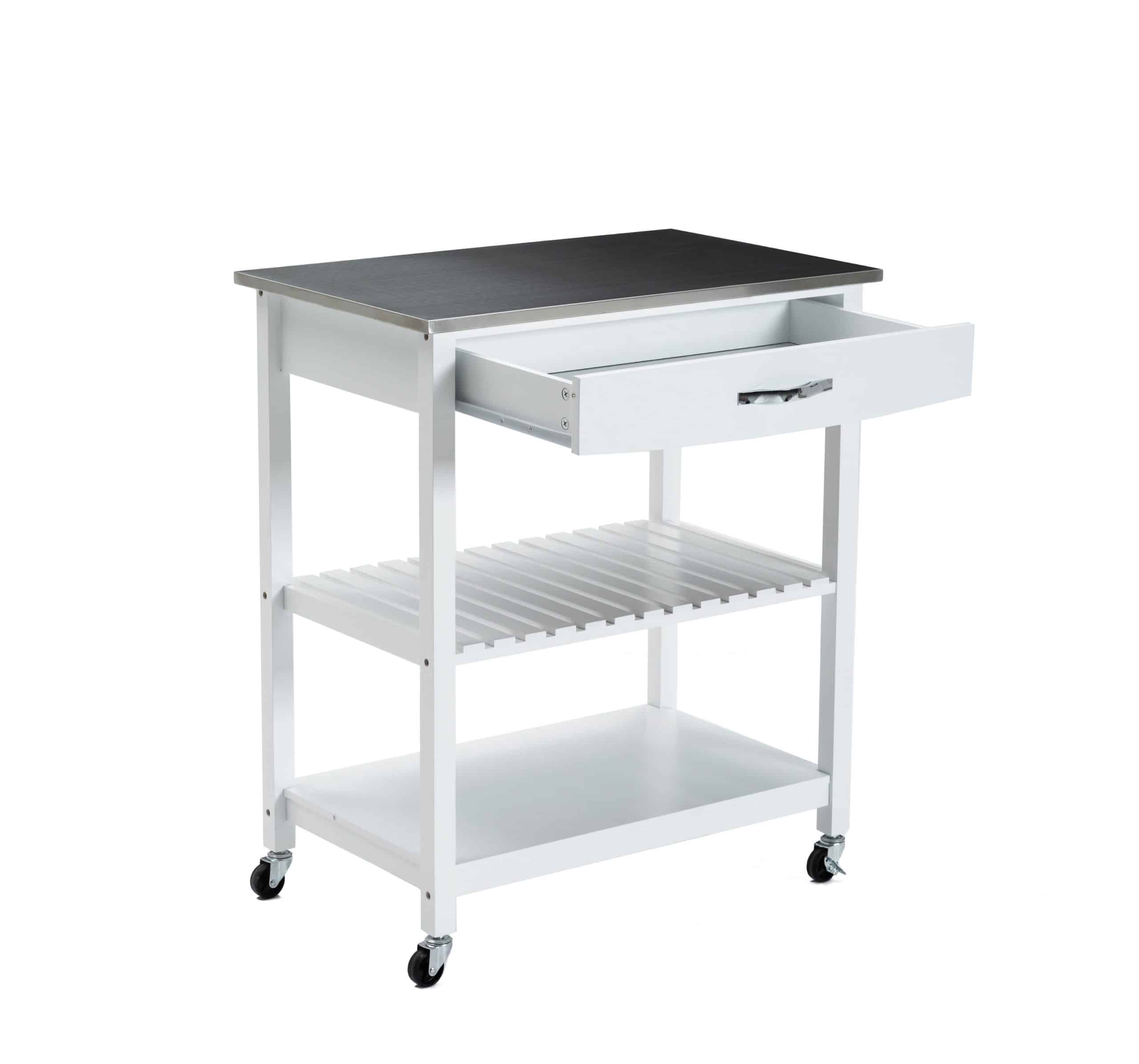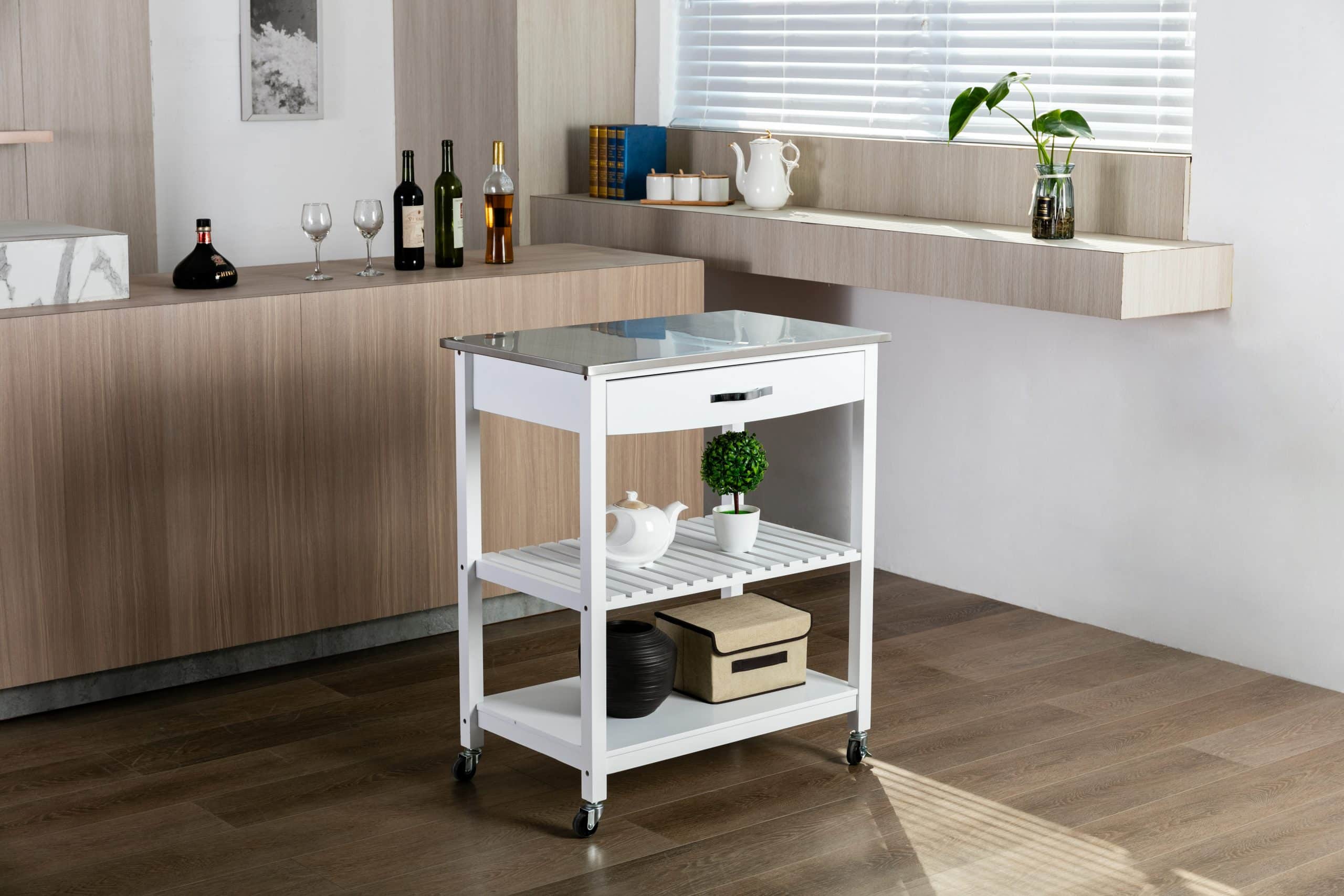 If you need a little extra storage and prep space for your kitchen, look no further than the Holland Kitchen Cart With Stainless Steel Top. This rolling kitchen cart also makes a great bar cart! Store dishes, glassware, cutlery, or your favorite spirits on the lower shelves. A slender drawer conveniently holds napkins, utensils, corkscrews, and other kitchen must-haves. Use the rolling caster wheels to roll this cart from the kitchen to the living room whenever guests are over, then wheel it back when it’s time to wash the dishes. It’s built from pine wood and medium density fiberboard with a stainless steel work surface. Available in three finishes; Gray, Navy Blue, & White. Ready for assembly upon delivery.