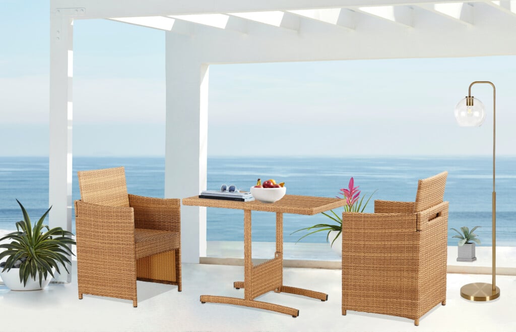 Update your outdoor patio space with our 3pc outdoor dining set that is gracious, stylish, and rich in color. The Honeymoon 3-Piece Outdoor Bistro Set features a woven texture and warm gold oak finish that compliments any outdoor setting. The rectangular rattan dining table set comes with two matching woven rattan chairs for an intimate outdoor dining experience. The Honeymoon dining chairs features foam padding seat for a relaxing, comfortable seating. Each chair backrest folds so they easily slide underneath the table, making it the perfect piece for those small patio, cozy-up-too areas. Durably designed to withstand unfavorable weather conditions, making this functional set great for your outdoor living space year-round. Whether you’re feeling sociable or want to enjoy the sunshine, this table and chair ensemble offers a comfortable place to gather.