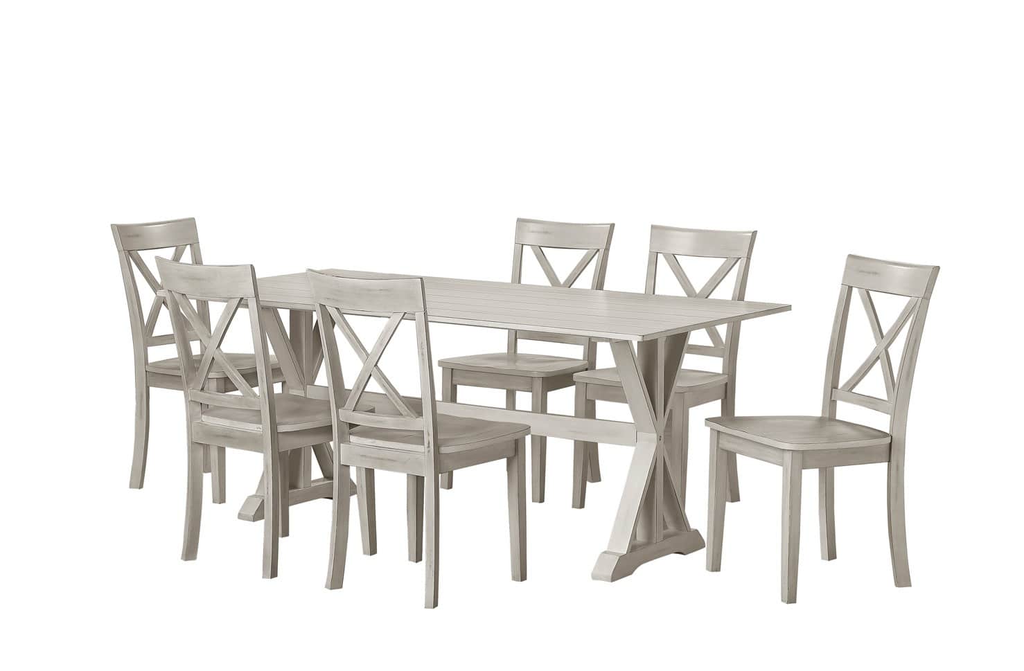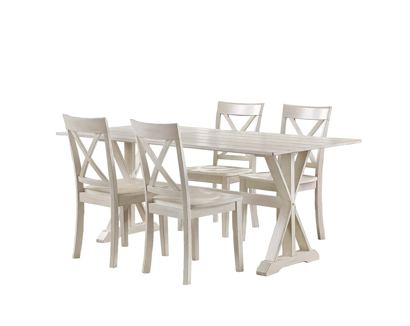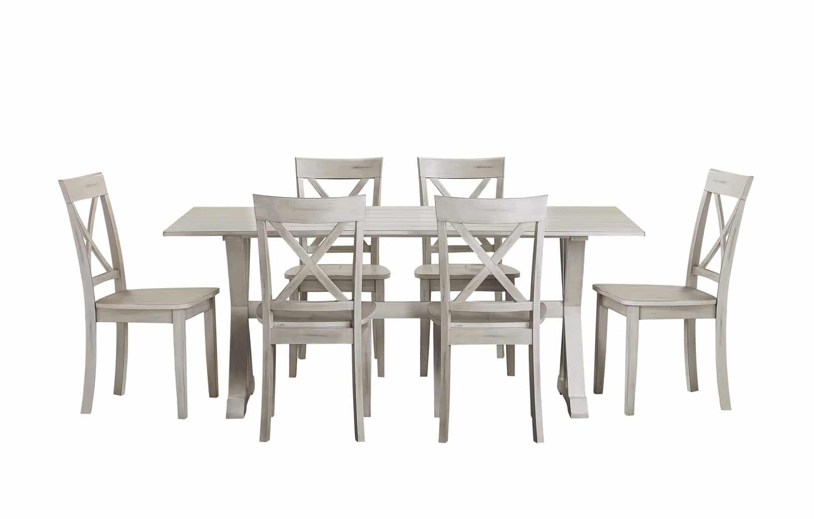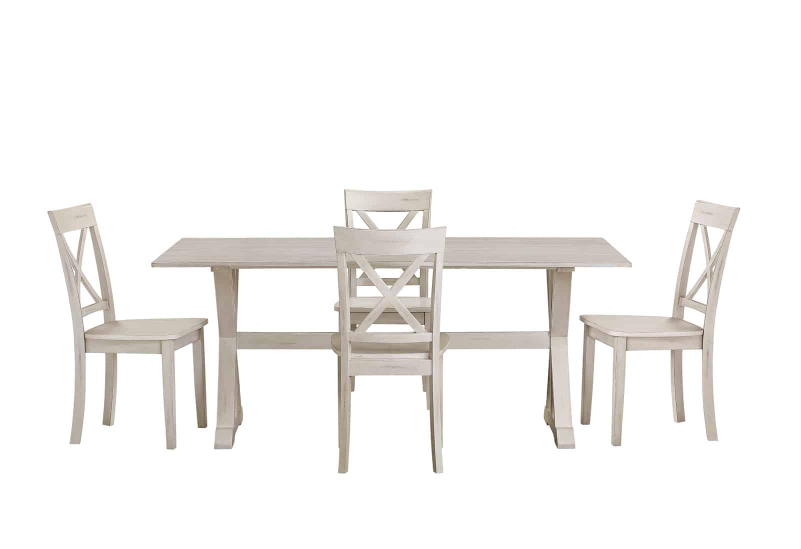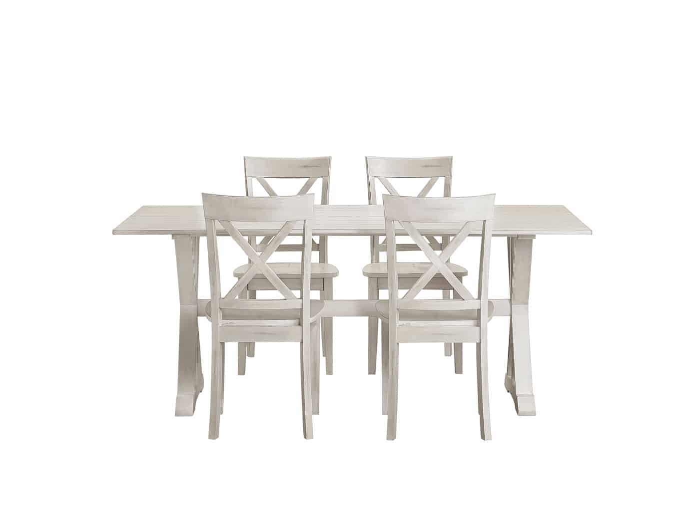 Somehow, food tastes a little better when it’s eaten around the Jamestown Dining Set. Maybe it’s the set’s farmhouse-inspired look and feel. The rustic antique white finish, the X back chairs, and the trestle-style base are all perfect examples of cottage style. All pieces are made from a combination of medium density fiberboard and solid rubberwood. Customize the Jamestown Dining Set to your needs: turn it into a 5-piece, 6-piece, or 7-piece set with any combination of our Jamestown Dining Chairs and Benches around the table.