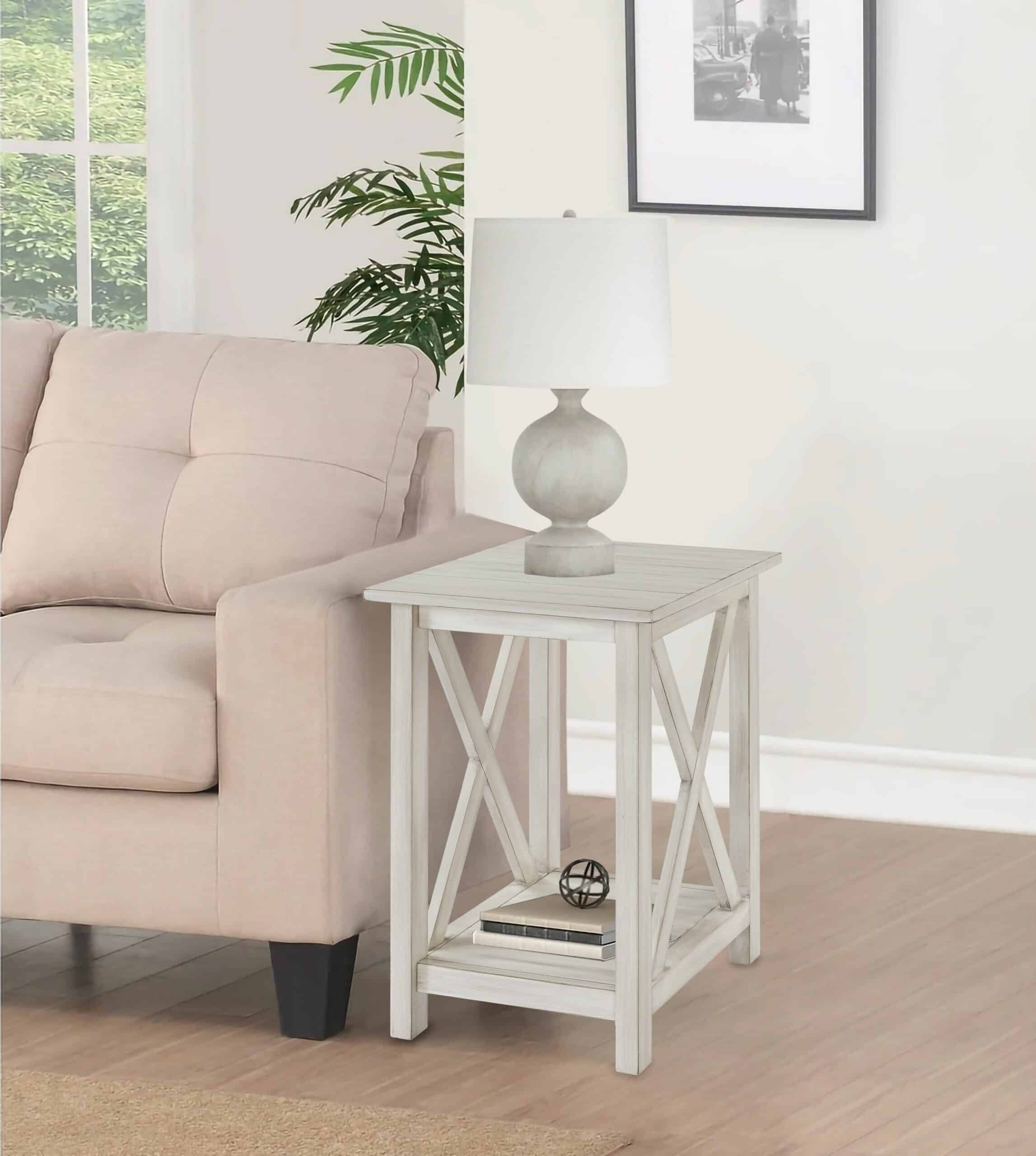 The Jamestown Side Table is a quaint addition to a living room or bedroom. It’s crafted from medium density fiberboard and solid wood. A rustic antique white finish provides the final finishing touch. This rustic side table looks great when paired with decorative greenery, colorful vases, and your favorite framed photographs. To spread the farmhouse charm all over your home, be sure to check out the other Jamestown living room and dining room furniture from Boraam.