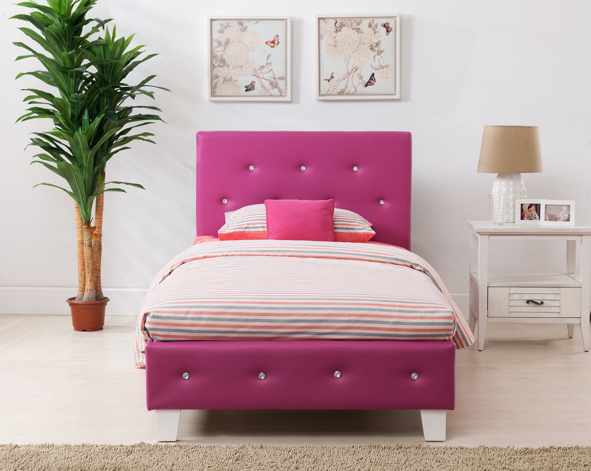 The Kelsey upholstered bed is adaptable to bedrooms of all ages. The bed comes in two sizes: twin and full. It features fashionable glass buttons on the headboard and footboard.