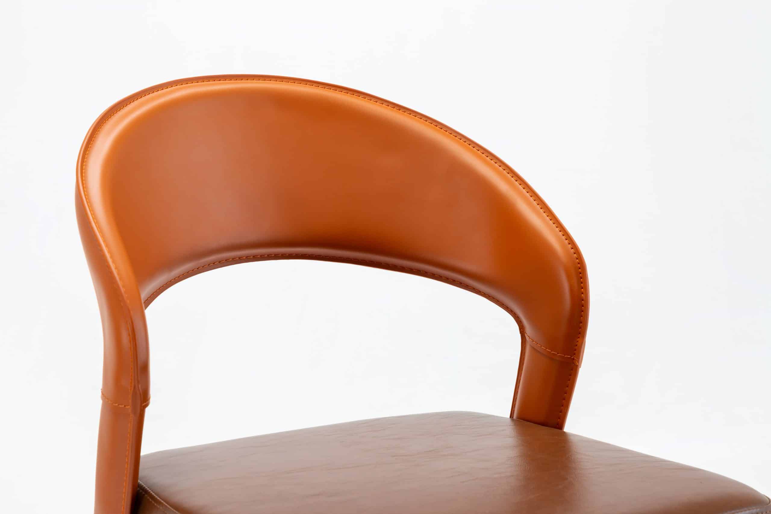 This great dining chair fits in well with any dining area. It has bonded leather PU and metal frame. It comes in a brown black and orange color. This item is a dining height chair. This item comes out of China.