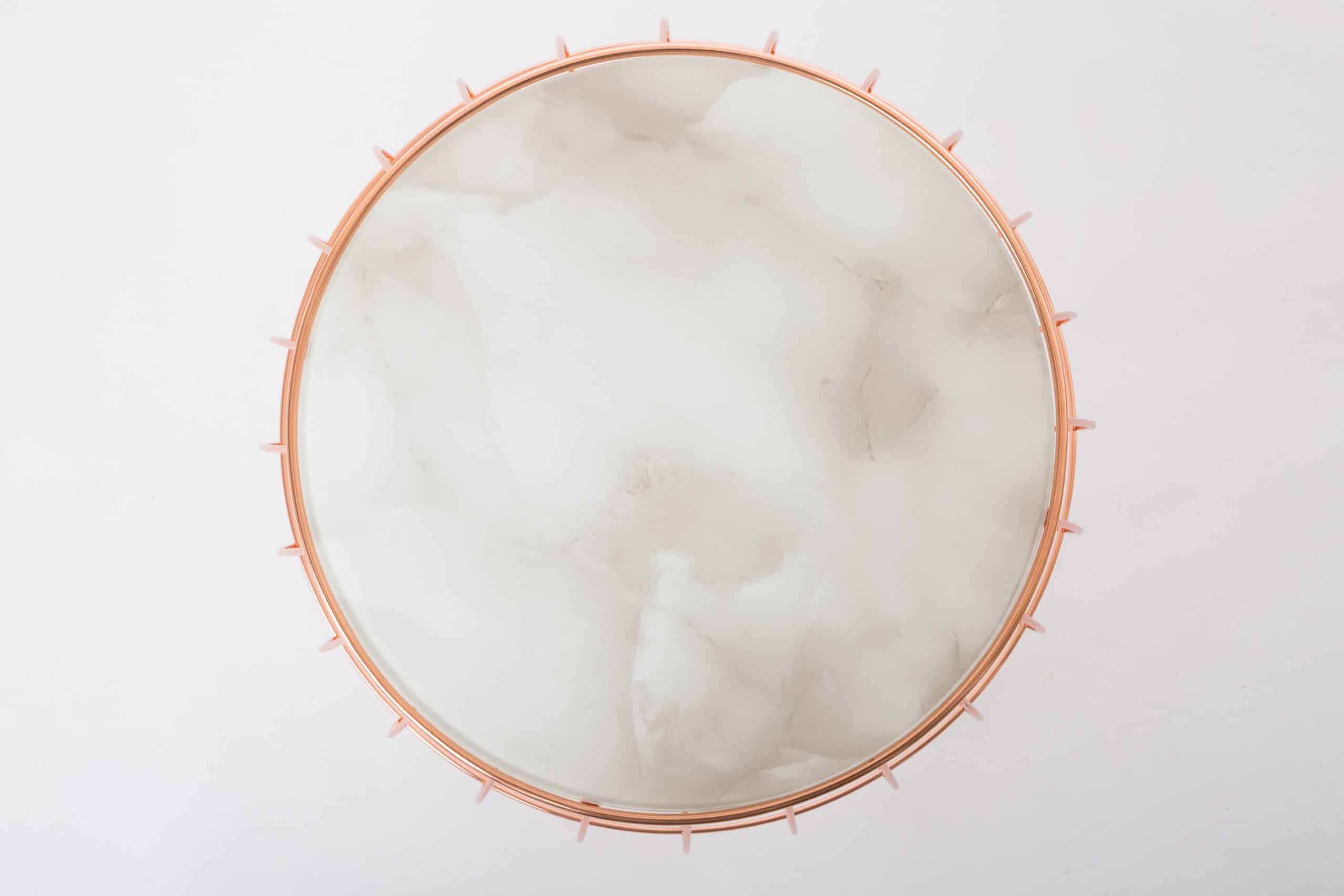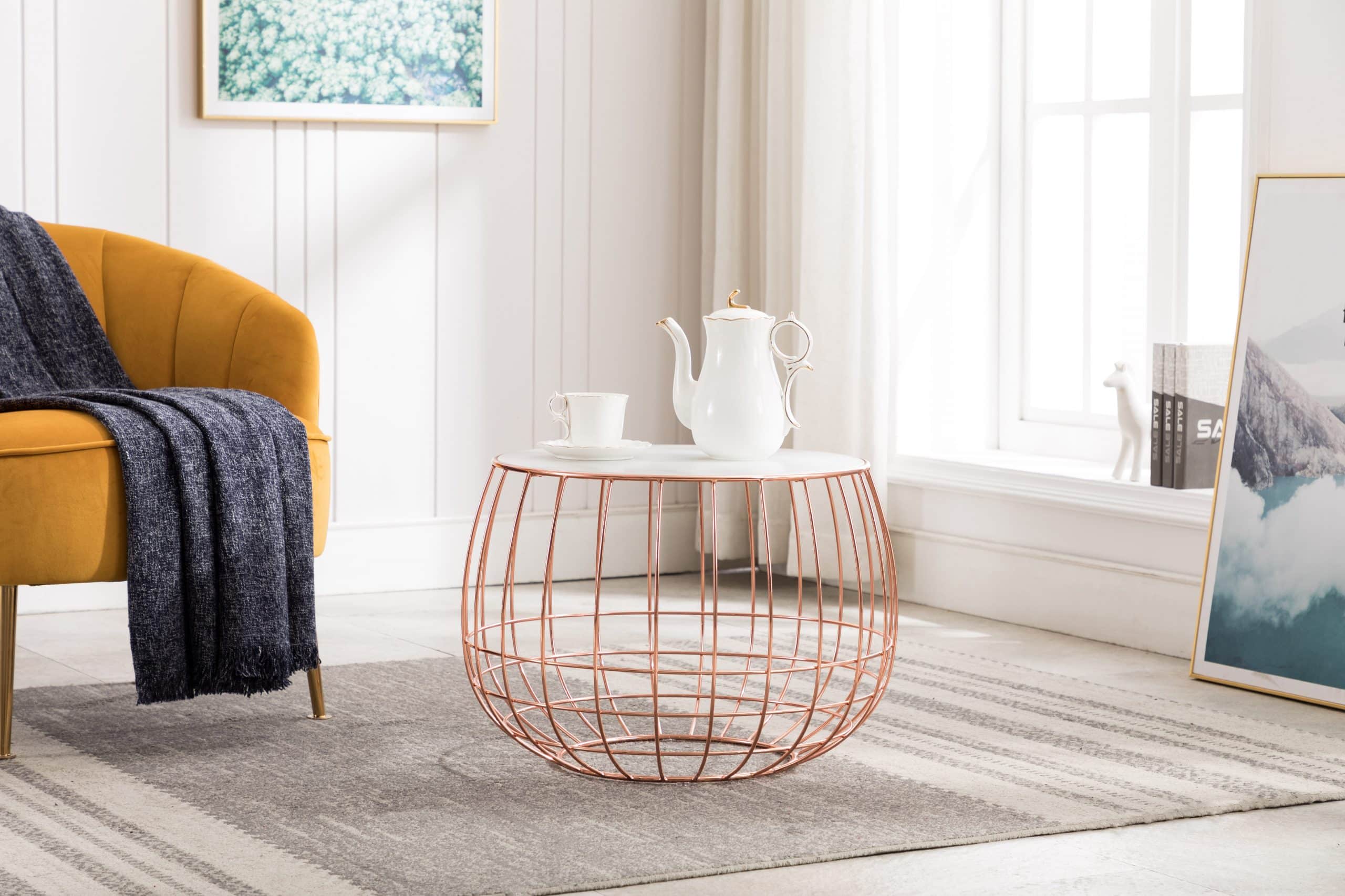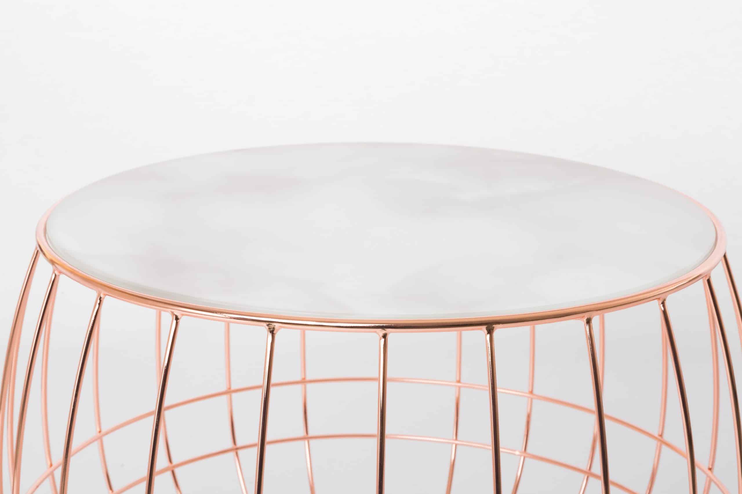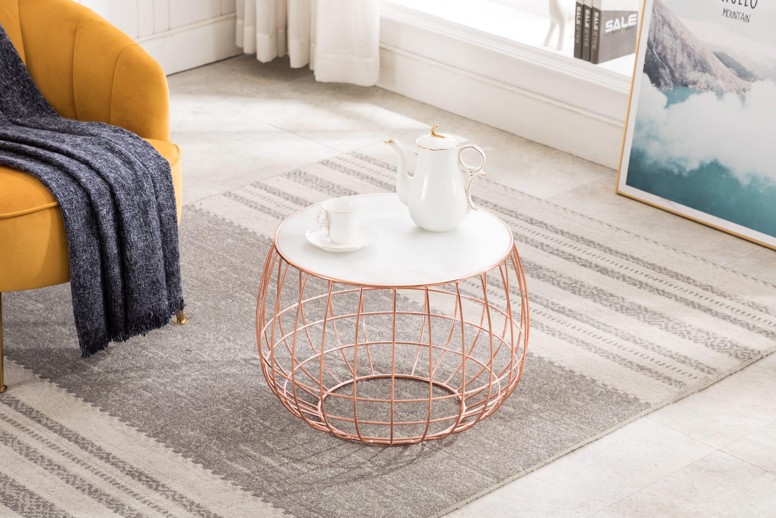 This beautiful side table has tempered glass with imitation marble surface effect. It has a metal base with electric plating metal frame, perfect for your living room. This item comes in a rose gold finish with a White Faux marble top. This item comes out of China.