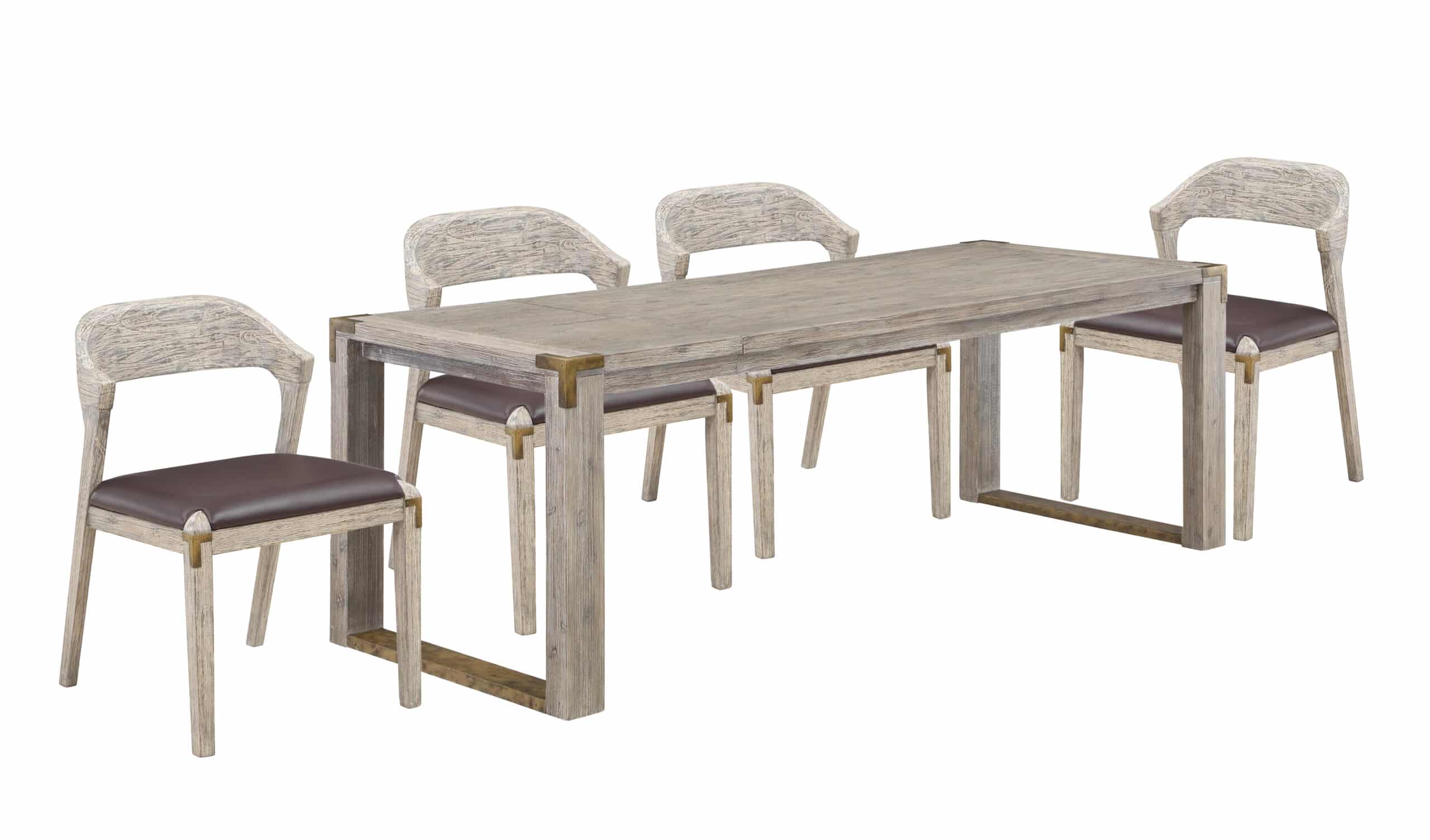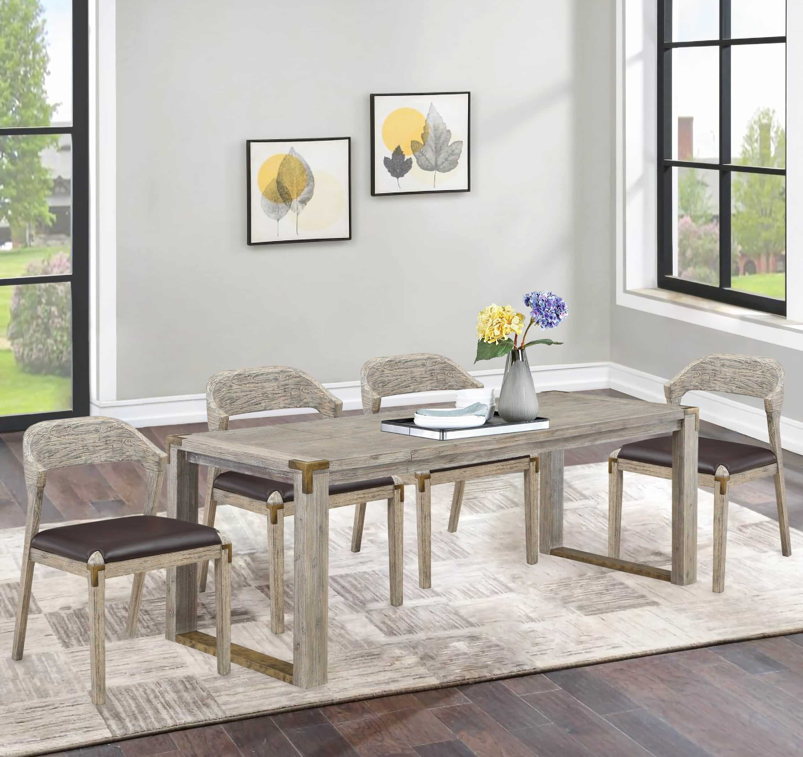 Make a dynamic statement with the Boraam 5-piece Montana Dining Room Set. The set is available with several different combinations of our dining table, bench, and dining chairs. The table and chairs are constructed with solid Acacia wood. The chairs are also upholstered with high-density foam wrapped in plush brown faux leather upholstered seat. This 5-piece set is available in our new Light Barnwood Wire-Brush finish. The light barnwood finish and Burnished metal accents will bring a warm energy to your home. The dining table has a 15.75” drop leaf extending the table to 88.5 inches, seating up-to 8 guests comfortably. This set is ready for assembly upon delivery with all tools and hardware included.