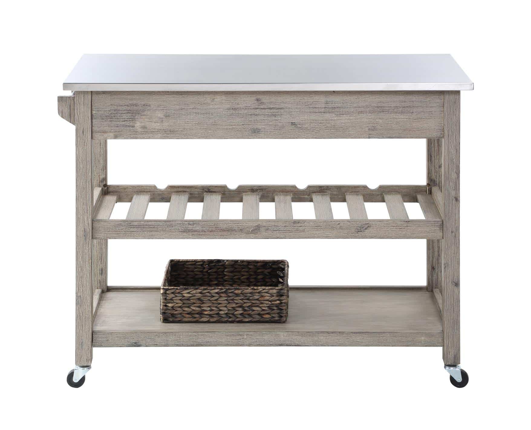 Your kitchen’s new best friend, the Montana Kitchen Cart offers versatility in an attractive rustic package. Built from acacia wood, the wood features a Grey Wire-Brush finish that highlights the wood grain. A perfect food prep area, the stainless-steel countertop -increase the size of your work surface. Storage features include an open lower shelf and two drawers, plus an adjustable wine rack capable of holding four bottles. This kitchen cart also includes a storage basket, made from woven water hyacinth. The basket measures 14.17 x 11 x 4.33 inches. Complete your dining room or kitchen with the matching Montana Dining Table and Montana Dining Chairs (both sold separately).