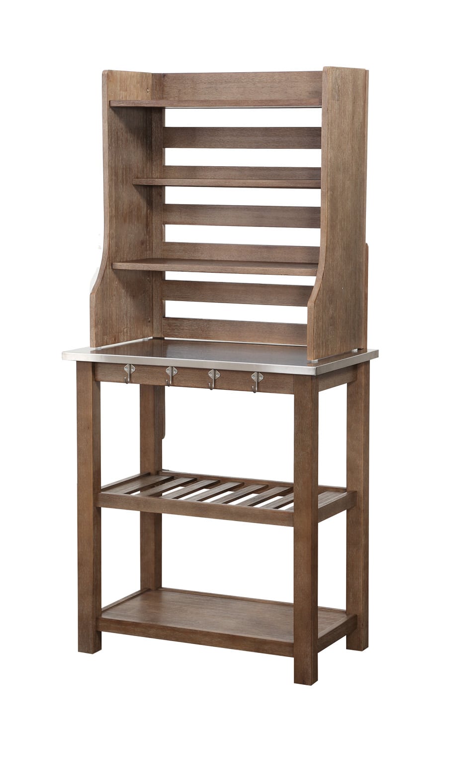 Made from mixed materials, our Napa Baker’s Rack looks just as at home in an industrial loft as it does in a rustic cottage. With its array of shelving and other storage features, this rack is an all-in-one storage solution and food prep station for any kitchen. The stainless steel top and hanging hooks give the piece additional functionality, so you can actually prepare food on the surface and easily clean it up. Its solid rubberwood construction has the added bonus of being made from an environmentally friendly wood. The baker’s rack comes in a multistep wire-brushed finish which adds to the piece’s versatile, rugged looks.