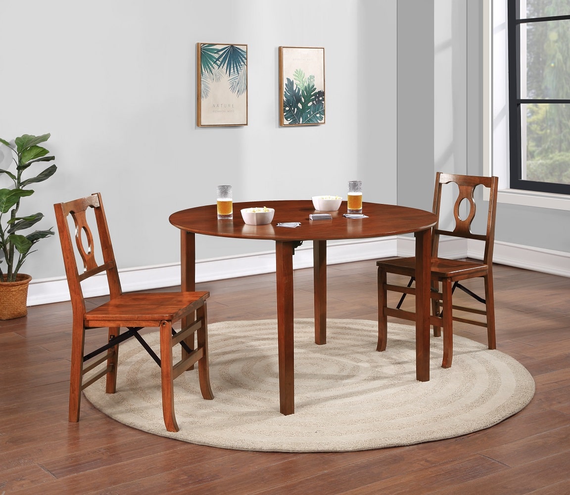 Stylish seating with the convenience of the Boraam Napoleon folding dining chairs. This folding dining chair adds warmth and elegance to your dining or entertaining space. The rubberwood frame features a rich cherry finish. Front and rear supports provide extra strength and stability. The Napoleon folding chair features an open keyhole style backrest for breathable open seating. Whether you are having some friends over to play some bridge or poker or expecting family for a holiday feast it is always nice to have some extra seating available. Features steel folding mechanism, it’s easy to pullout these chairs to make additional seating for extra company. When done using these chairs, simply fold flat for convenient, compact storage. Pair the Napoleon folding dining chairs with the Boraam Eliot gaming folding table to complete your space.