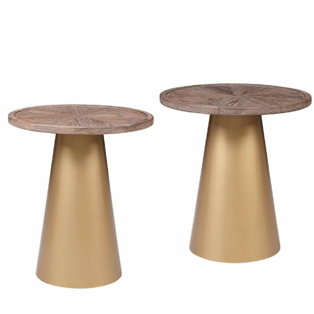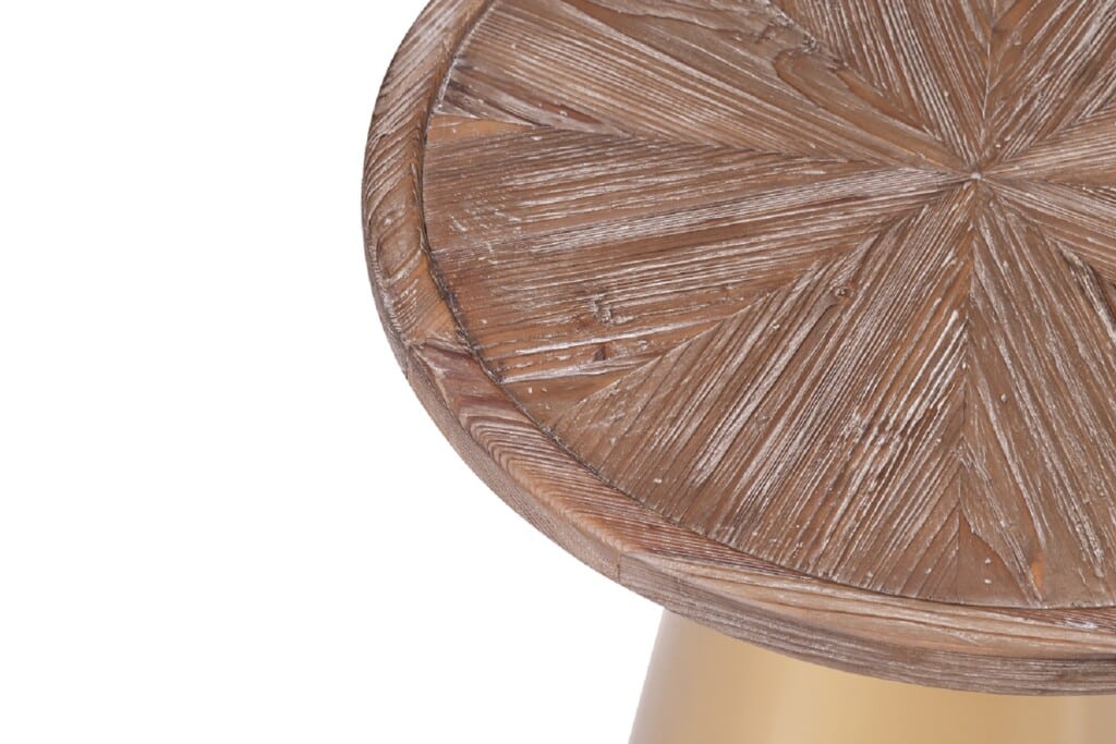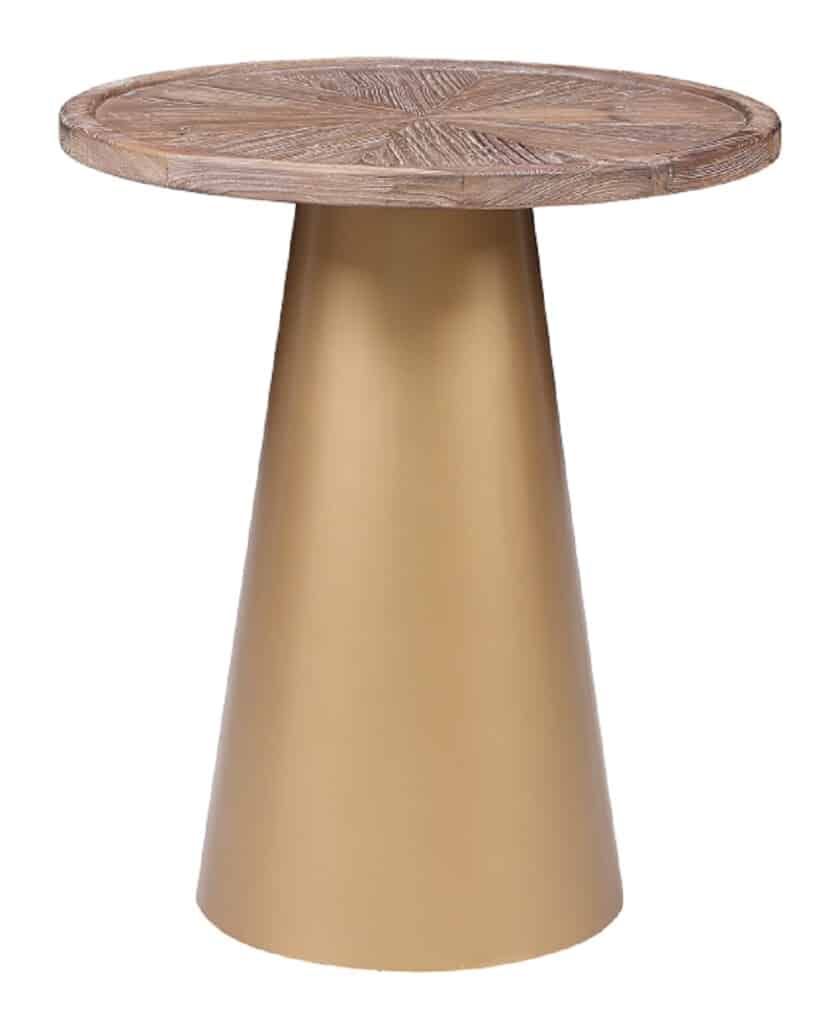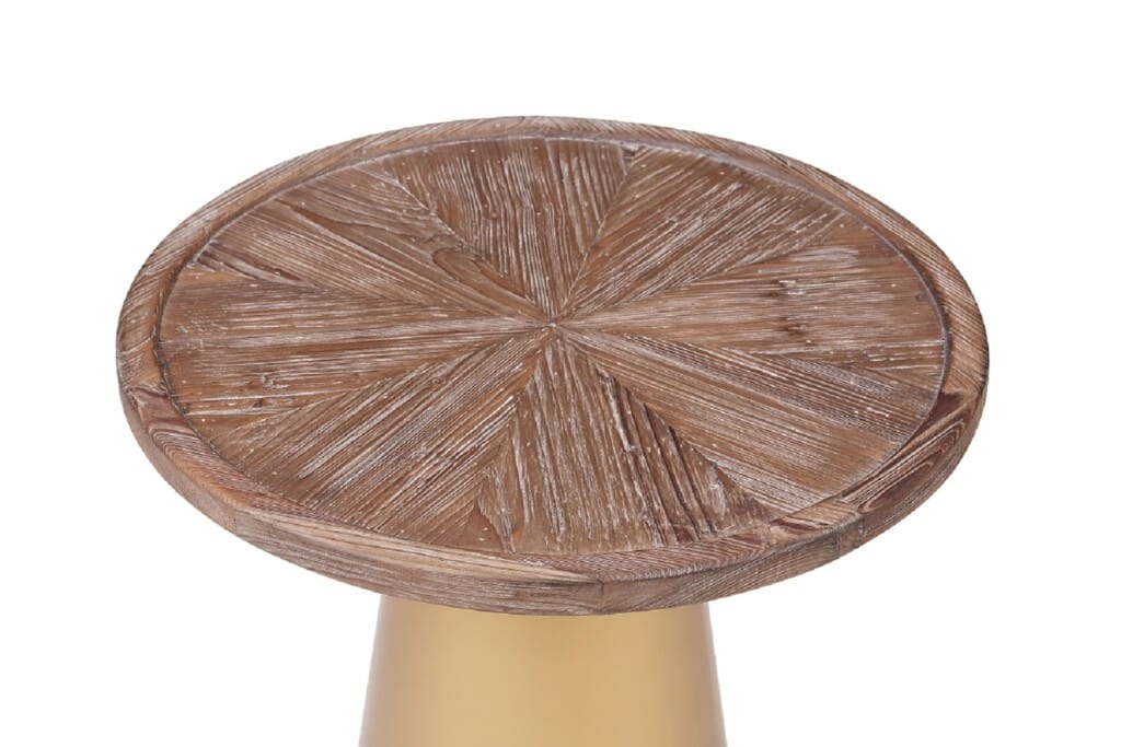 Bring your living space to life with these bold Mid-century Patrick Accent Tables. Featuring a conical pedestal metal base that is finished in a brilliant gold plating which contrasts perfectly with the Coffee Brushed finish of the reclaimed pine wood top. The Patricks’ round shape makes these tables versatile, so it can be used in virtually any room in your house, including the living room, bedroom, family room, den, or home office. Crafted from kiln-dried reclaimed pine wood with a brushed finish that highlights the natural wood grain variation. Top this compact round table with decor, a reading lamp, and your stack of must-reads.