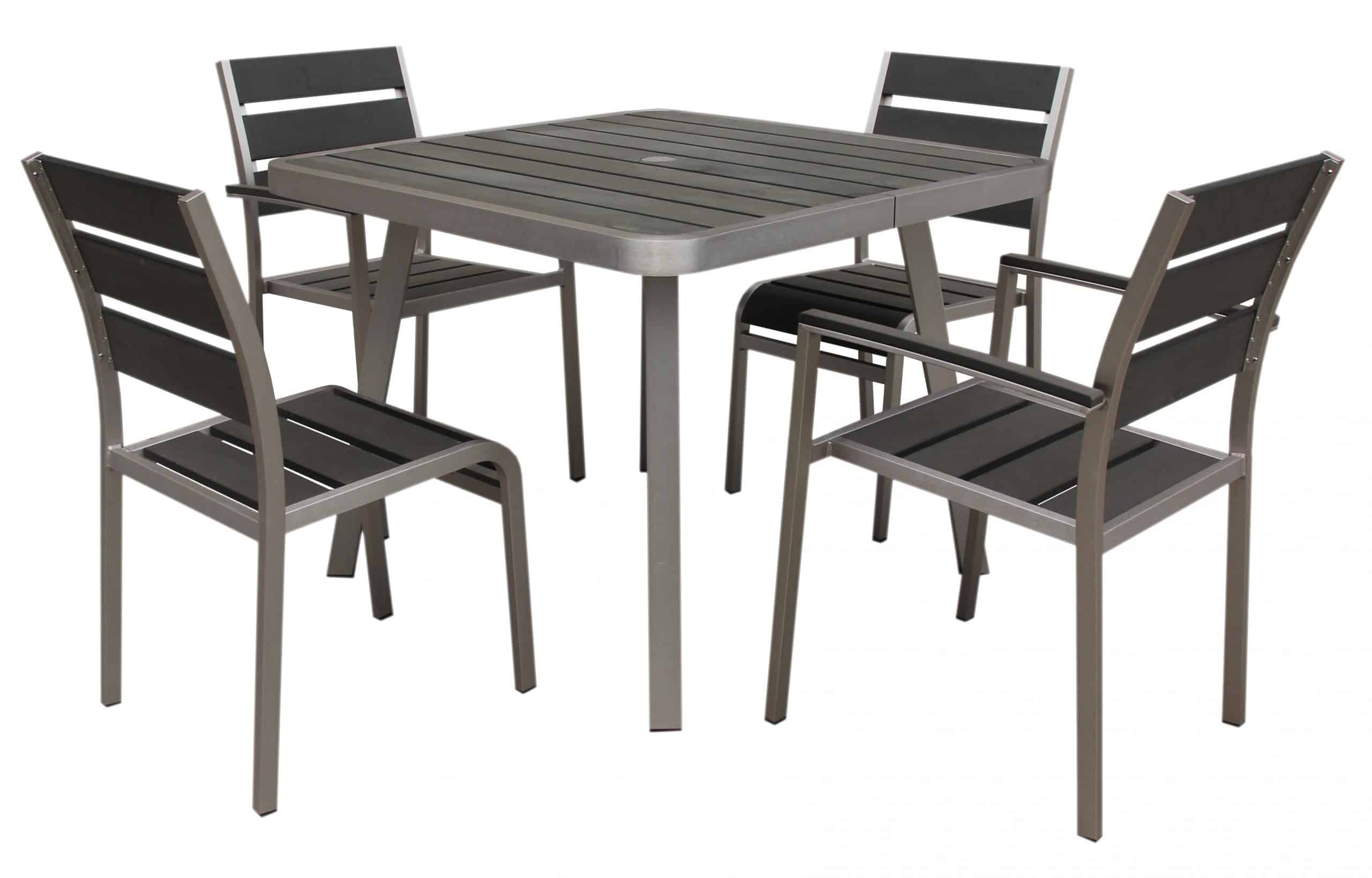Time to refresh your indoor or outdoor living space with the new Santorini Five Piece Dining Set from Boraams Polylumber line. The Santorini set includes the Fresca Square Dining Table and two Captains chairs and two side chairs. The dining table constructed with an Aluminum frame and high density polyethylene and features a pluggable umbrella hole. The chairs are also constructed of Aluminum and polylumber and conveniently stackable. Contrast to outdoor wood furniture, Polylumber is environmentally friendly, low maintenance and resistant to heat and water. The Fresca is naturally immune to corrosion, durable and light weight. The table and the chairs are finished in a Gray stain Polylumber finish, brushed Aluminum and stainless steel hardware. Make sure to pick up your Santorini Dining Set today!